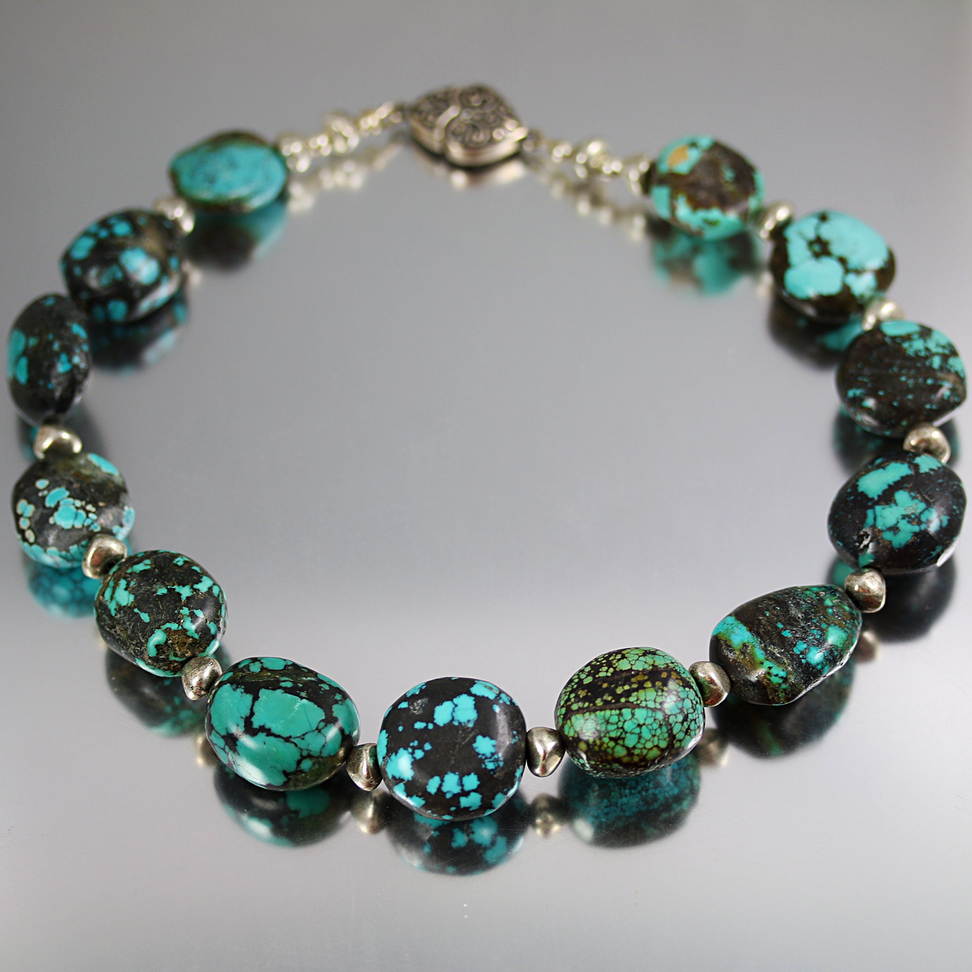 At the back of the necklace, a decorative sterling magnetic clasp provides a secure closure and adds a touch of luxury to the piece. The sterling silver clasp is not only functional but also serves as a beautiful accent that complements the turquoise nuggets and silver beads perfectly.