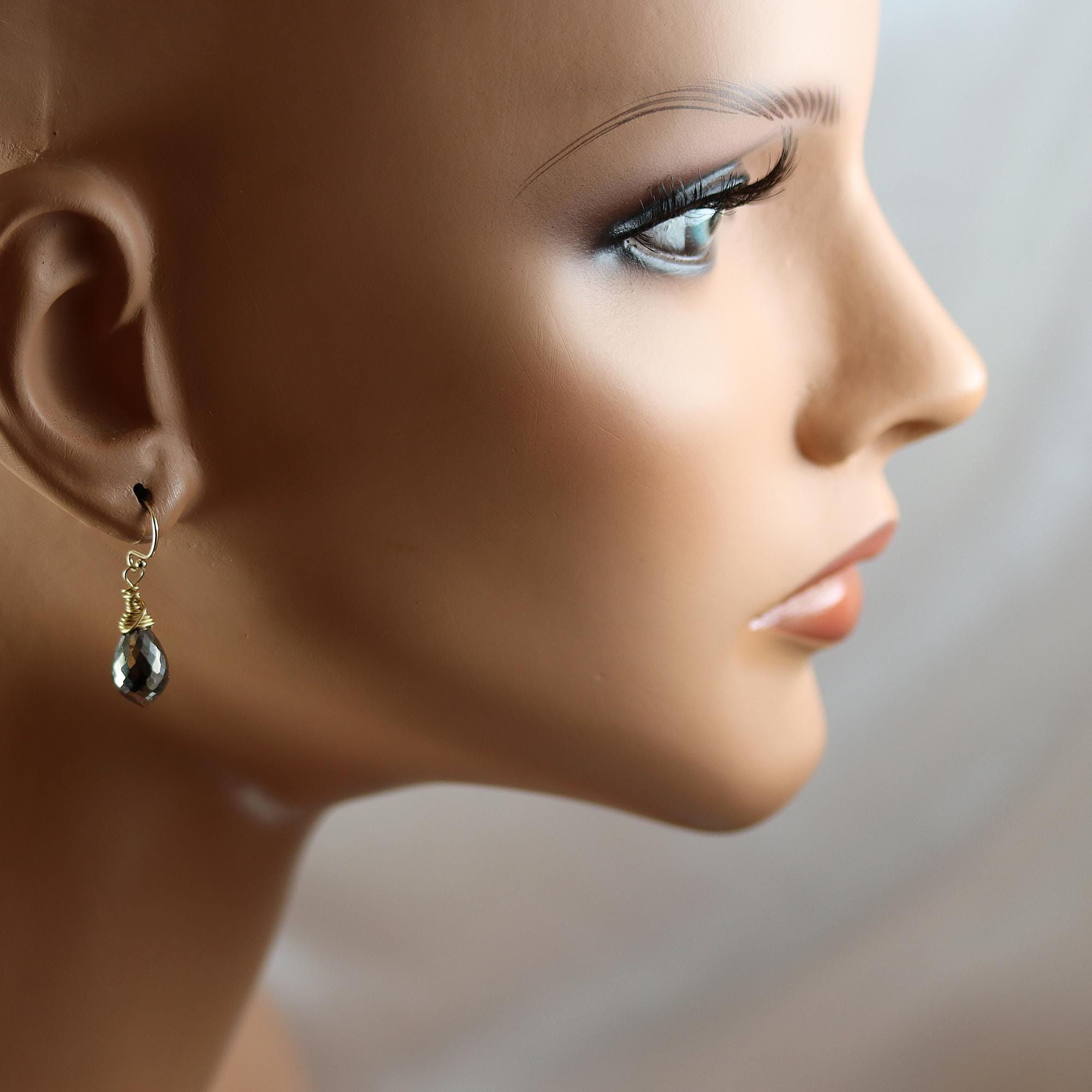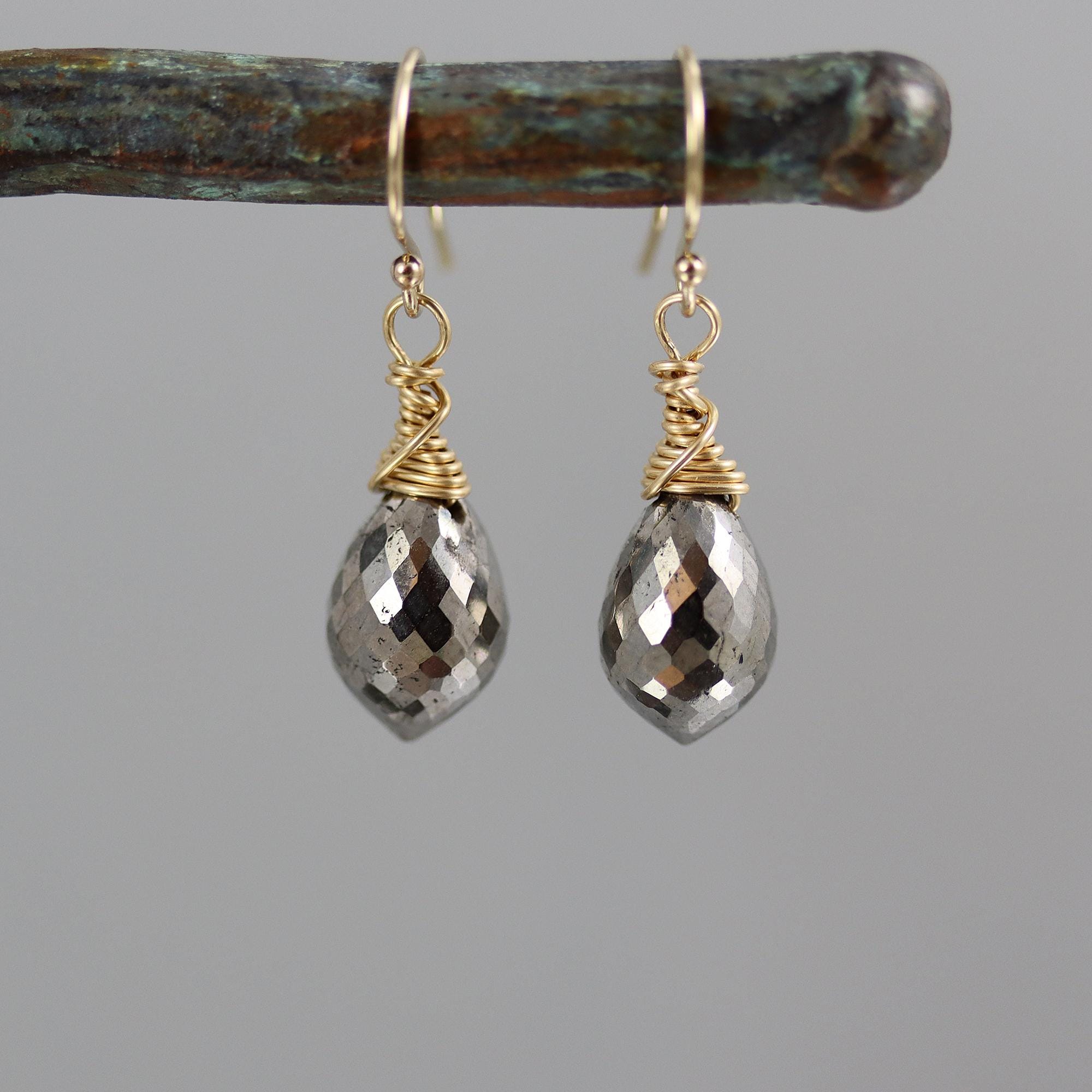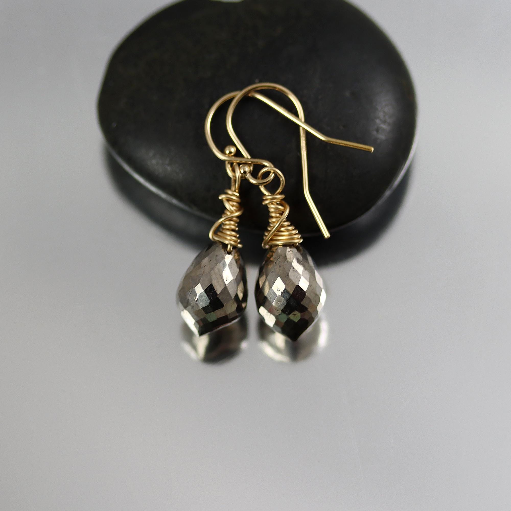 Beautiful classy Pyrite chandelier briolettes are wrapped in gold fill wire and dangle from gold fill french ear wires. From the top of the ear wires to the bottom of the stones measures 1-1/4 inches.