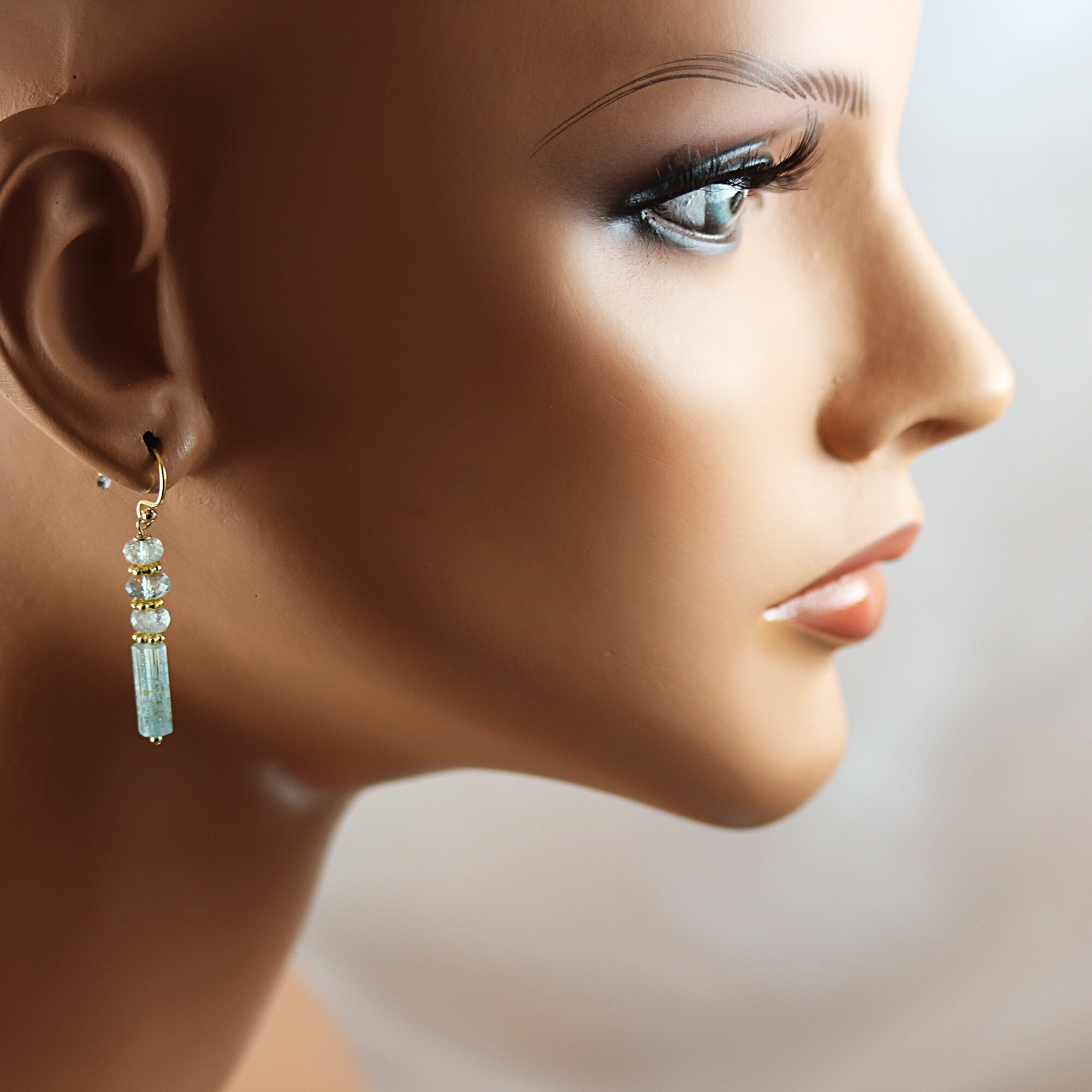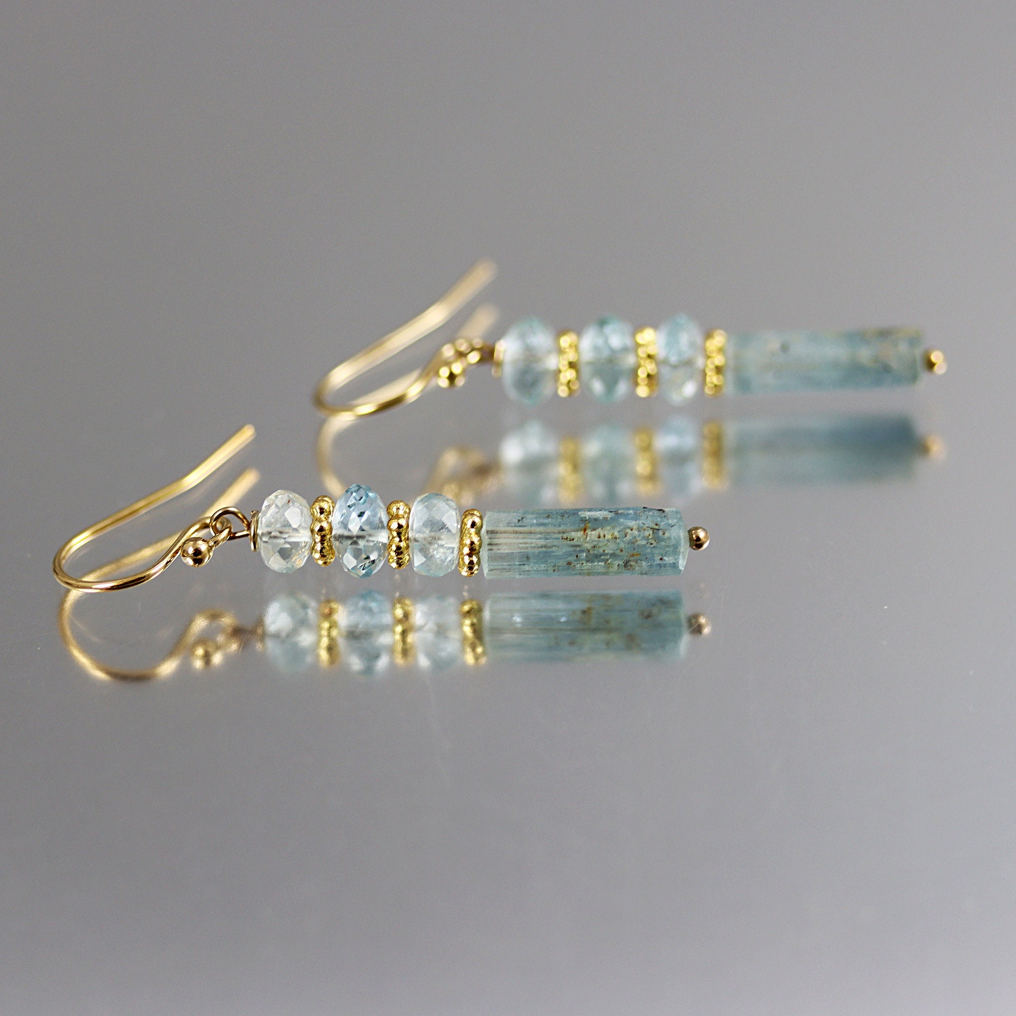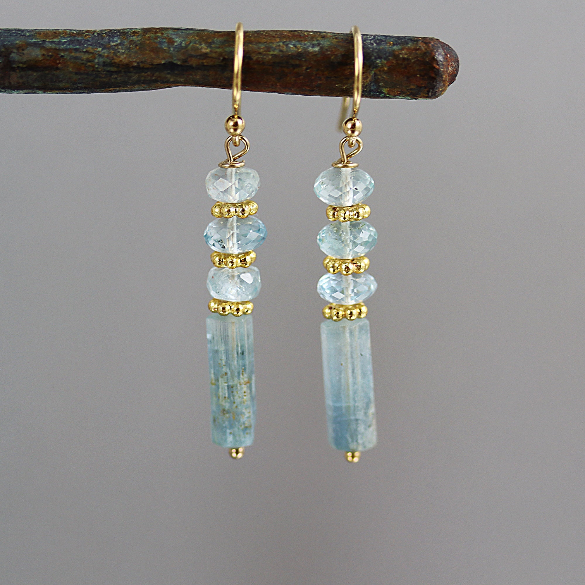 Beautiful icy blue bicolor Aquamarine crystals dangle below 3 faceted rondelles of Aquamarine, spaced with gold vermeil. The ear wires are gold fill french ear wires. From the top of the ear wires to the bottom of the stones measures a touch over 1-1/2 inches.