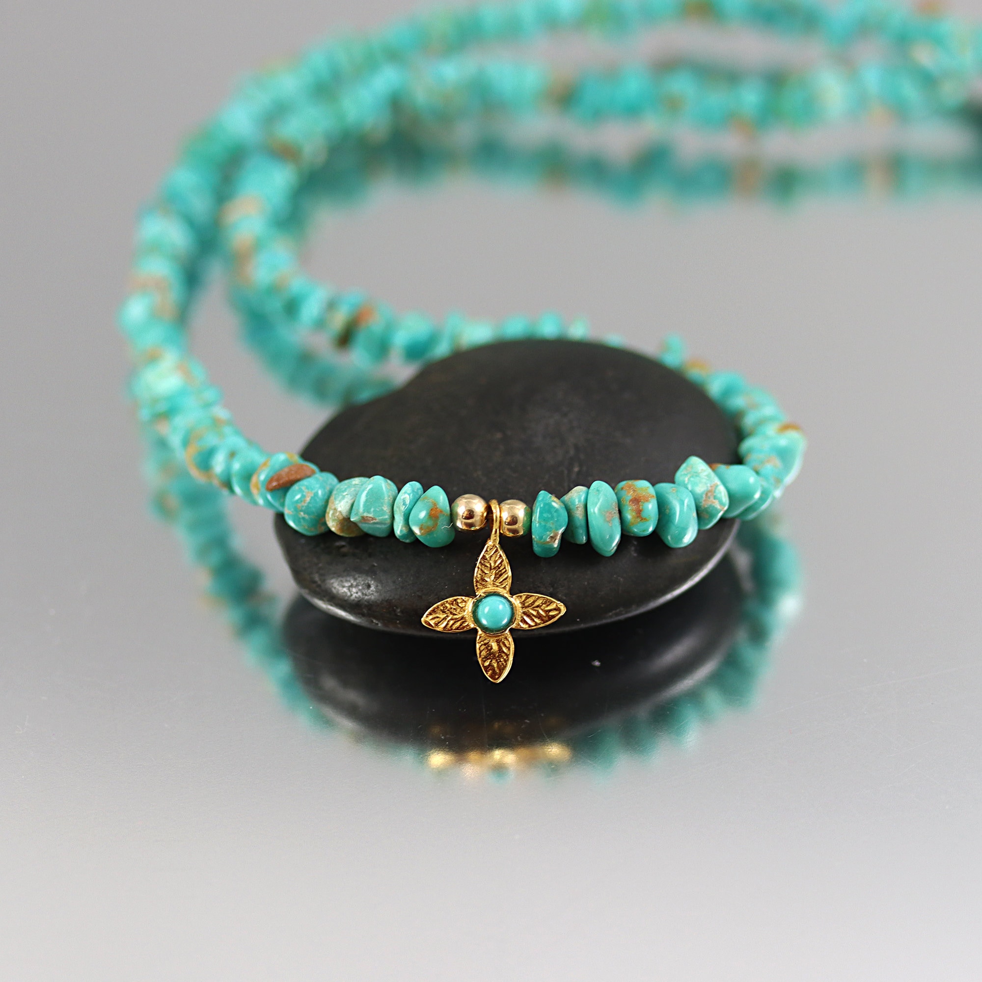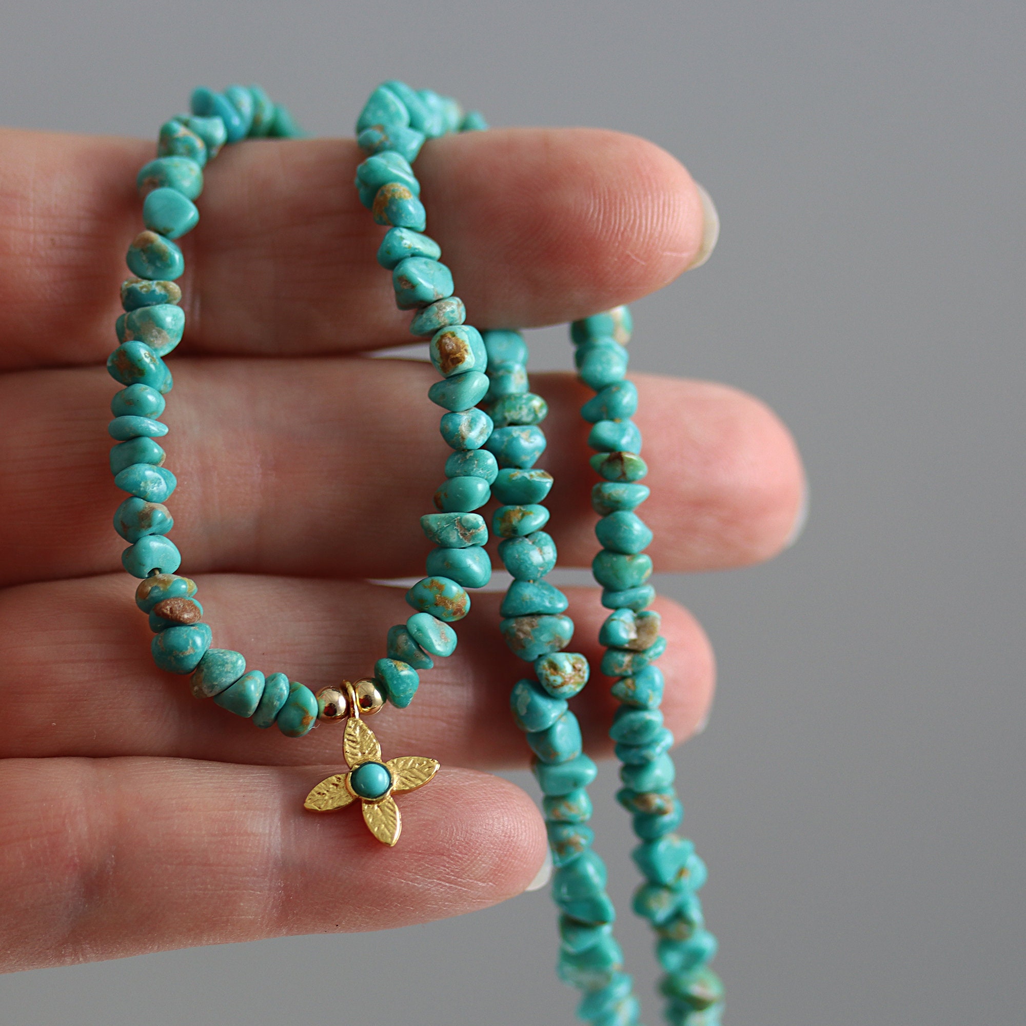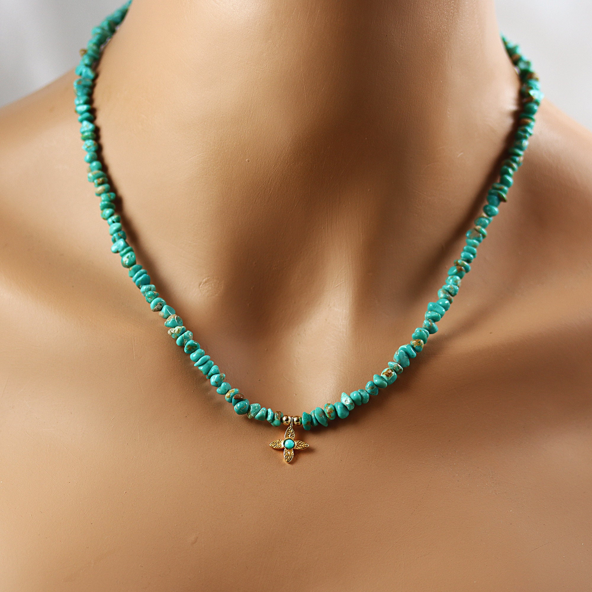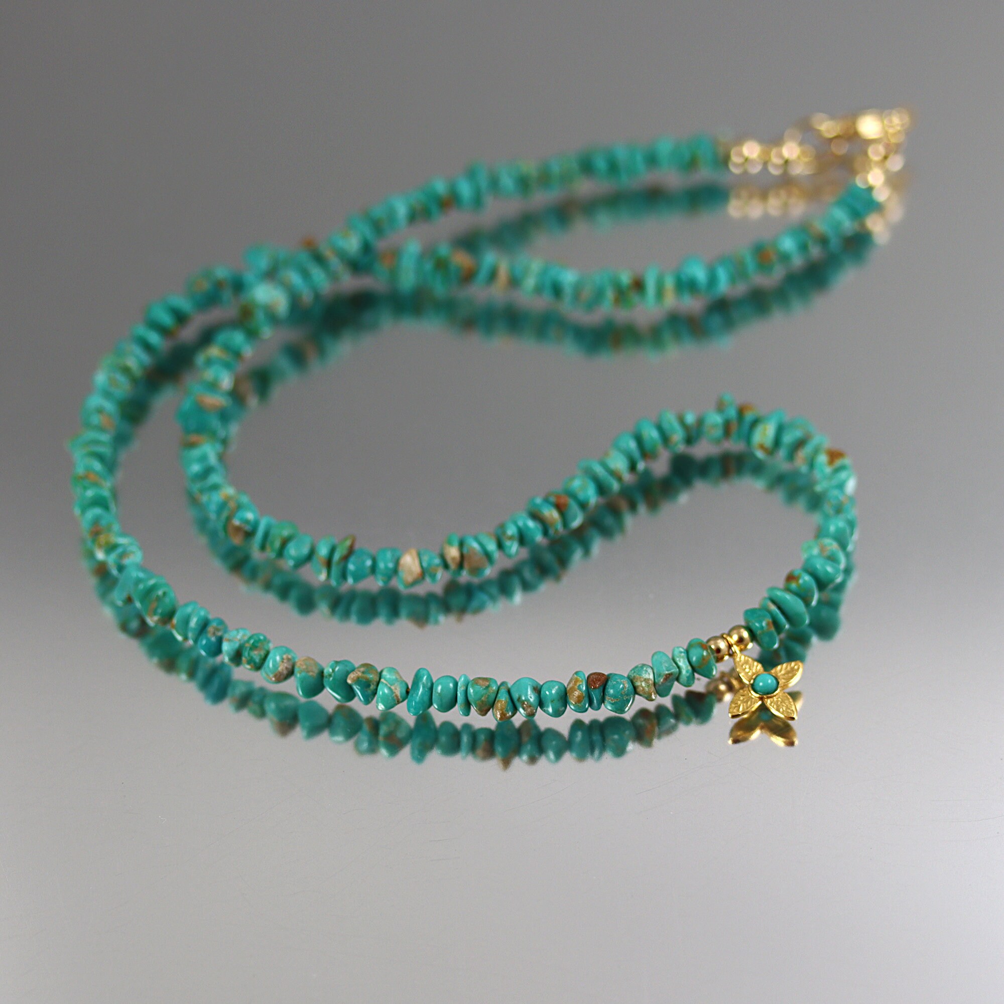 Lovely blue-green Turquoise nuggets make up the necklace. Dangling at the center is a gold vermeil star with a central Turquoise cab. The necklace ends in a gold fill lobster clasp and is 17-3/4 inches long.