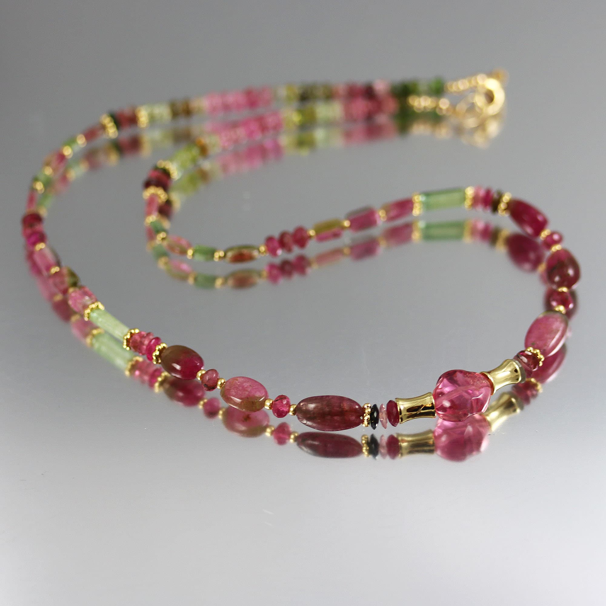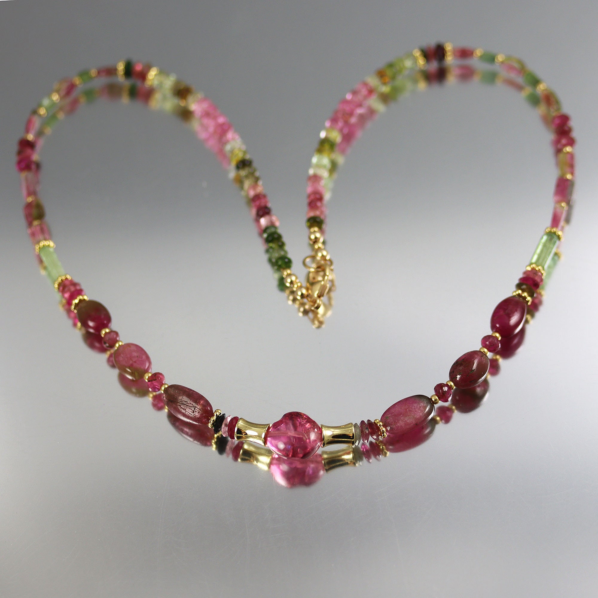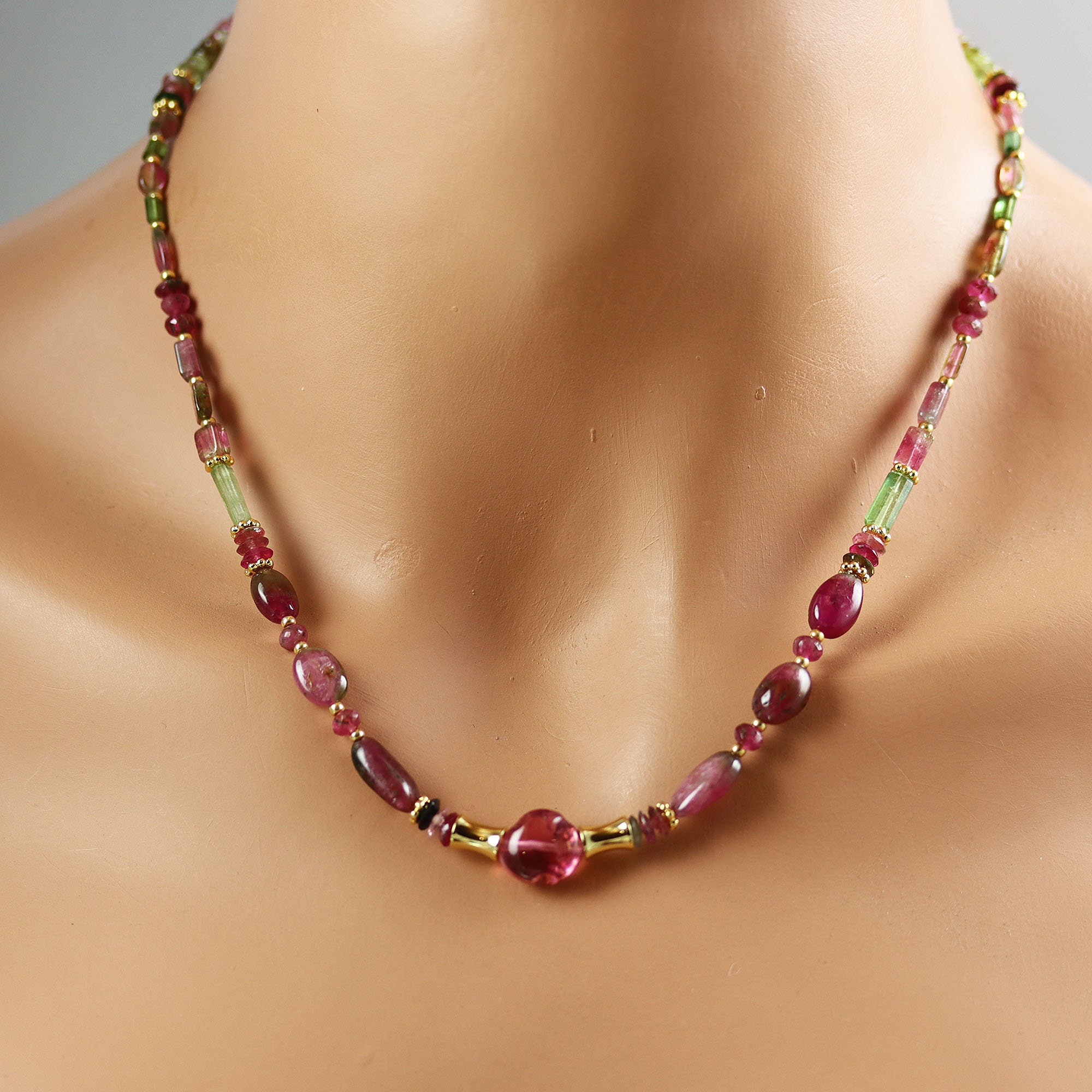 This stunning Tourmaline necklace features a delightful blend of shapes and colors. It showcases Tourmaline rondelles, rectangles, oval nuggets, tubes, and discs intertwined with watermelon and multi-colored tourmaline stones. The centerpiece boasts a superbly transparent nugget of Rubellite Tourmaline from old stock. Measuring 18 inches in length, the necklace is finished with a gold fill lobster clasp. Each gem used is of exceptional quality.