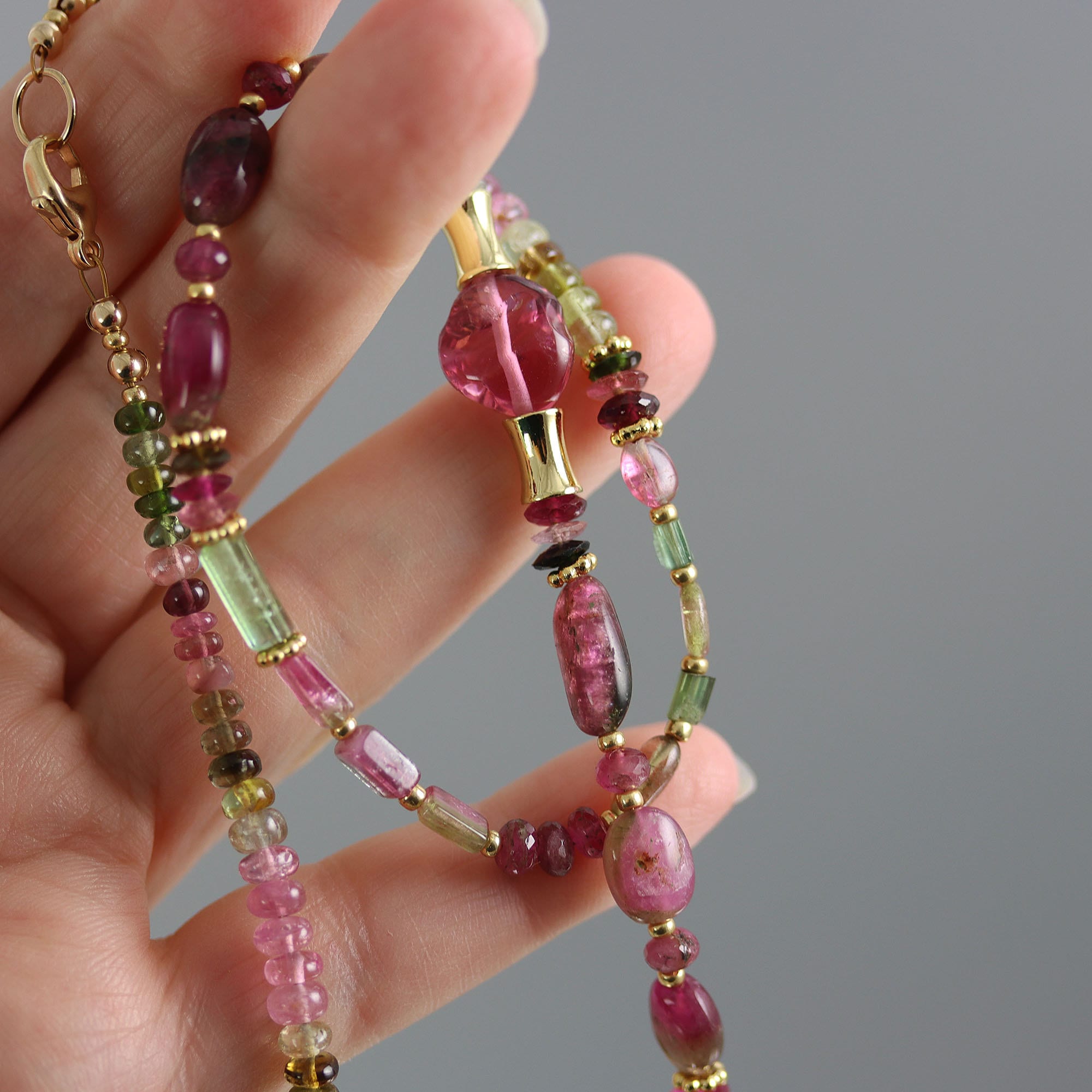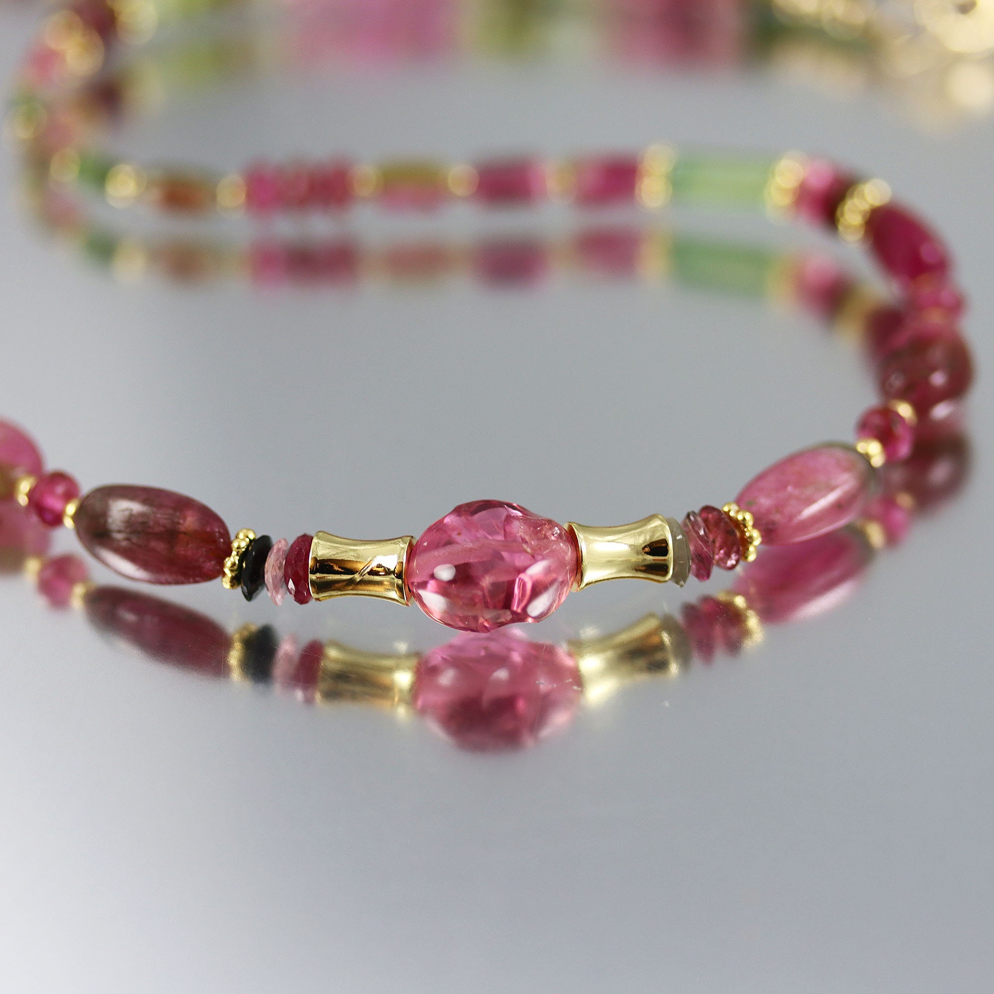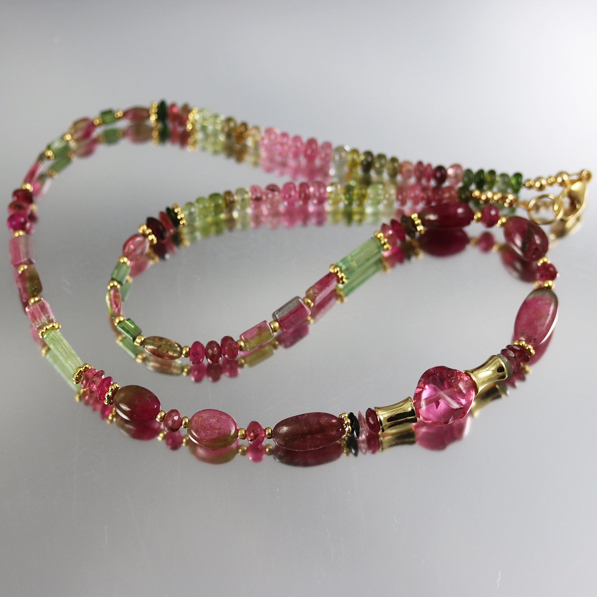 This stunning Tourmaline necklace features a delightful blend of shapes and colors. It showcases Tourmaline rondelles, rectangles, oval nuggets, tubes, and discs intertwined with watermelon and multi-colored tourmaline stones. The centerpiece boasts a superbly transparent nugget of Rubellite Tourmaline from old stock. Measuring 18 inches in length, the necklace is finished with a gold fill lobster clasp. Each gem used is of exceptional quality.