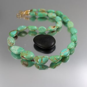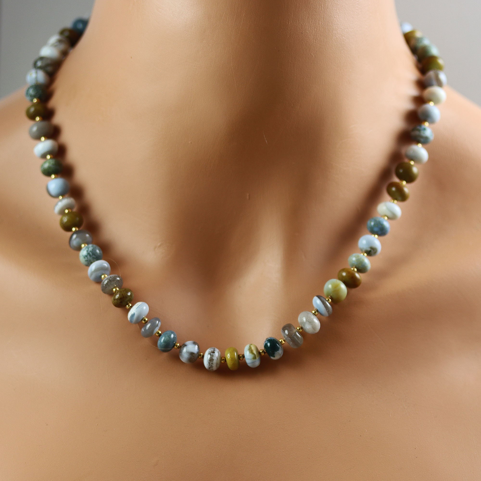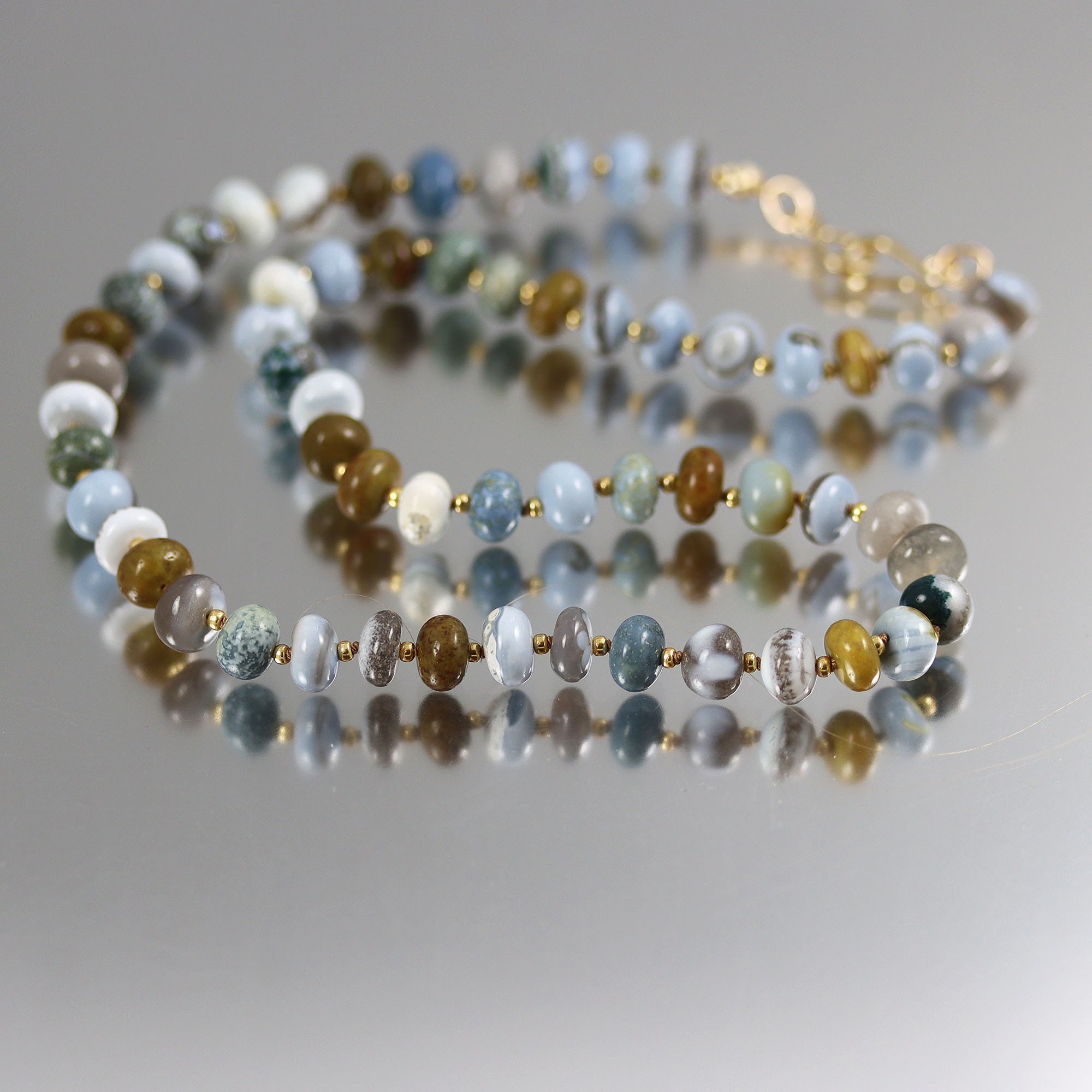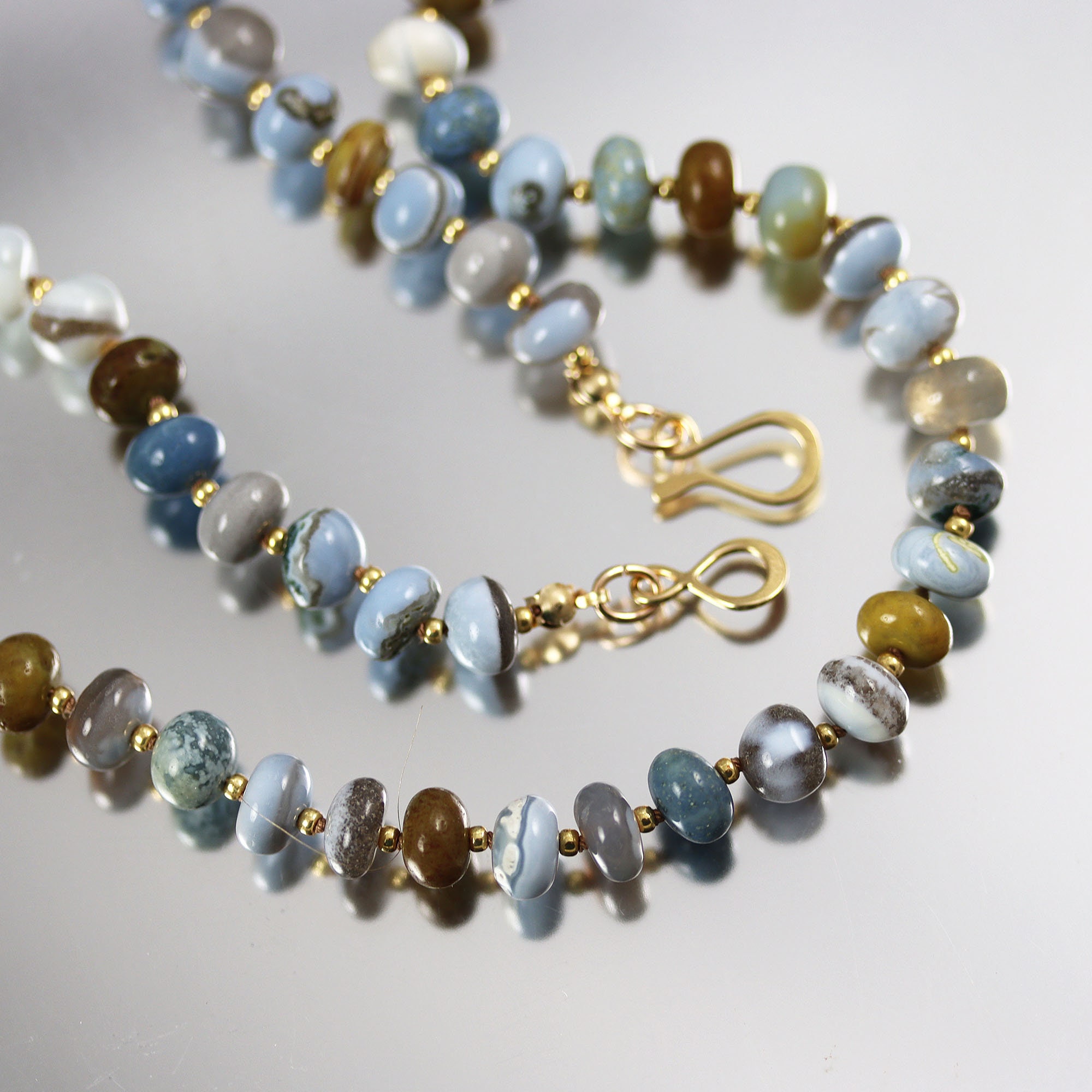 This knotted necklace is a stunning display of natural beauty with boulder opal rondelles in shades of baby blue and brown. The rondelles are knotted along the length of the necklace, creating a sense of fluidity and movement. The knots not only serve a practical purpose by securing the gemstones in place but also add a touch of texture and visual interest to the design.