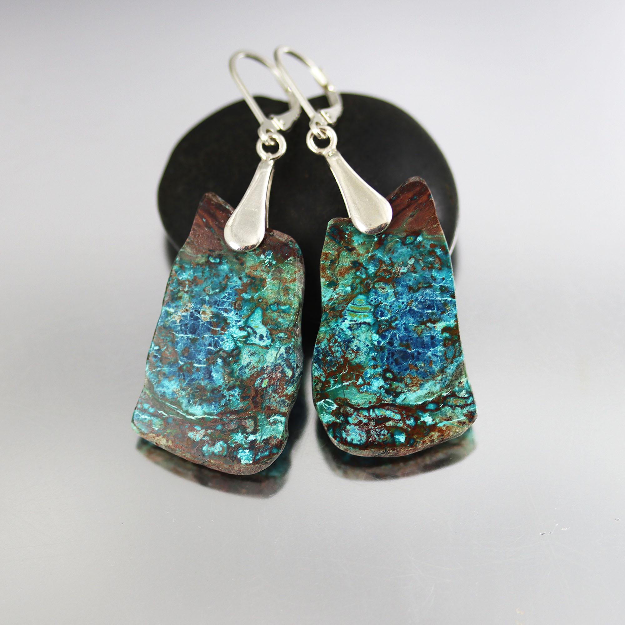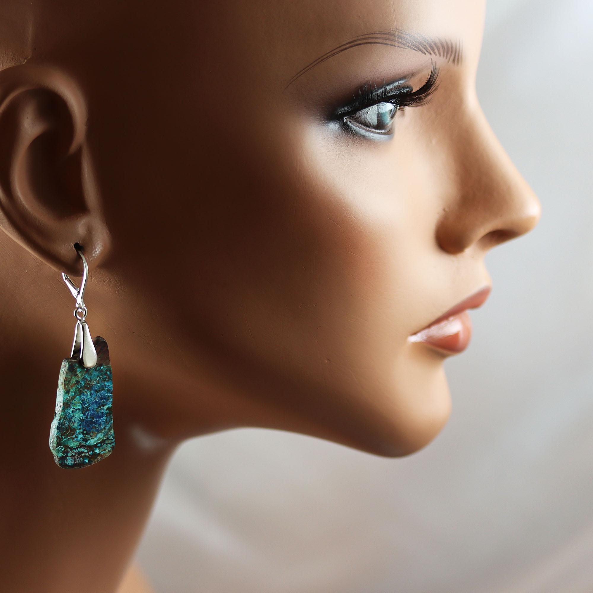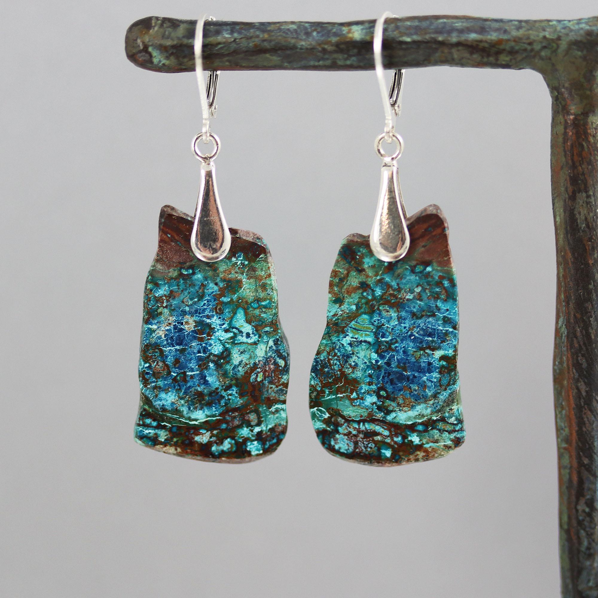 These earrings have gorgeous and colorful slabs of Chrysocolla dangling simply from sterling silver bails and lever back ear wires. From the top of the ear wires to the bottom of the stones measures 2 inches.