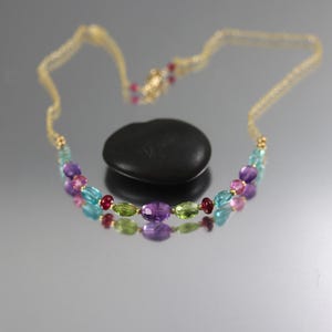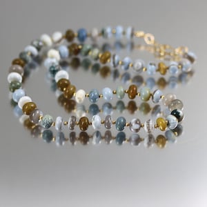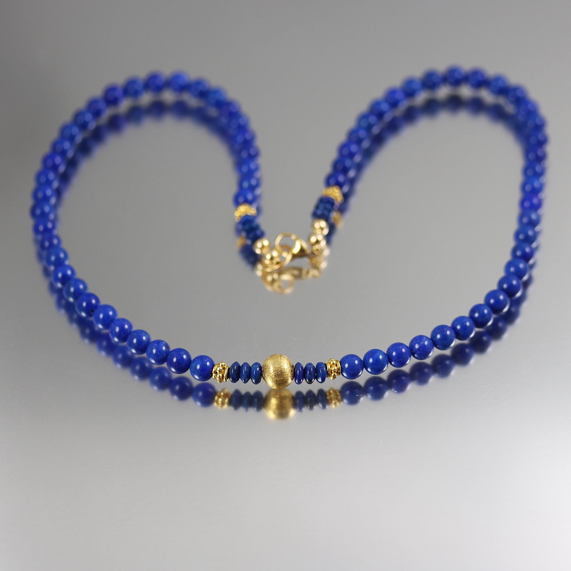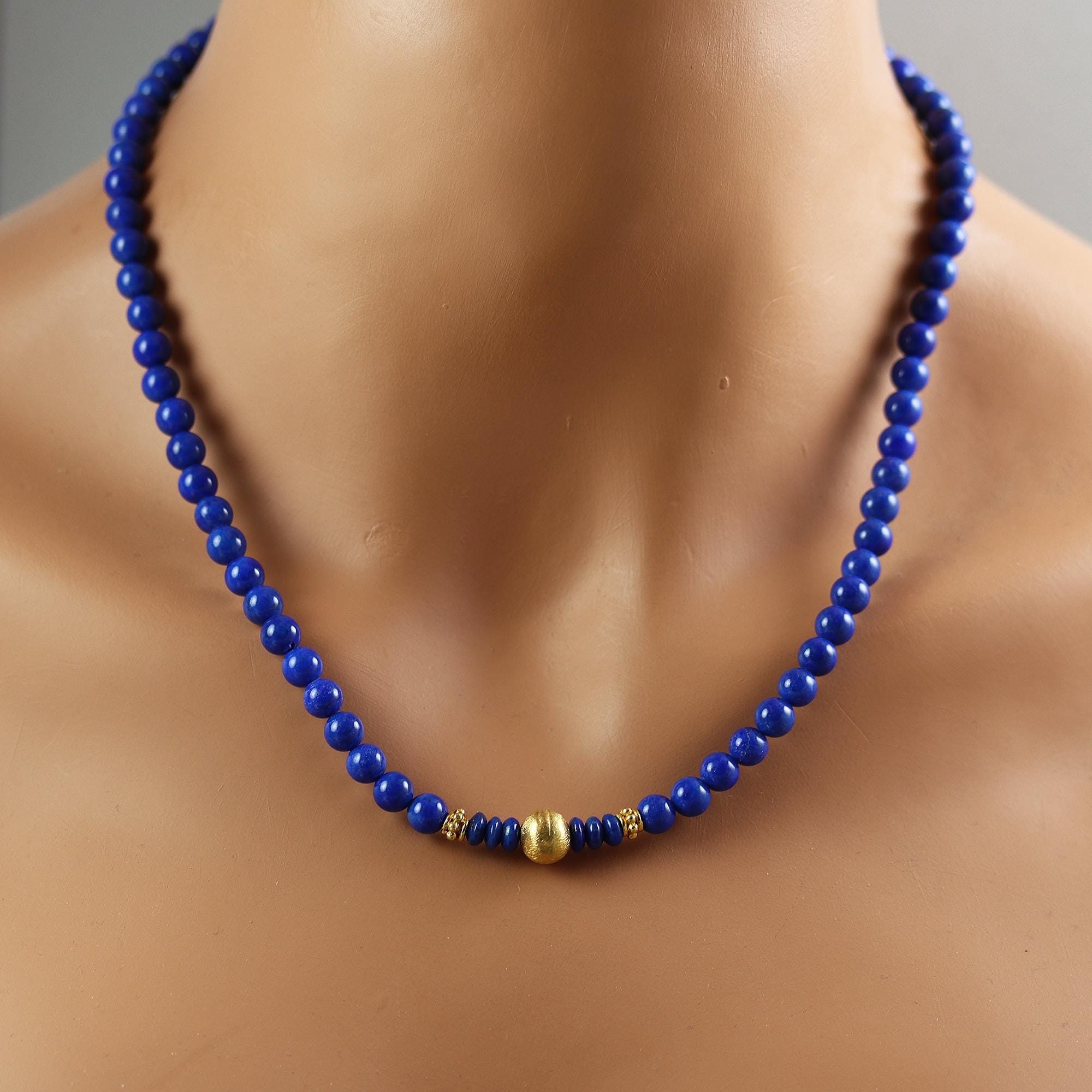 This necklace has lovely bright blue rounds of Lapis Lazuli accented with gold vermeil beads and ending in a gold fill lobster clasp. It's hard to find Lapis in this bright blue color these days, so I was happy to find it! The beads are 6mm in width. The necklace is 19 inches long.
