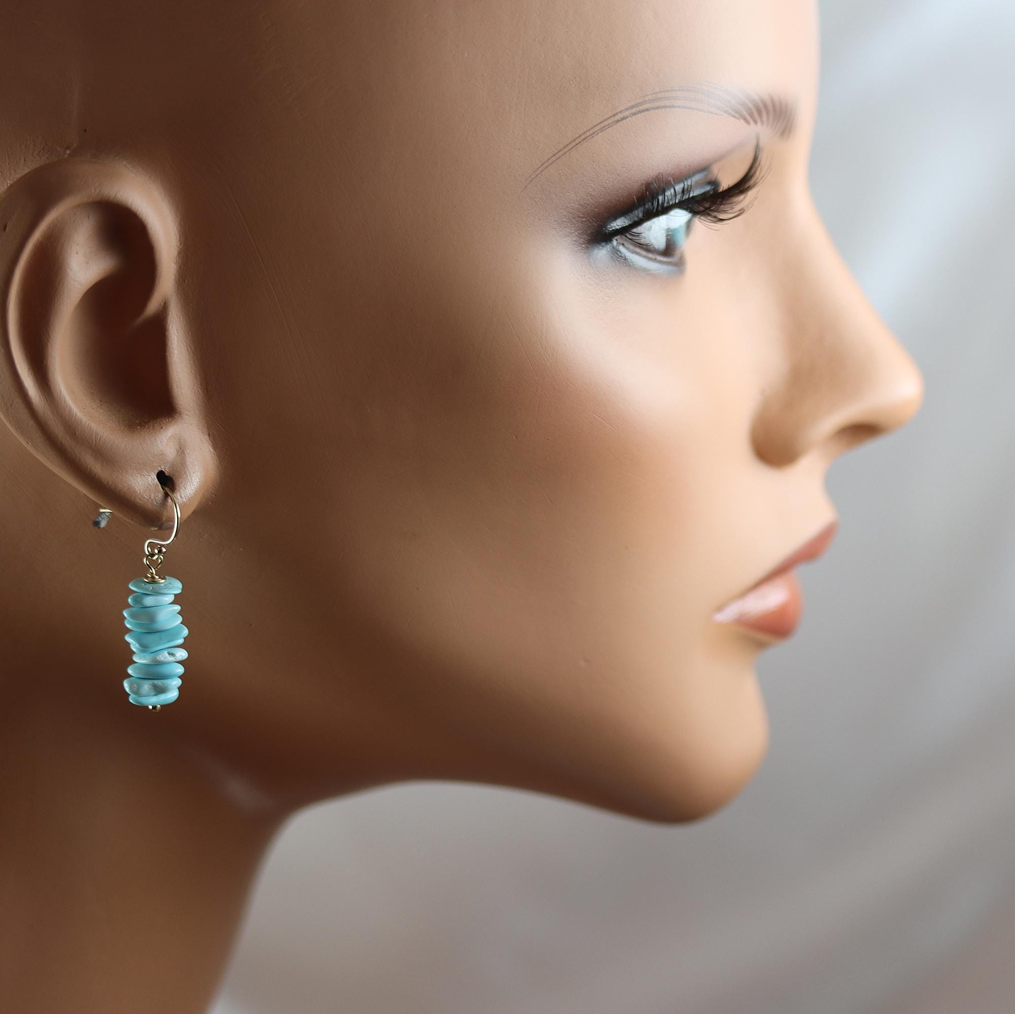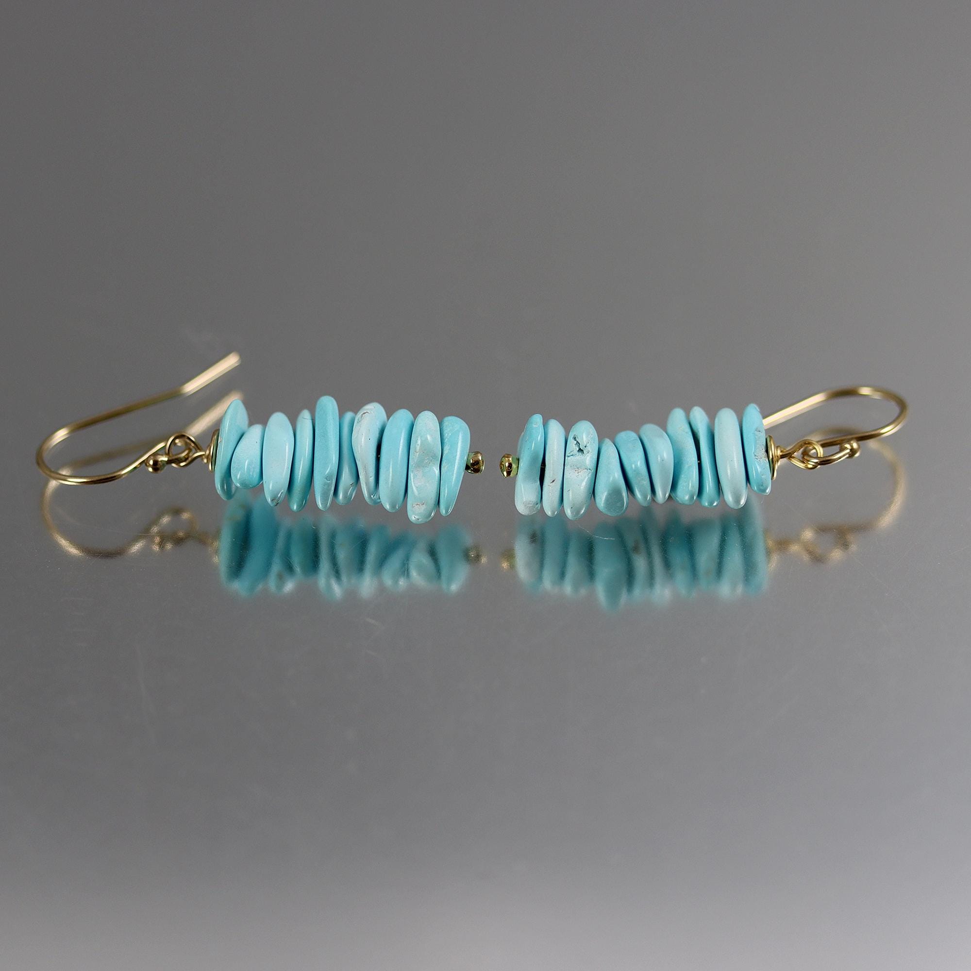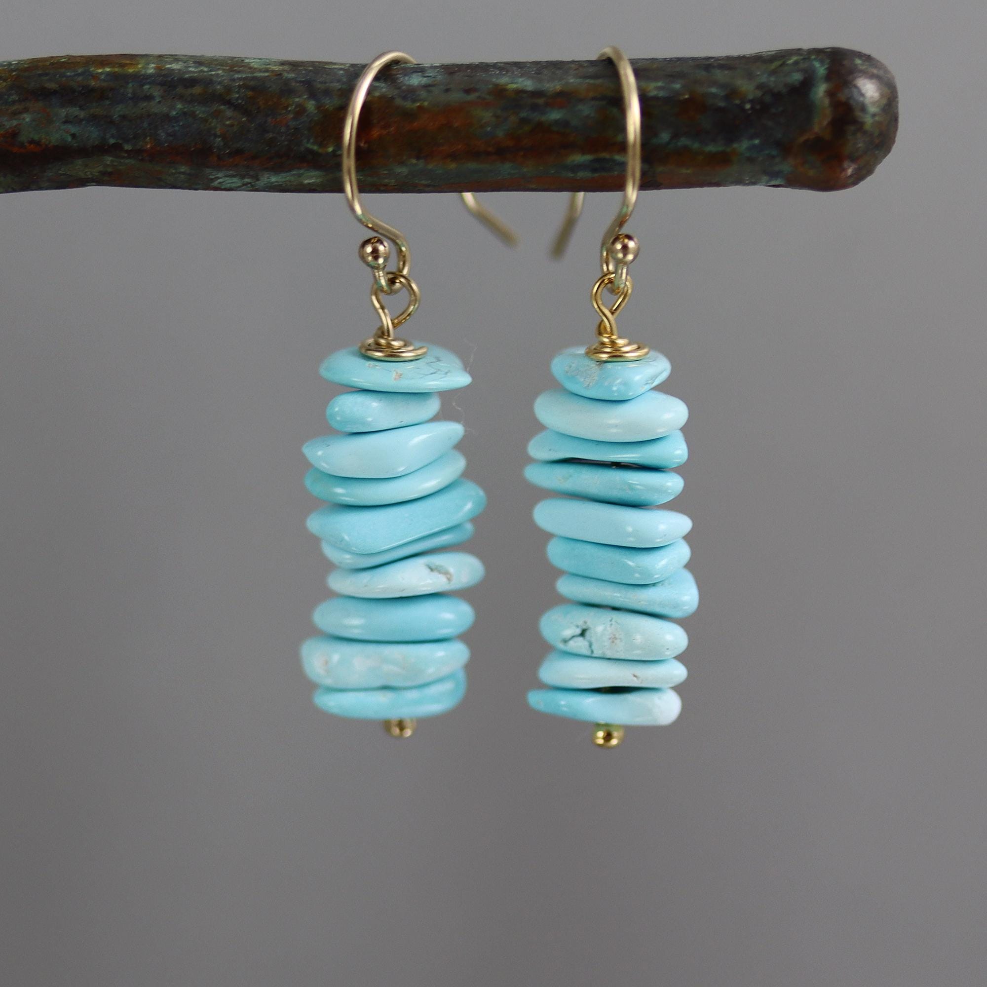 These earrings have high quality sleeping beauty turquoise flat nugget beads in a 3/4 inch stack. They dangle simply from gold fill french ear wires. From top to bottom they measure 1-1/4 inches tall.