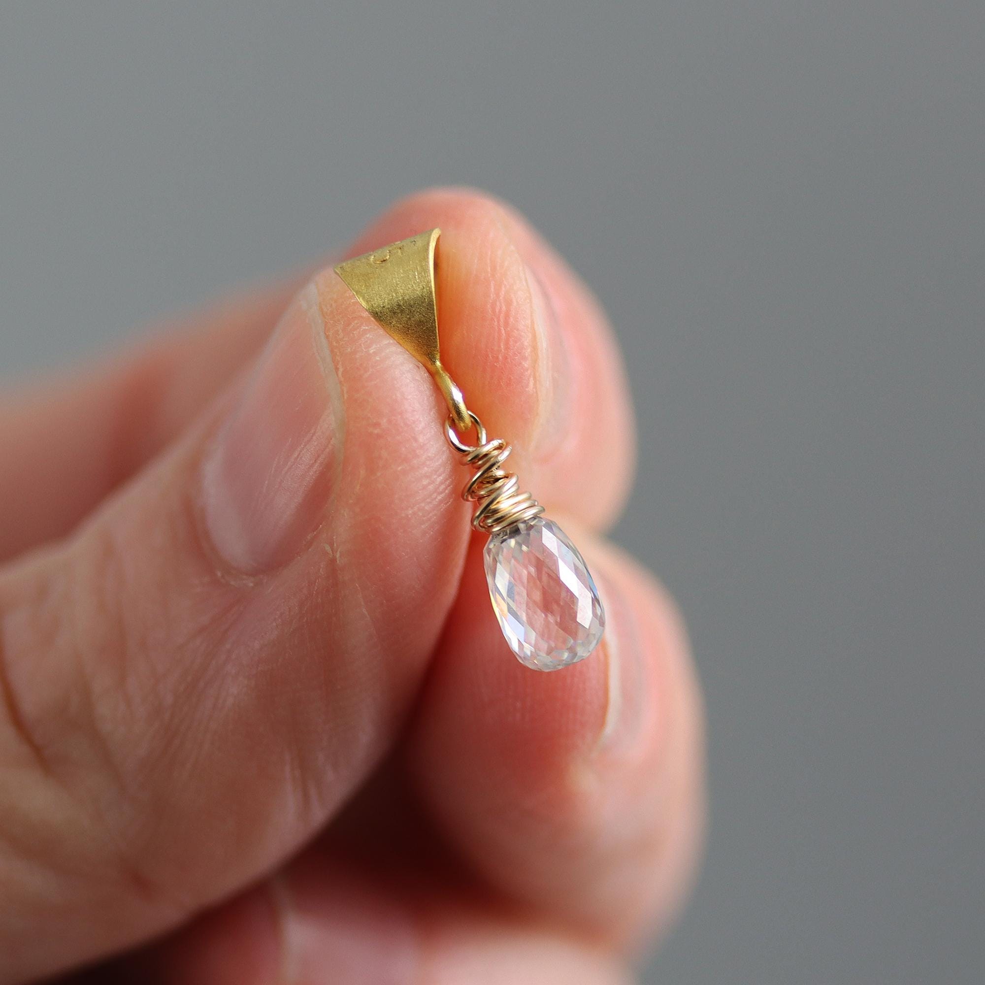 This sweet pendant has a perfectly clear white Moissonite briolette dangling from a gold vermeil bail. Moissonite is a natural material and now used to make diamond-like gems for more affordable but equally beautiful jewelry. The stone itself measures 7 x 5mm and the pendant is 3/4 inches tall.