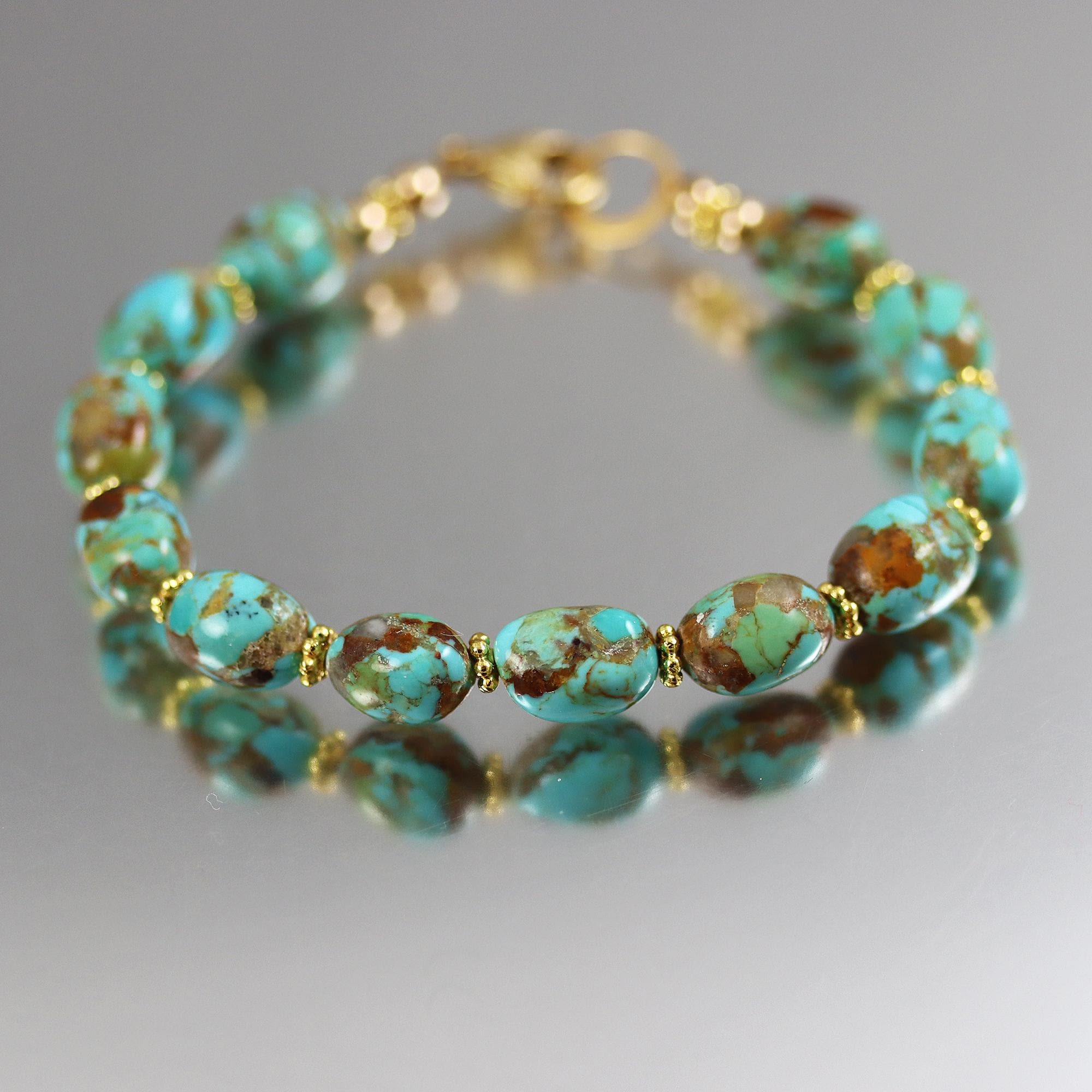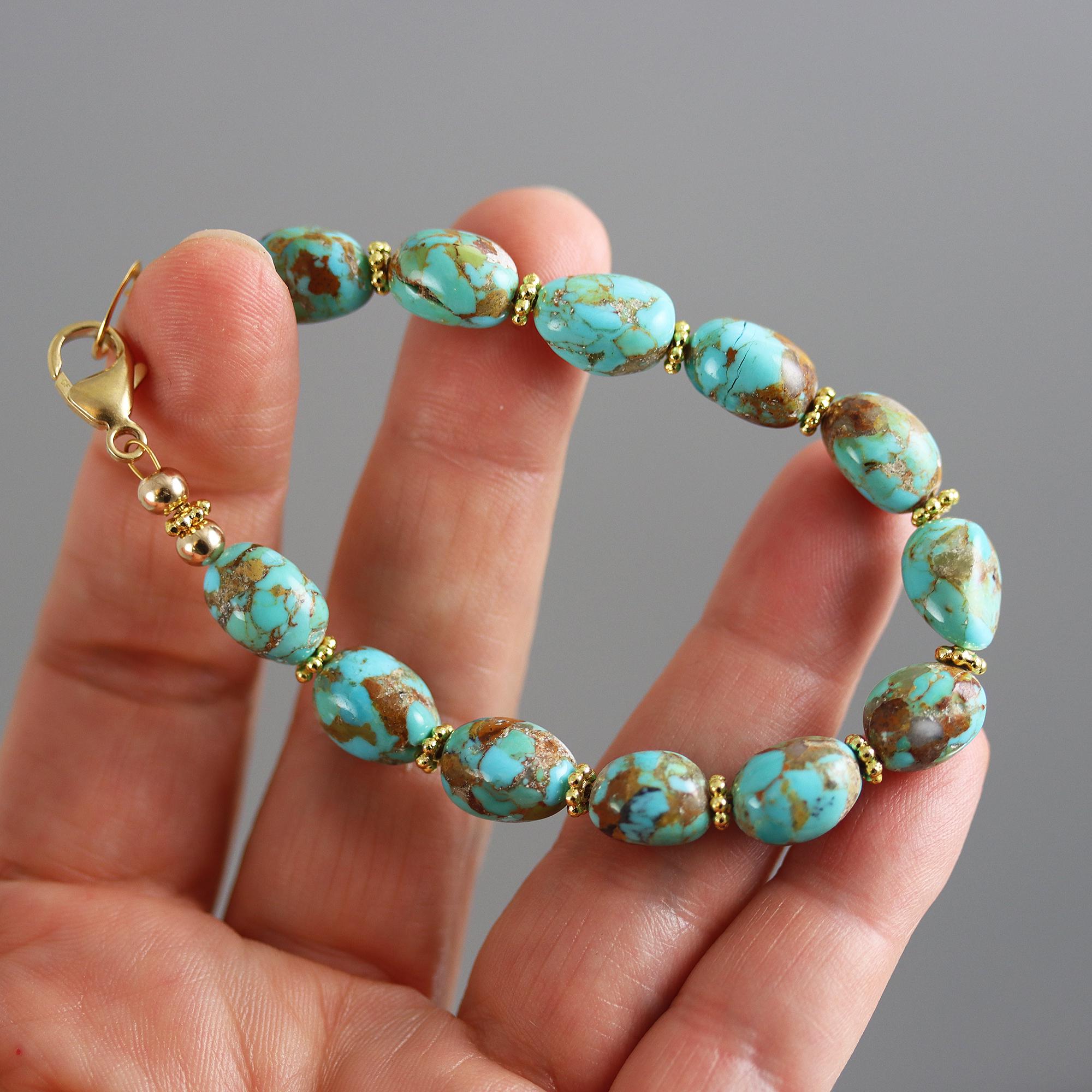 Beautiful rice nuggets of Kingman Turquoise are spaced with gold vermeil beads. The turquoise has such lovely patterns in brown and aqua blue. The bracelet ends in a gold fill lobster clasp and is 7-1/3 inches long.
