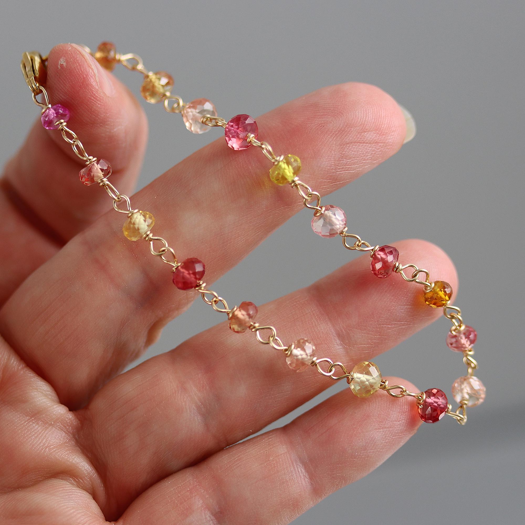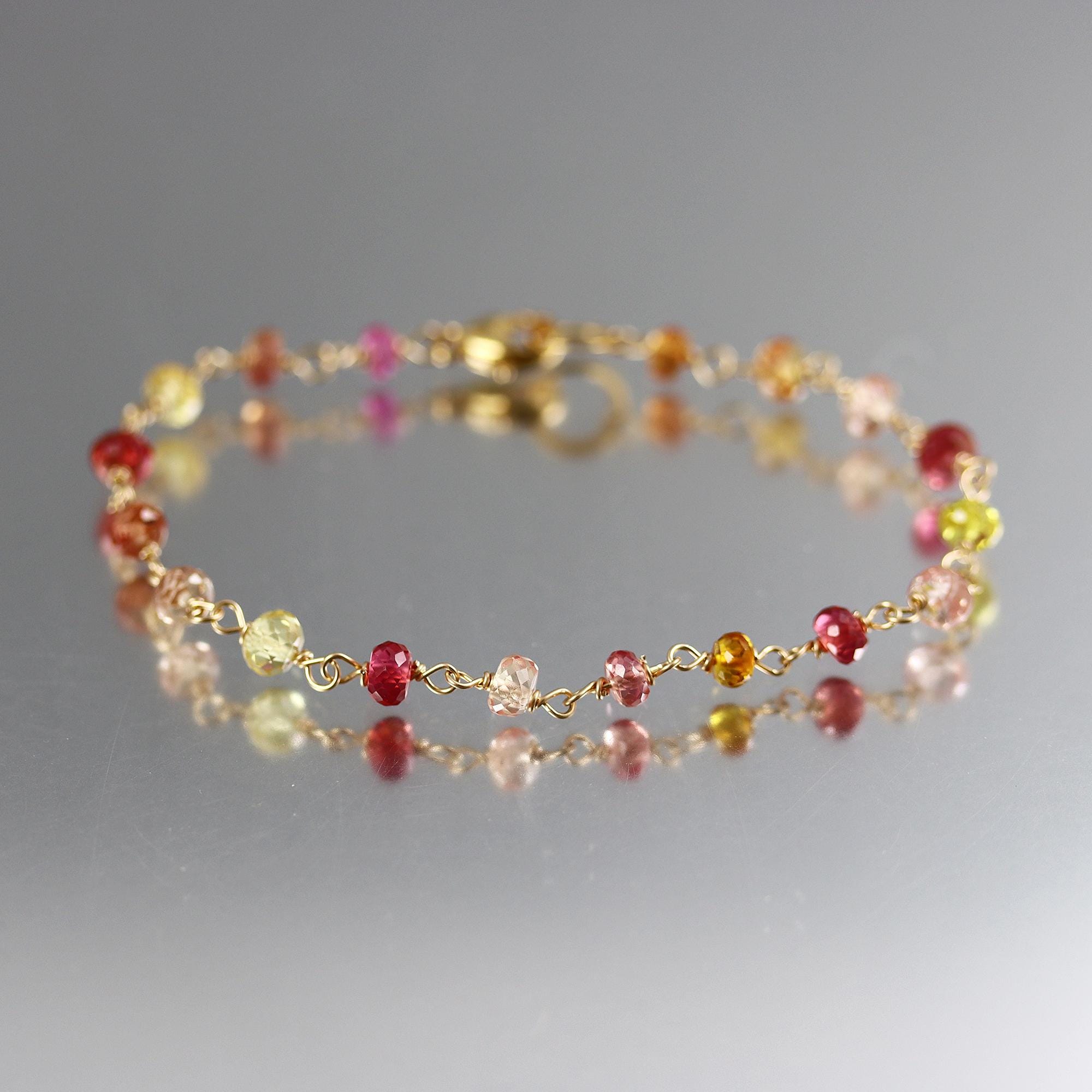 Gorgeous shaded Pastel Lab Sapphire faceted rondelles in colors for late Summer and Fall are wrapped with gold fill wire in this bracelet. Beautiful little 5mm beads . The bracelet ends in a gold fill lobster clasp and is 7.5 inches long.