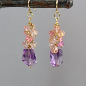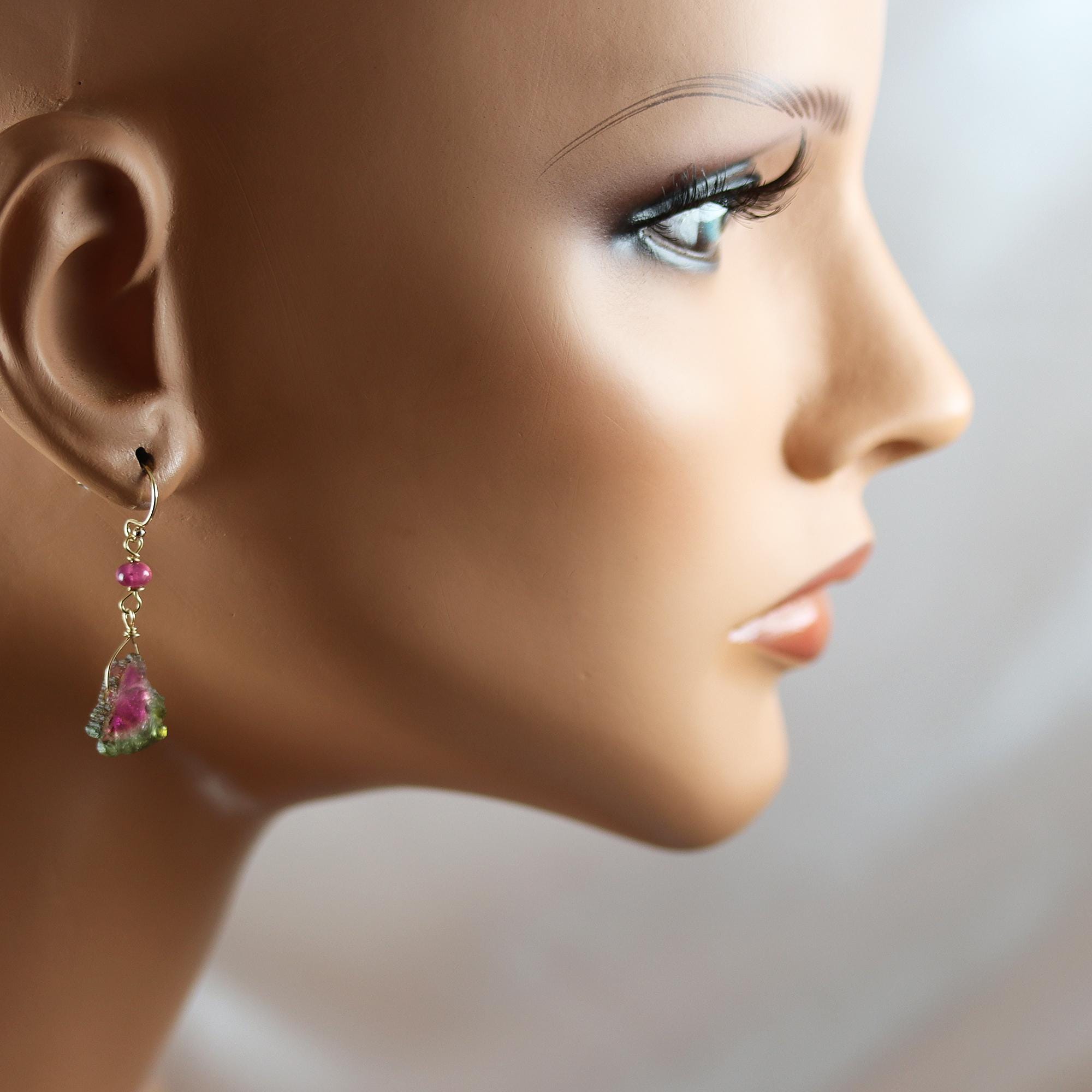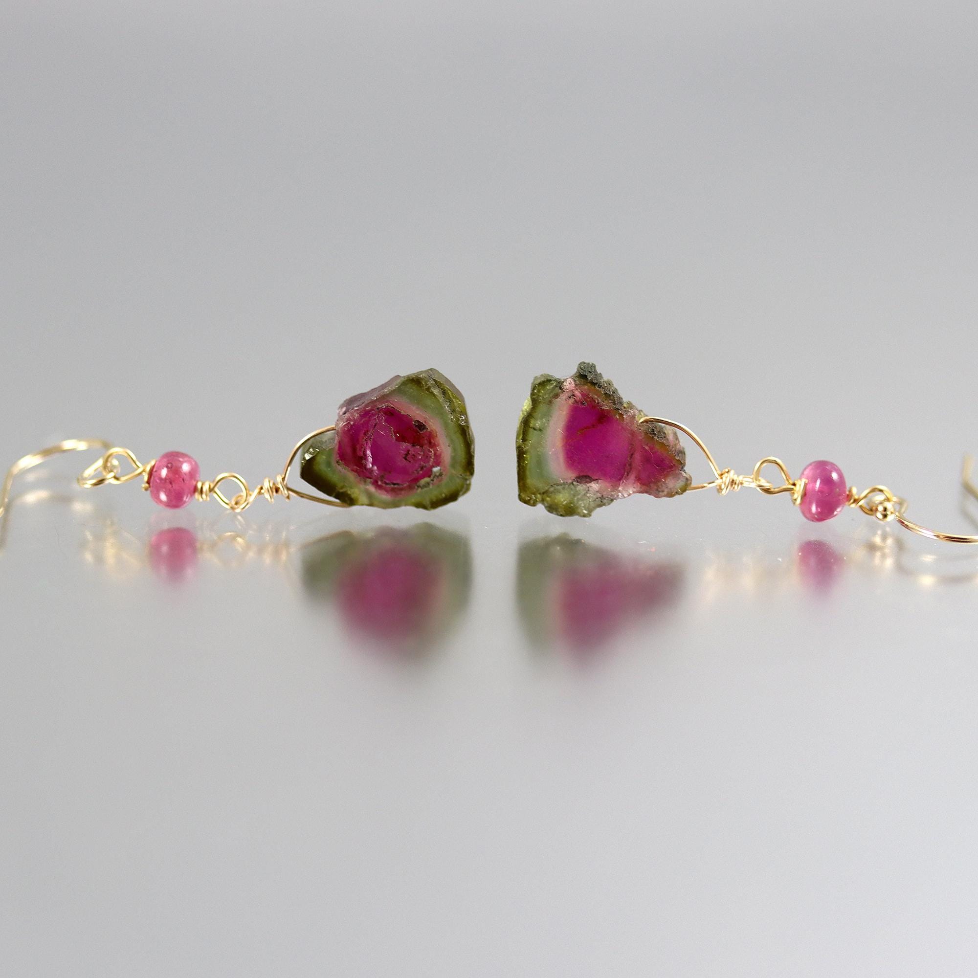 These earrings showcase rustic watermelon tourmaline slices, each with its own unique blend of pink and green. Above, vivid rubellite tourmaline rondelles add a pop of rich color and sparkle. Measuring 1 1/2 inches from top to bottom, they’re a perfect balance of natural beauty and refined design. The slices are 13mm tall and the rondelles are 4.5 mm.
