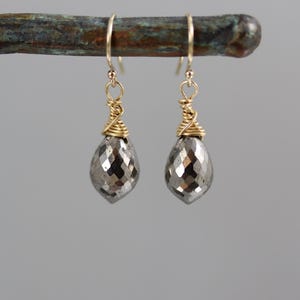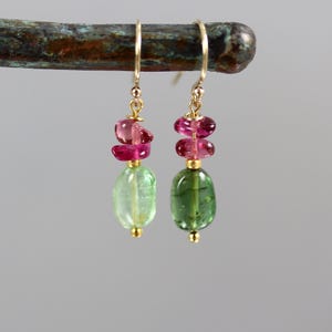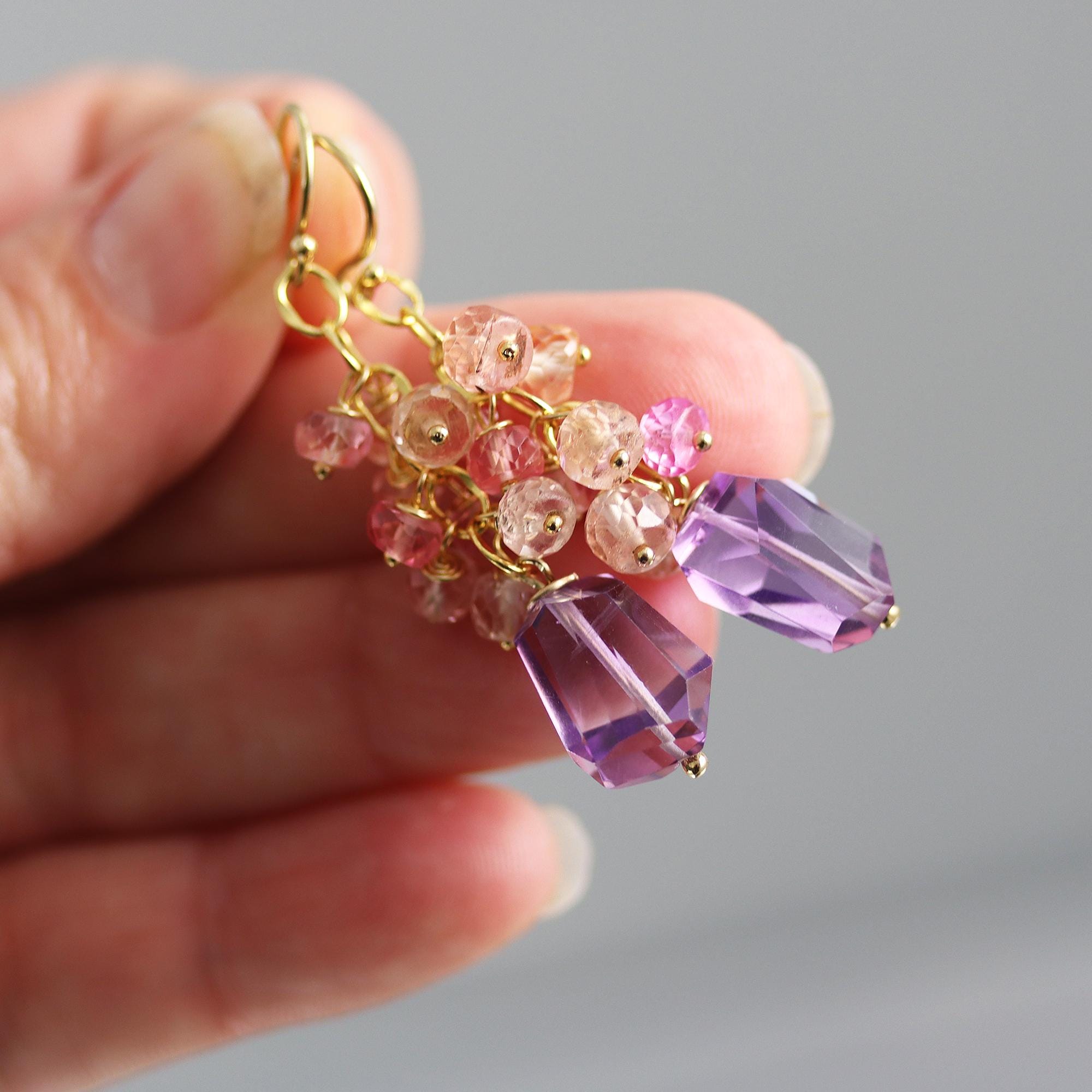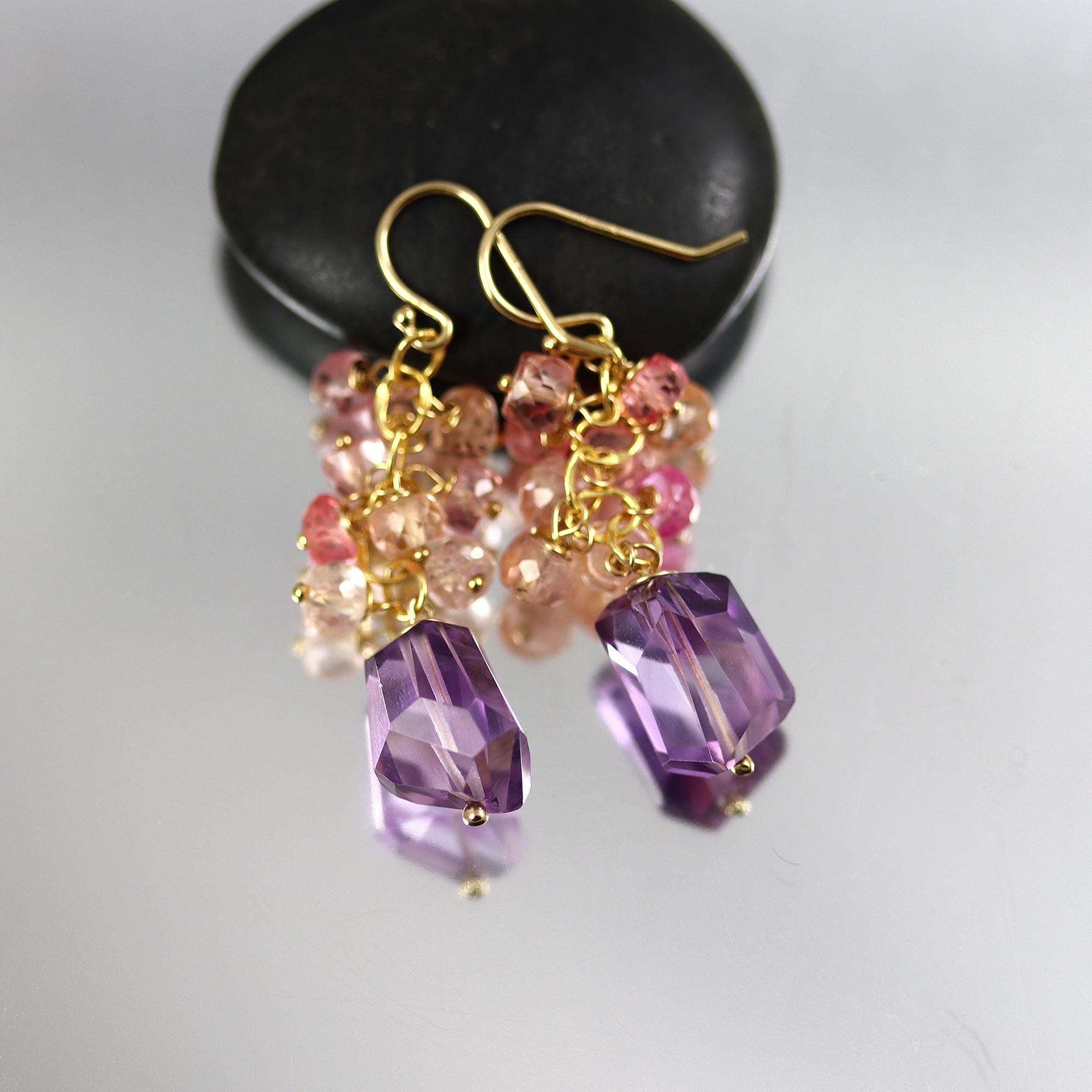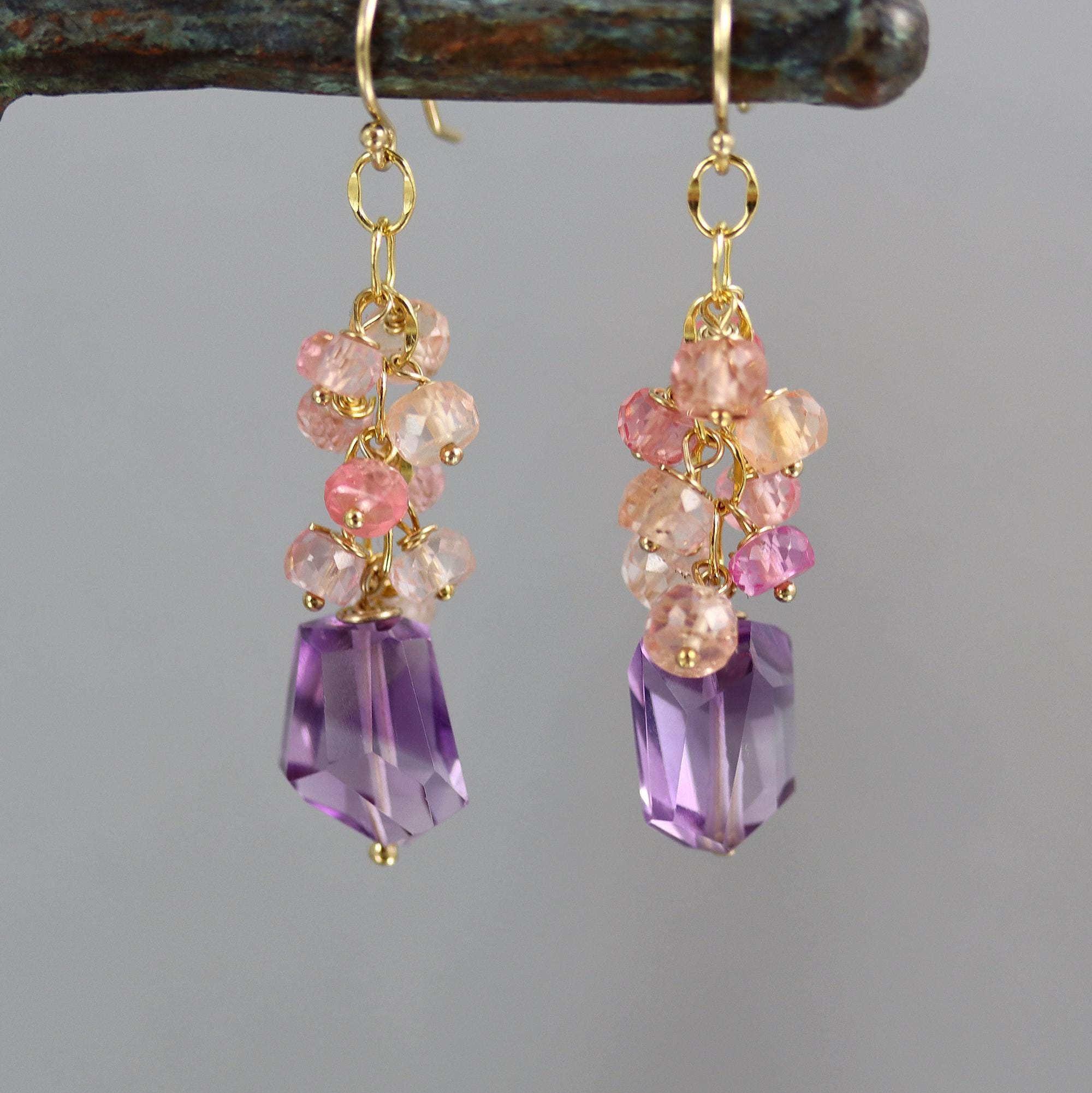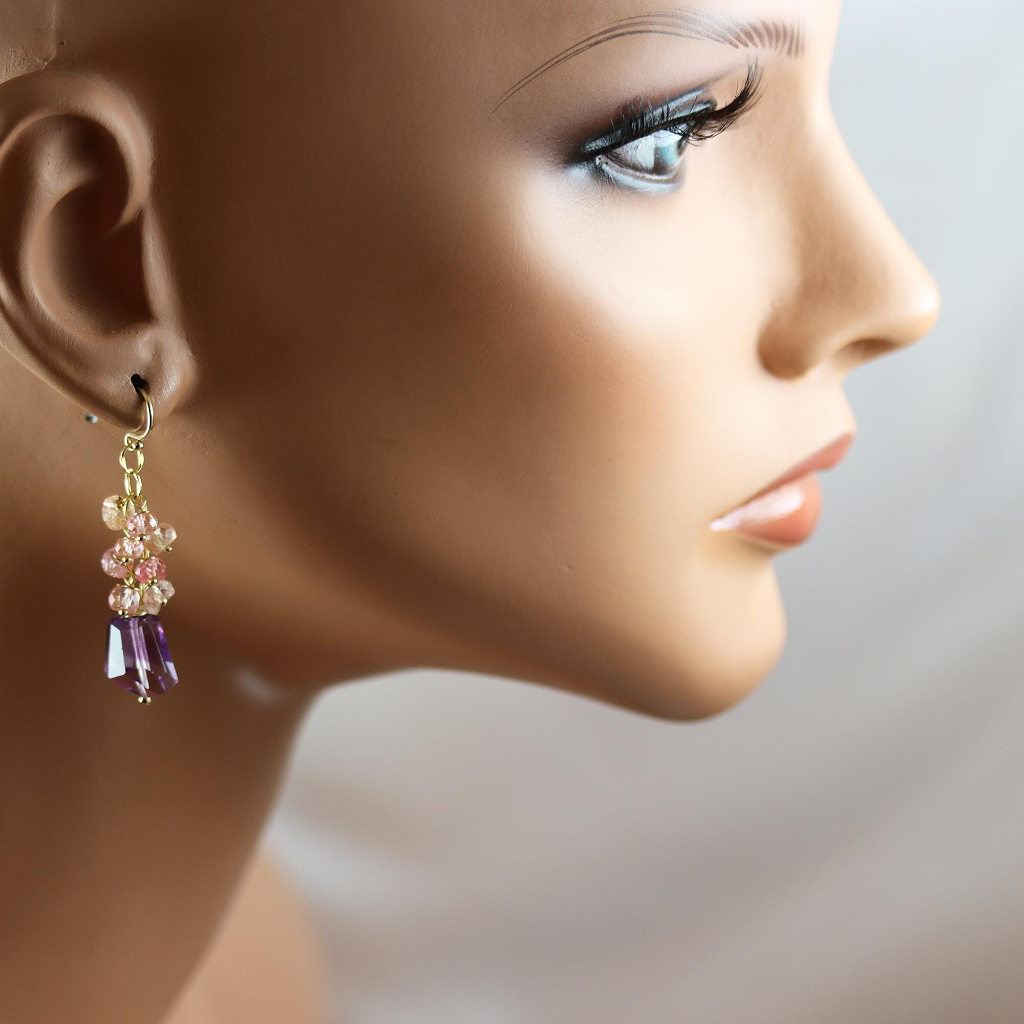 Beautiful gem quality Amethyst nuggets are adorned with pastel shaded pink Sapphire rondelles that dangle in clusters from gold fill french ear wires. From top to bottom they measure 1.75 inches.