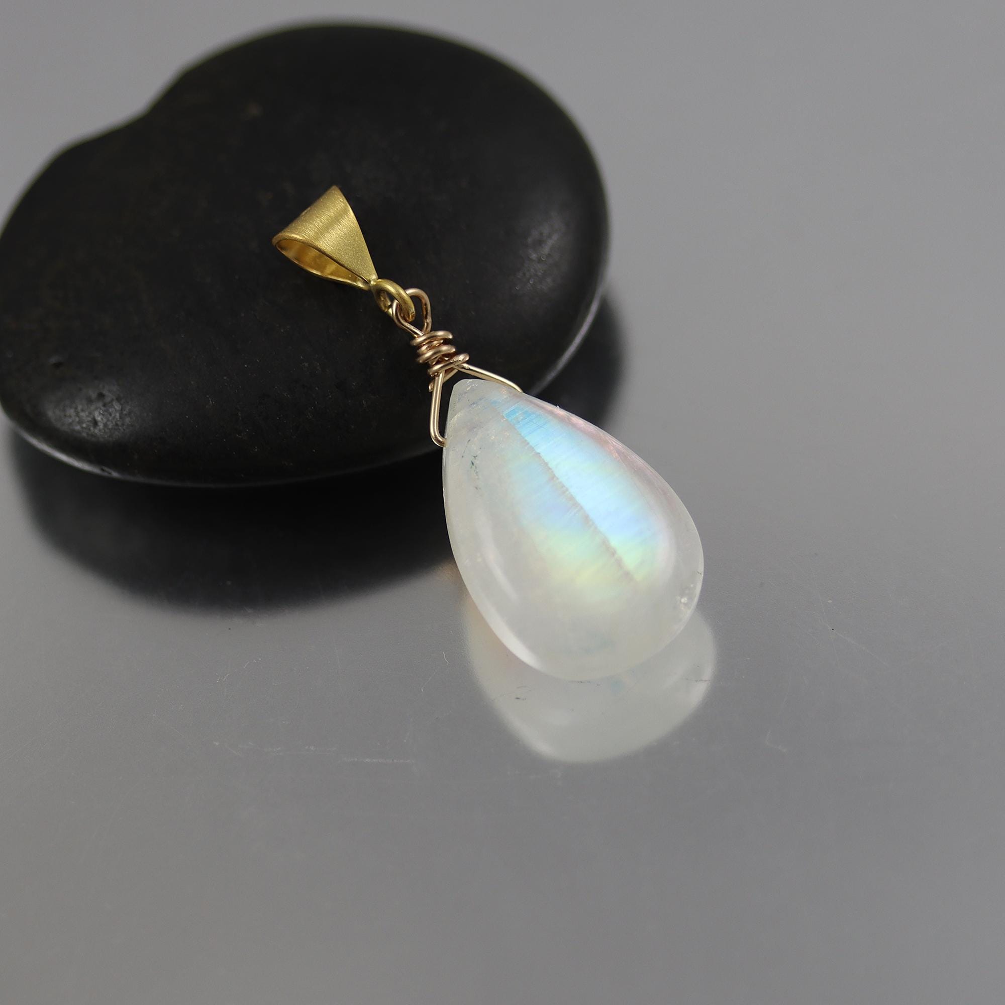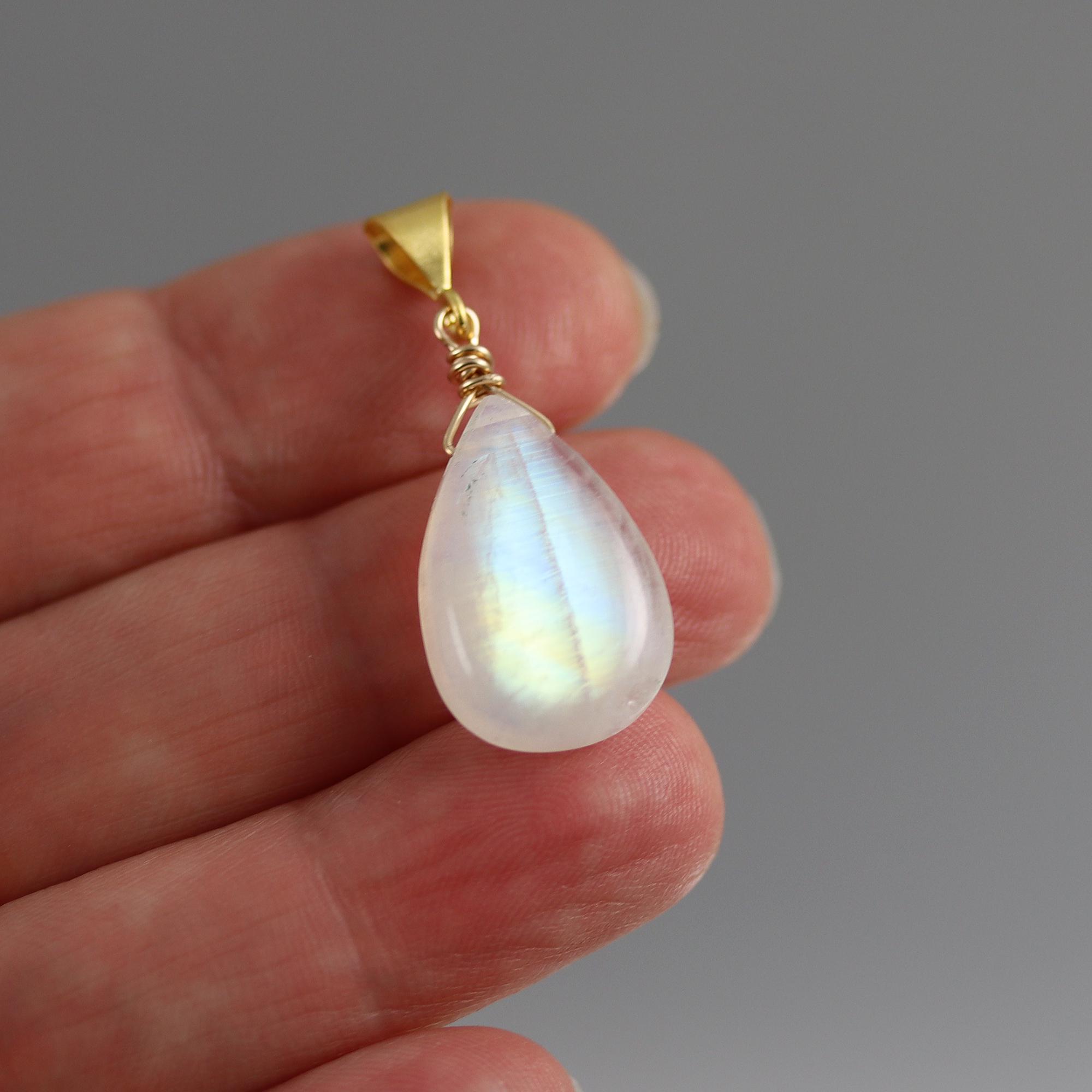 This pendant has an amazingly beautiful pear briolette of Rainbow Moonstone measuring 20 x 12 mm and with wonderful sheen dangling from a simple gold vermeil bail. The pendant measures 1-1/4 inches from top to bottom.