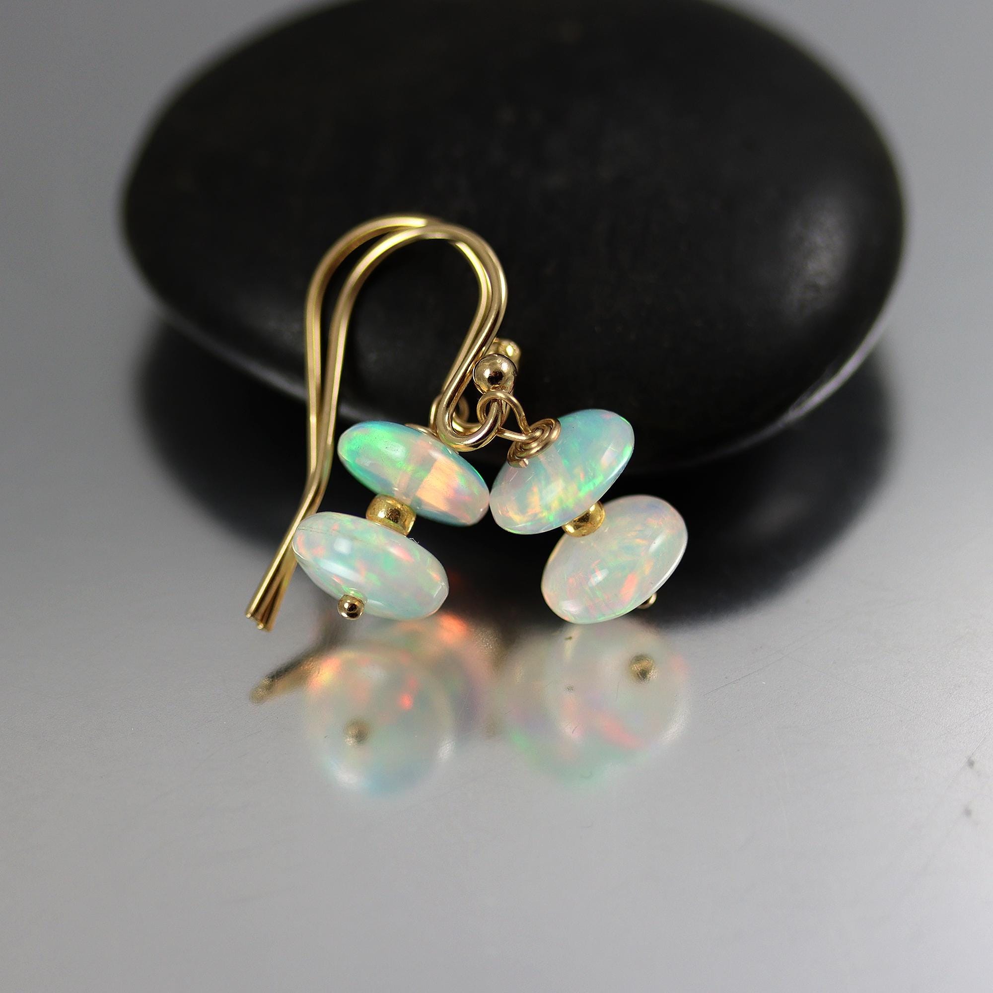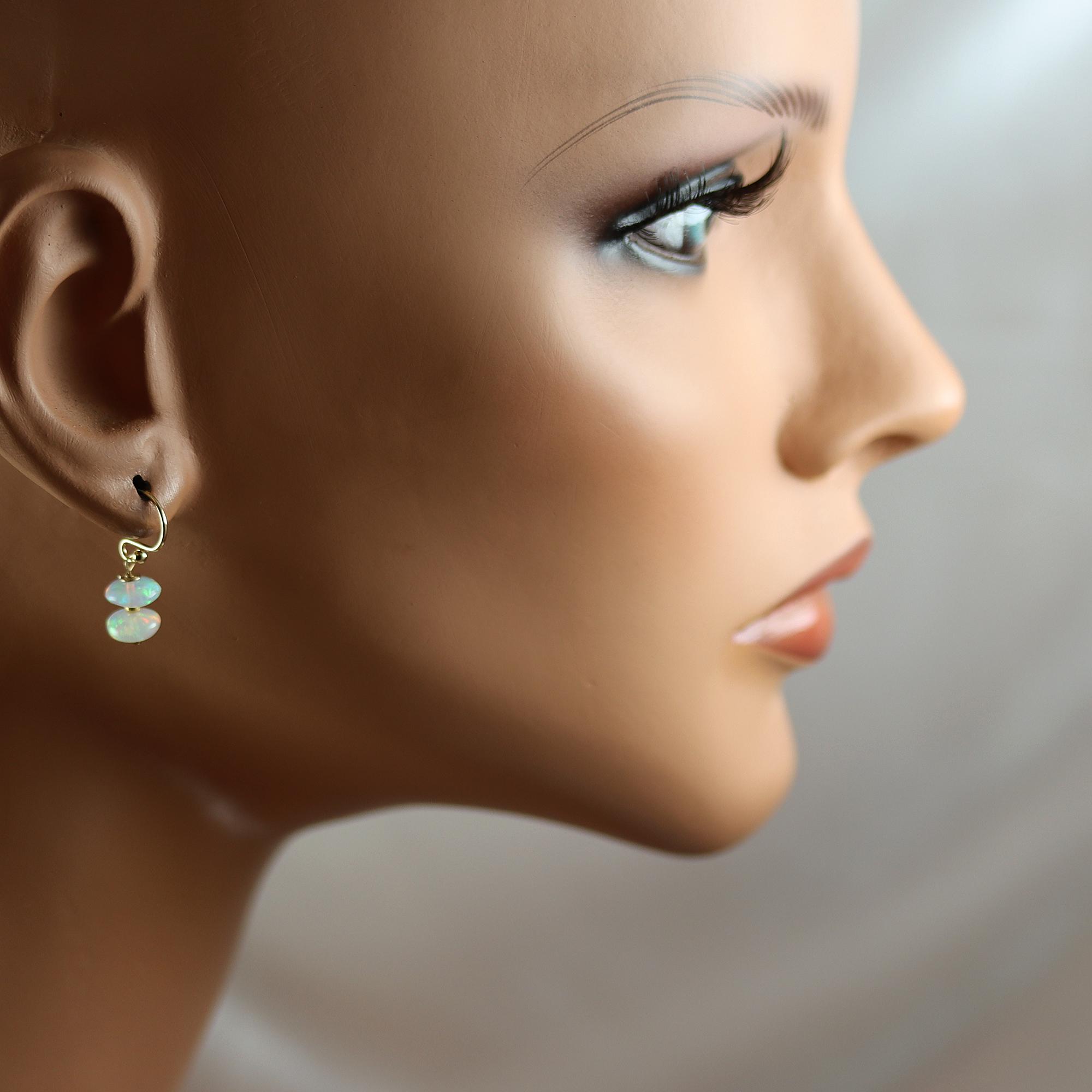 These earrings showcase superb Ethiopian opal disc beads, suspended from gold-filled French ear wires in duos. The opals are from a super high quality strand and have crazy beautiful sparkles. From top to bottom they measure 3/4 inches.