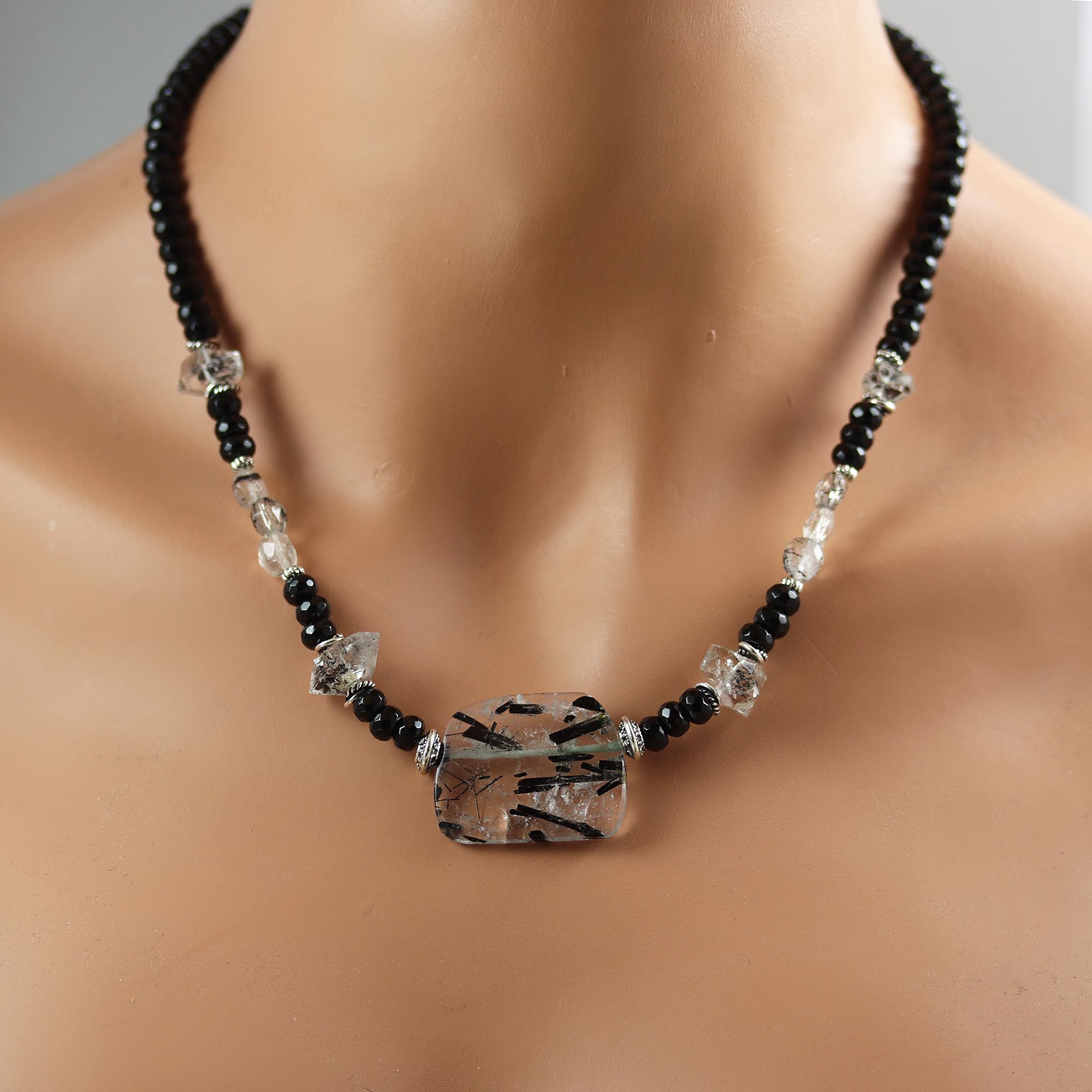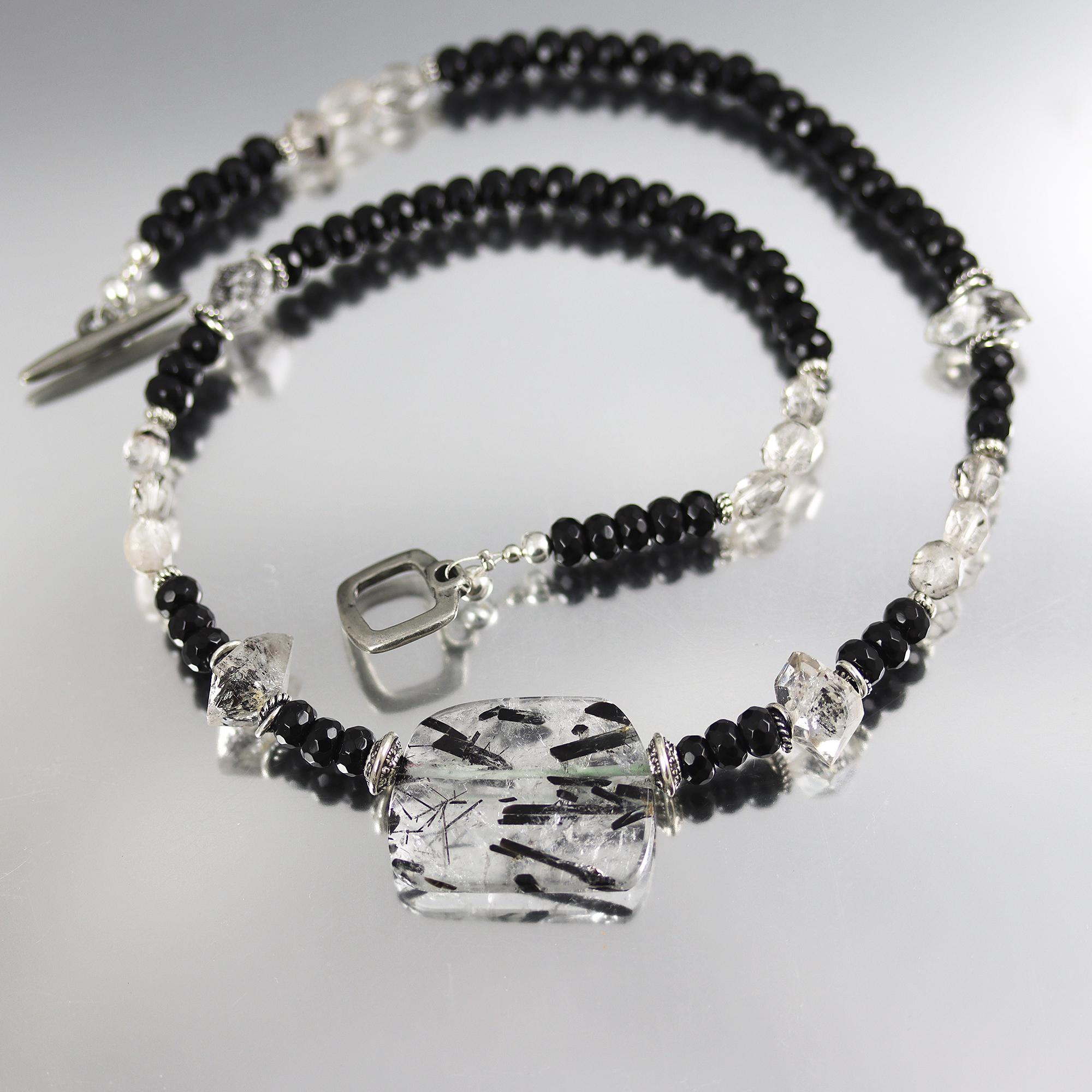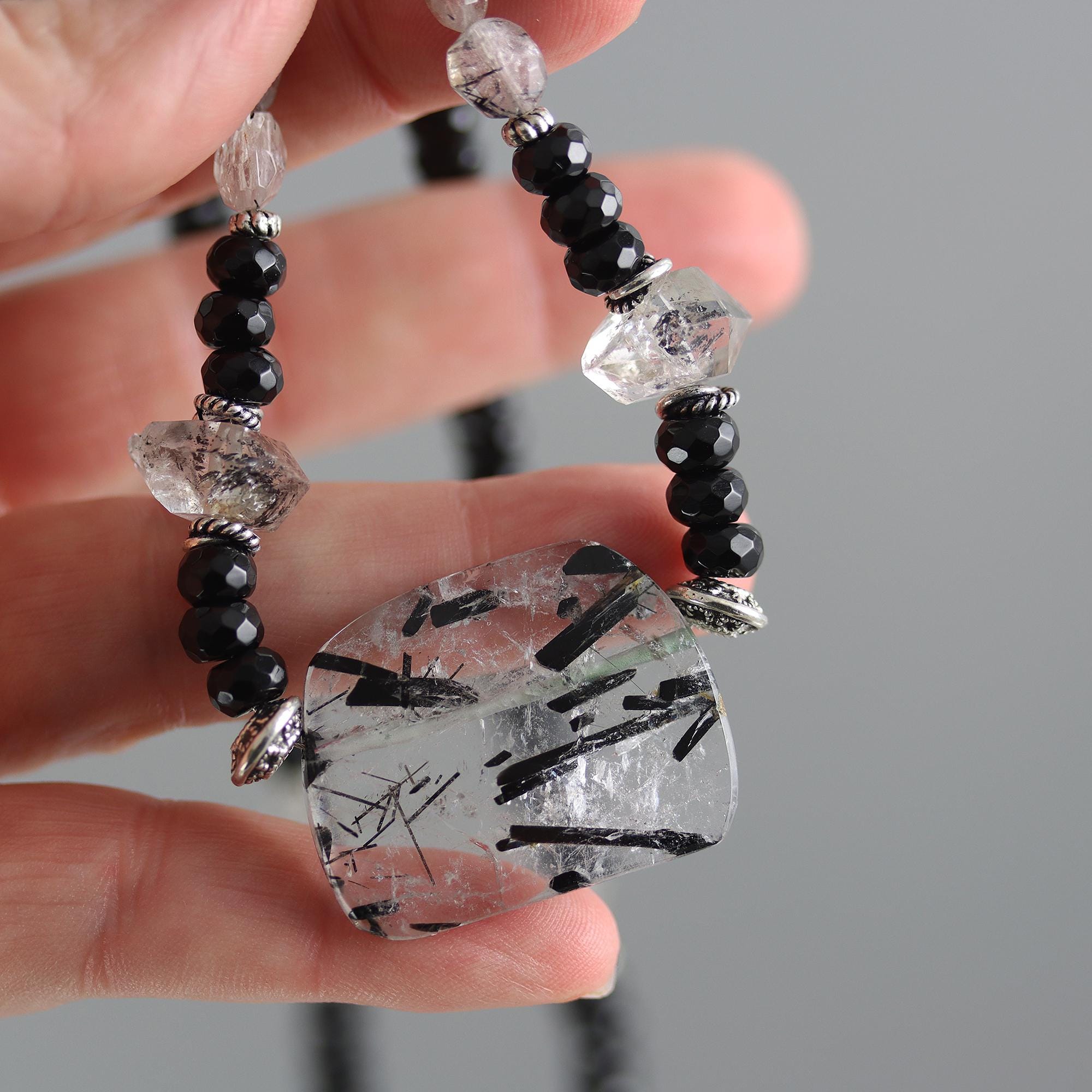 At center is a lovely black tourmalinated Quartz pendant bead measuring 30 x 24mm. Along the strand are black Onyx rondelles, Pakistani Herkimers (called Pakimers) and nuggets of black tourmalinated quartz. The necklace ends in an antique silver pewter toggle clasp and is 19 inches long.