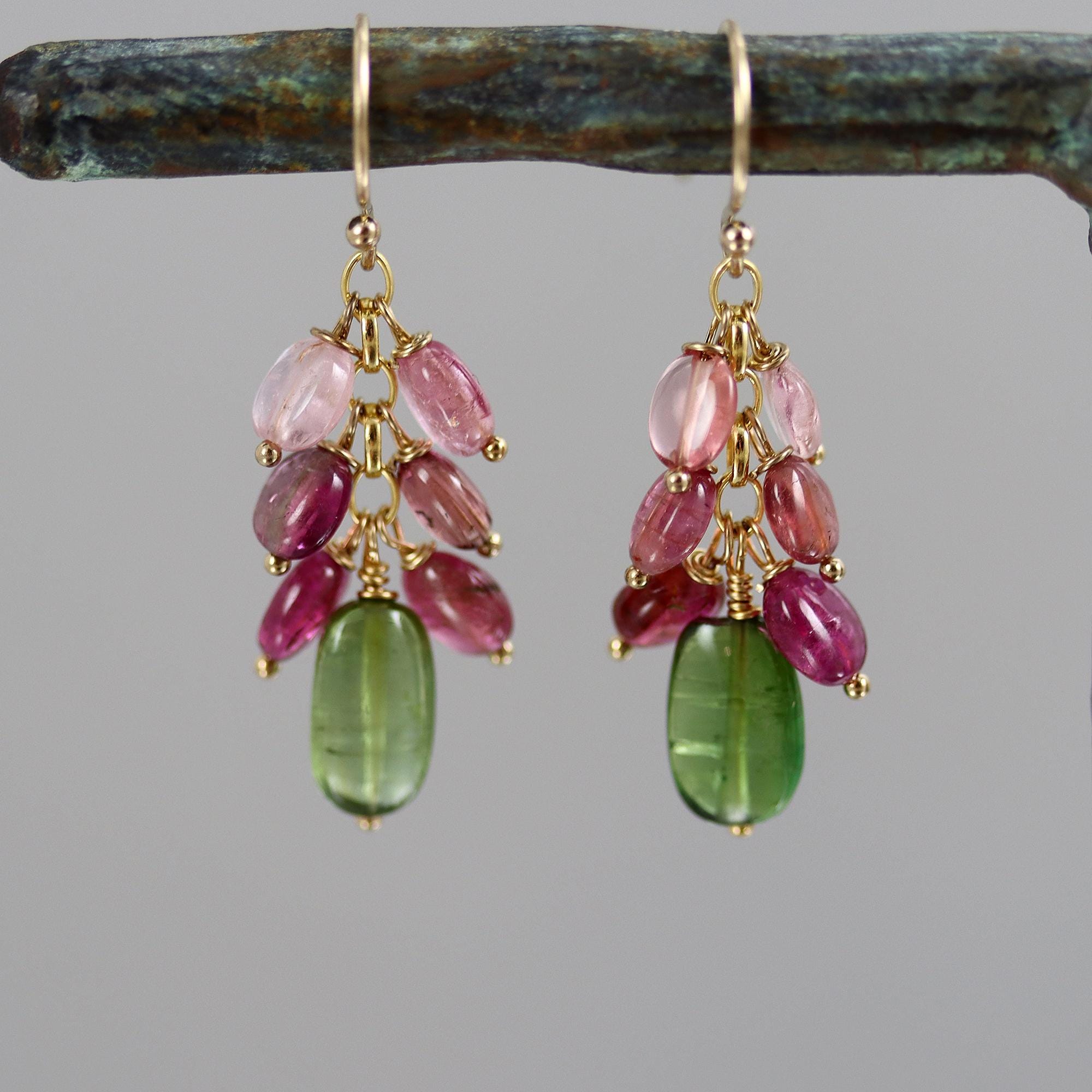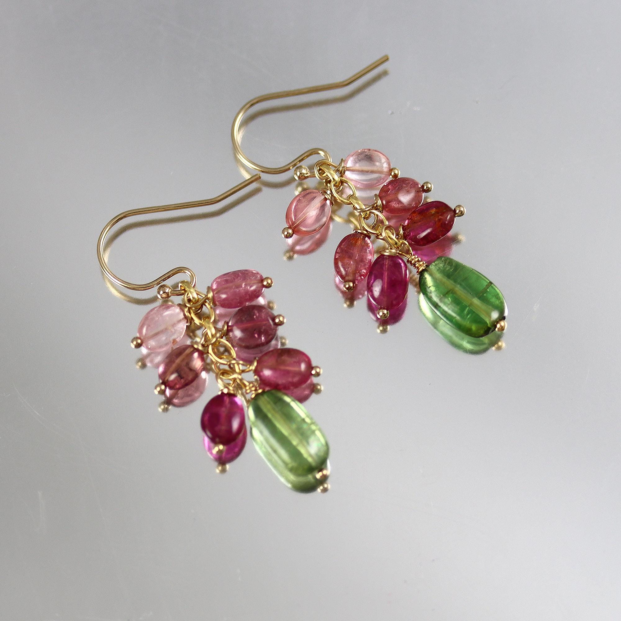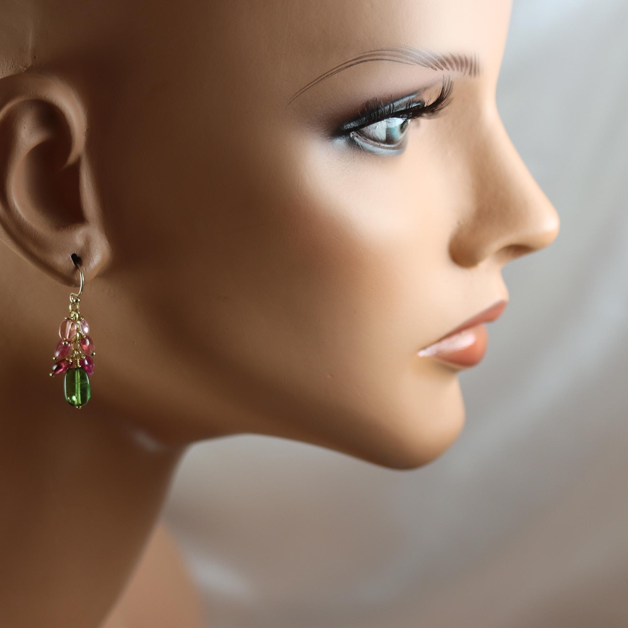 These earrings feature a cascade of transparent pink tourmaline ovals with a green tourmaline nugget at bottom. Completed with comfortable gold-filled French ear wires. From top to bottom, the earrings measure 1 1/4 inches long.