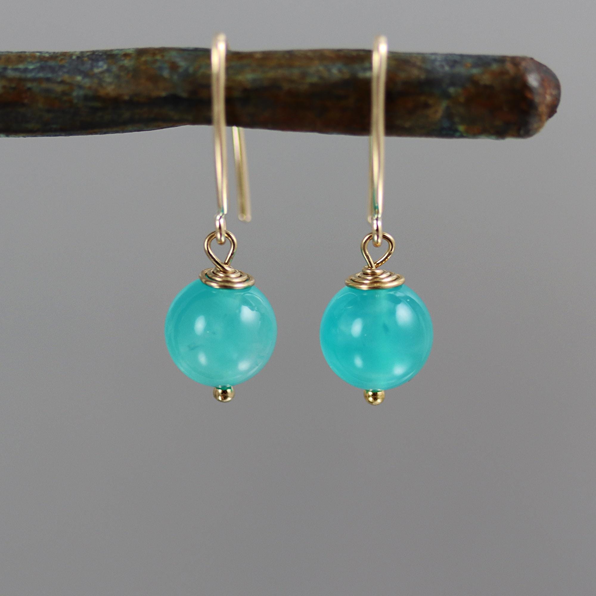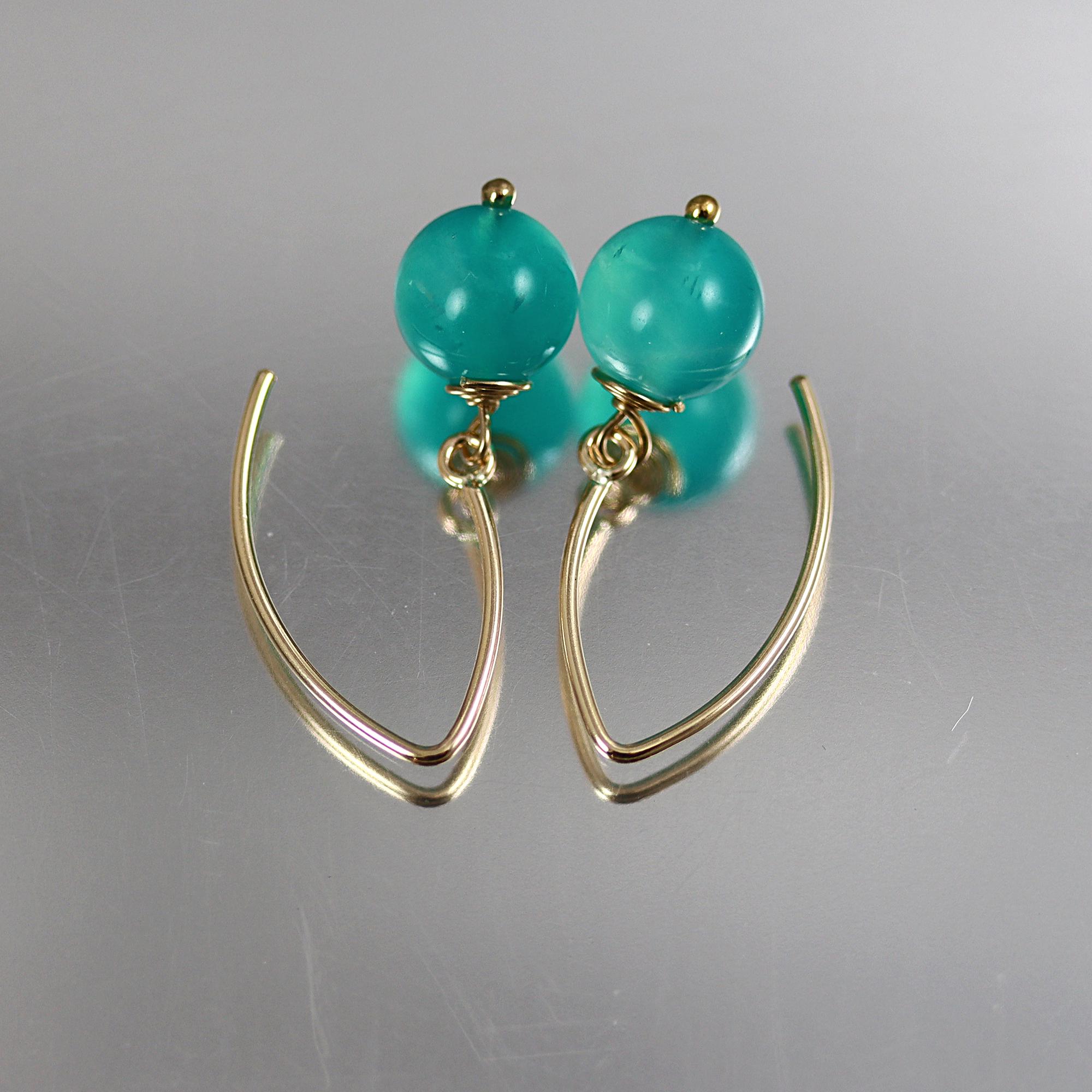 Totally natural in color, a rare find, these Amazonite earrings have gorgeous 8mm round beads dangling simply from gold fill marquise ear wires. From top to bottom they measure 1 inch. Superb natural Amazonite rounds from Tanzania — among the finest quality, with a vivid color often imitated but rarely found untreated.
