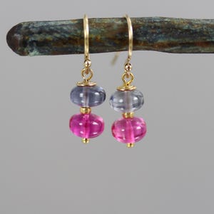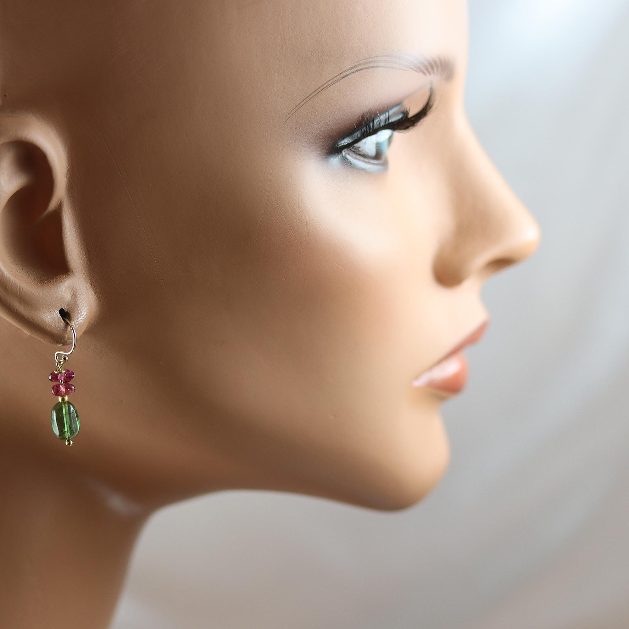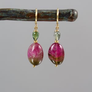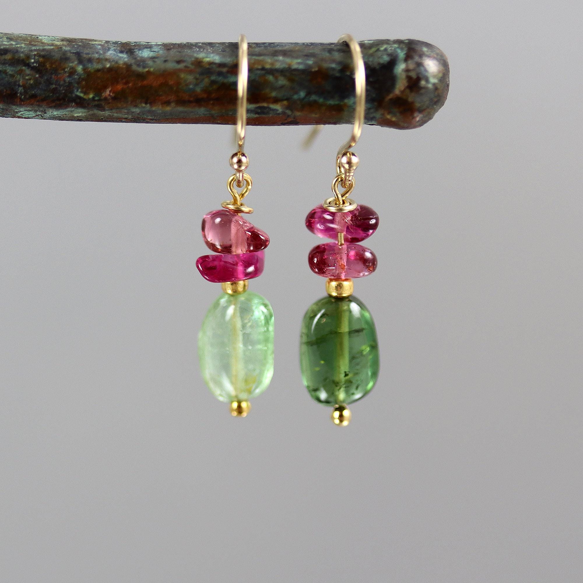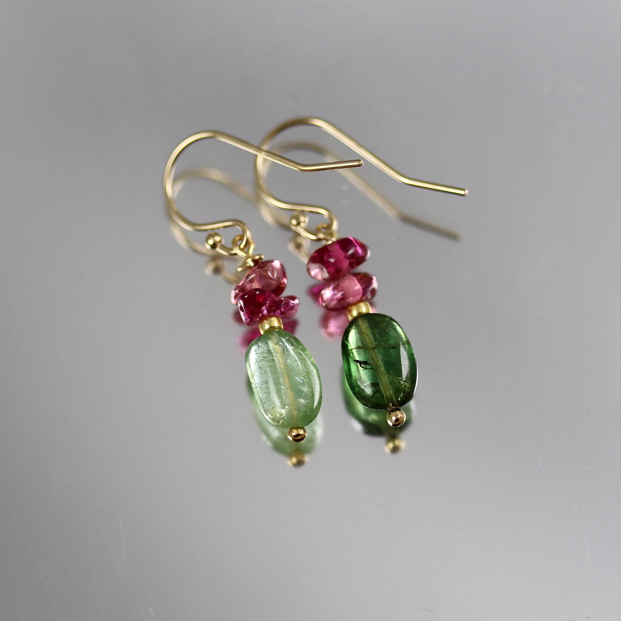 A beautiful pair of green Tourmaline oval nuggets are topped with Rubellite Tourmaline chip beads. They dangle from gold fill french ear wires and measure a touch over 1 inch from top to bottom.