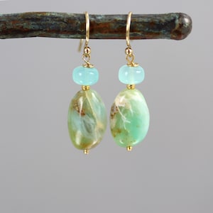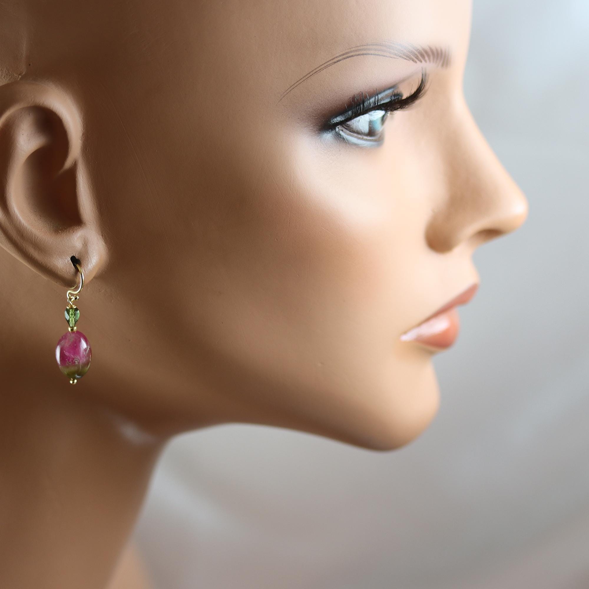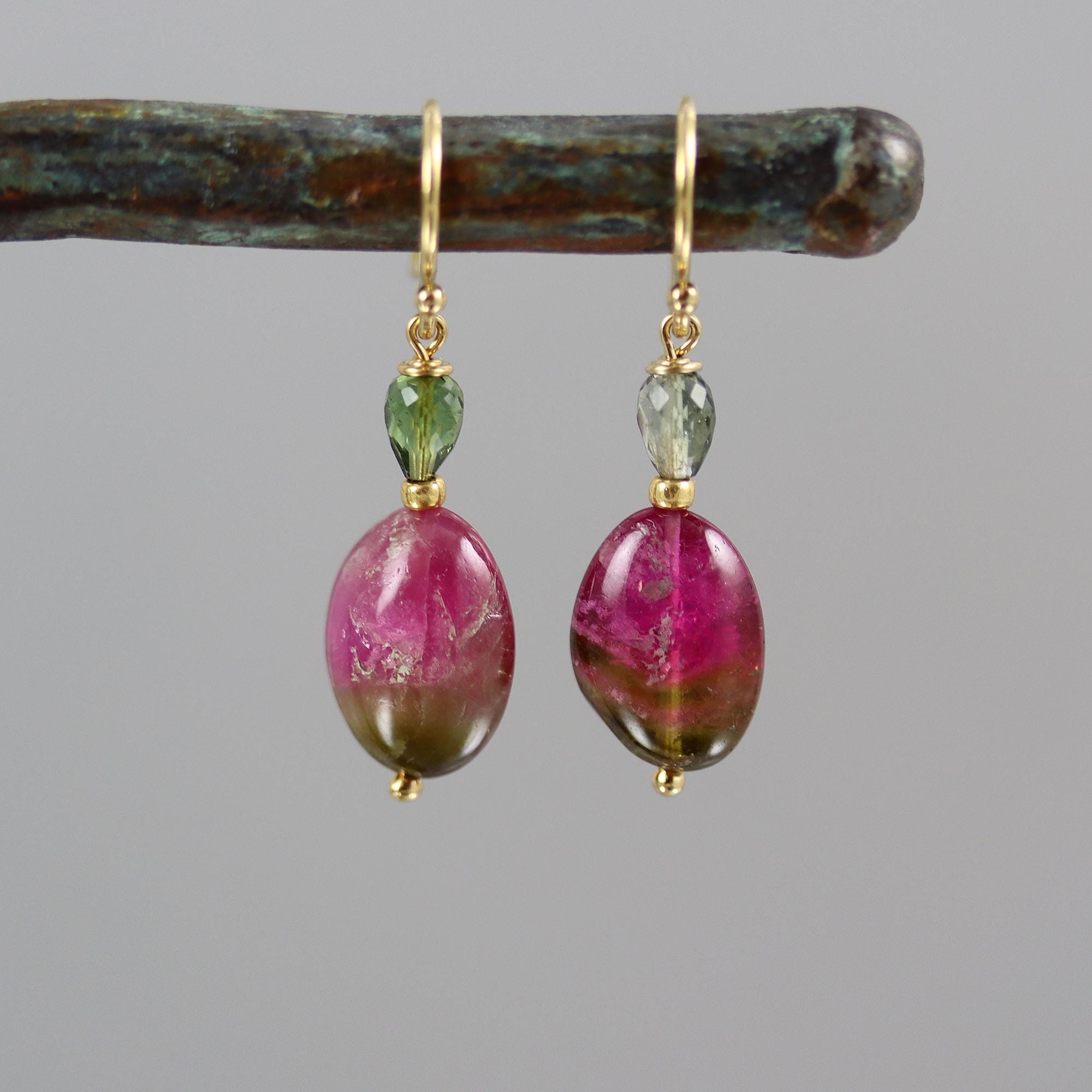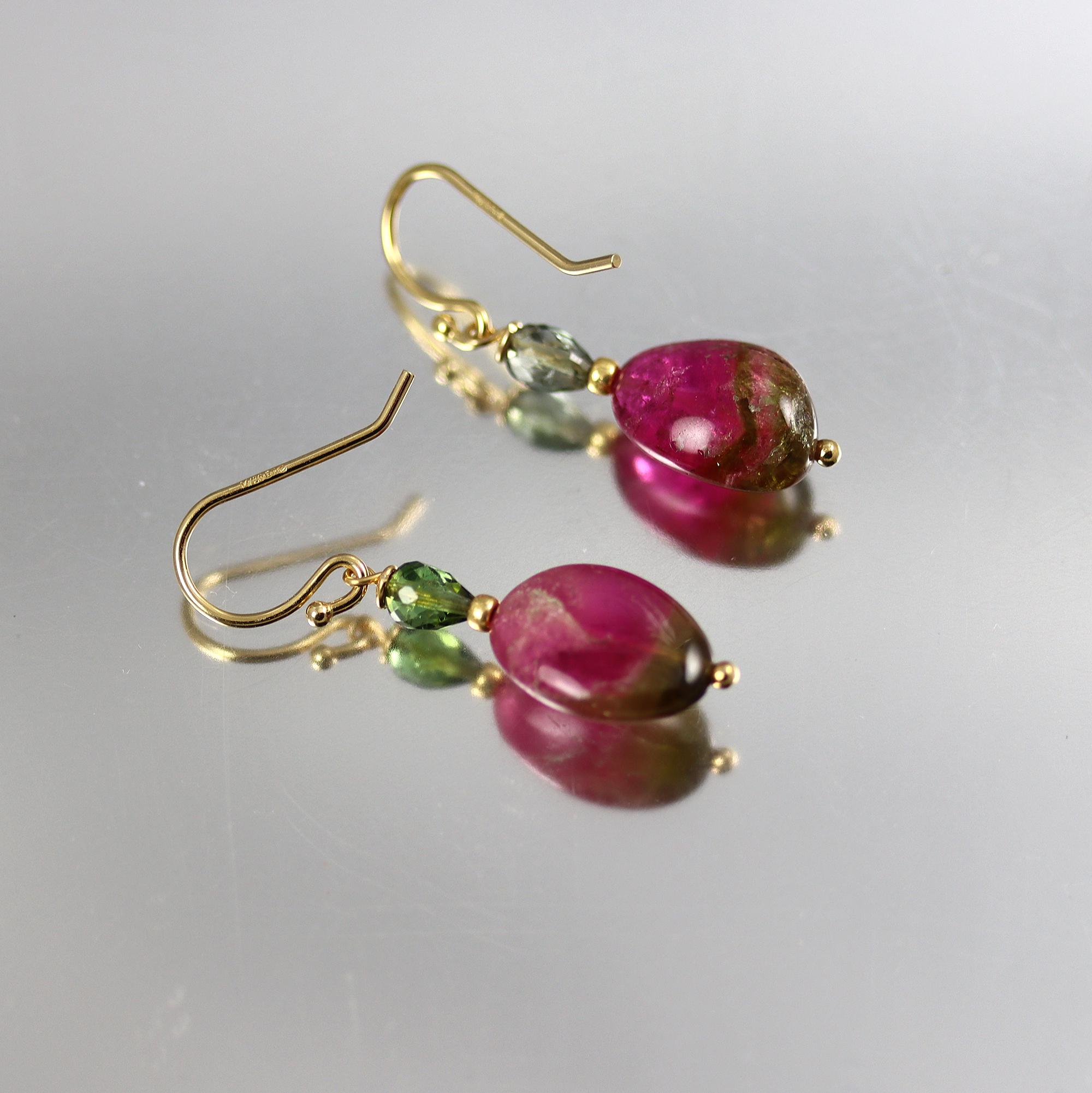 Beautiful watermelon Tourmaline nuggets are topped with green tourmaline upside down drops in these gold fill earrings. The nuggets measure 13 x 9mm and are pink on the top 2/3 and green on the bottom. Super nice quality. Gold fill french ear wires. From top to bottom they measure 1-1/4 inches.