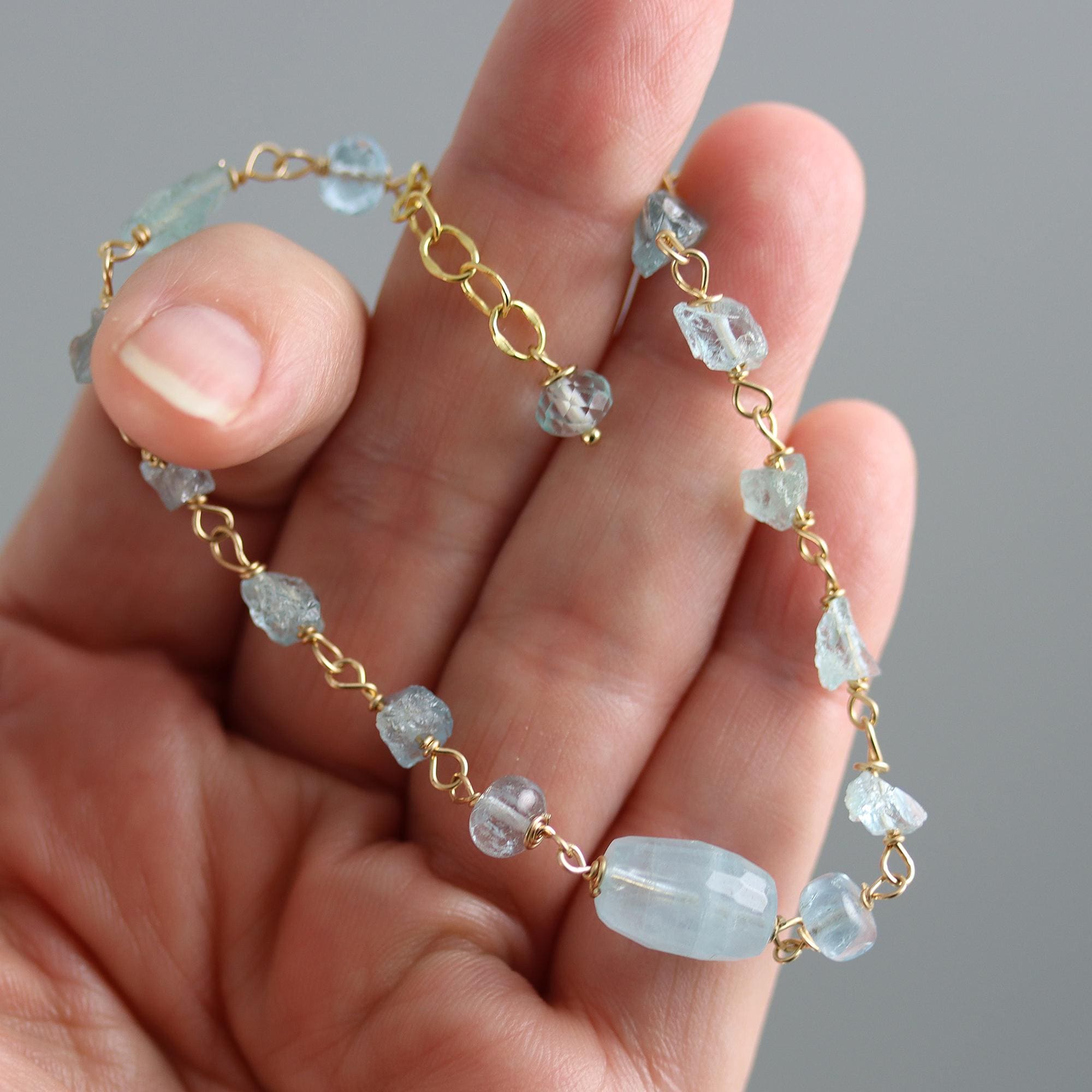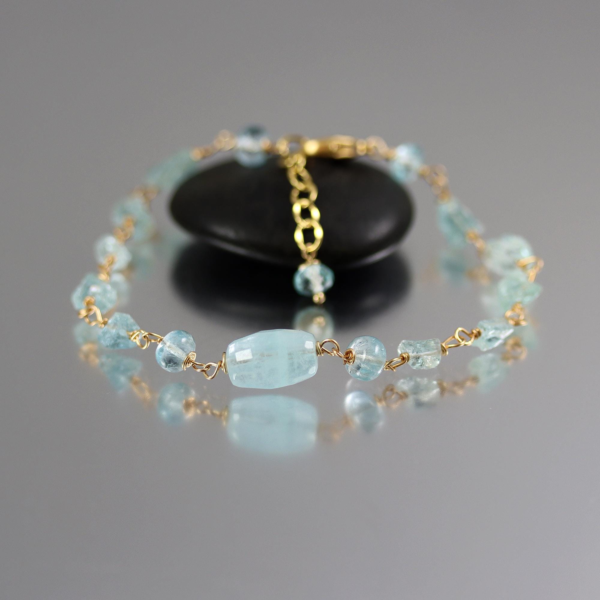 This aquamarine nugget bracelet has wonderful raw nuggets of aquamarine spaced with gold fill wire. Accented with a central Aquamarine drum and rondelles. The bracelet is adjustable from 7.5 to 8.5 inches long and ends in a gold fill lobster clasp.