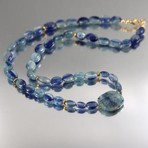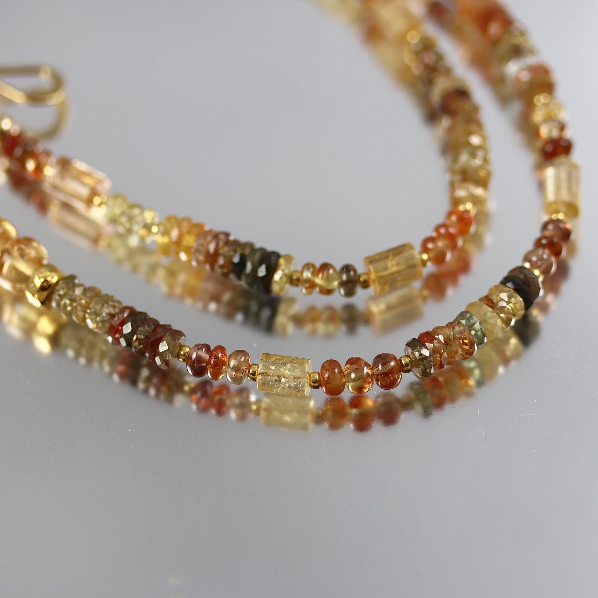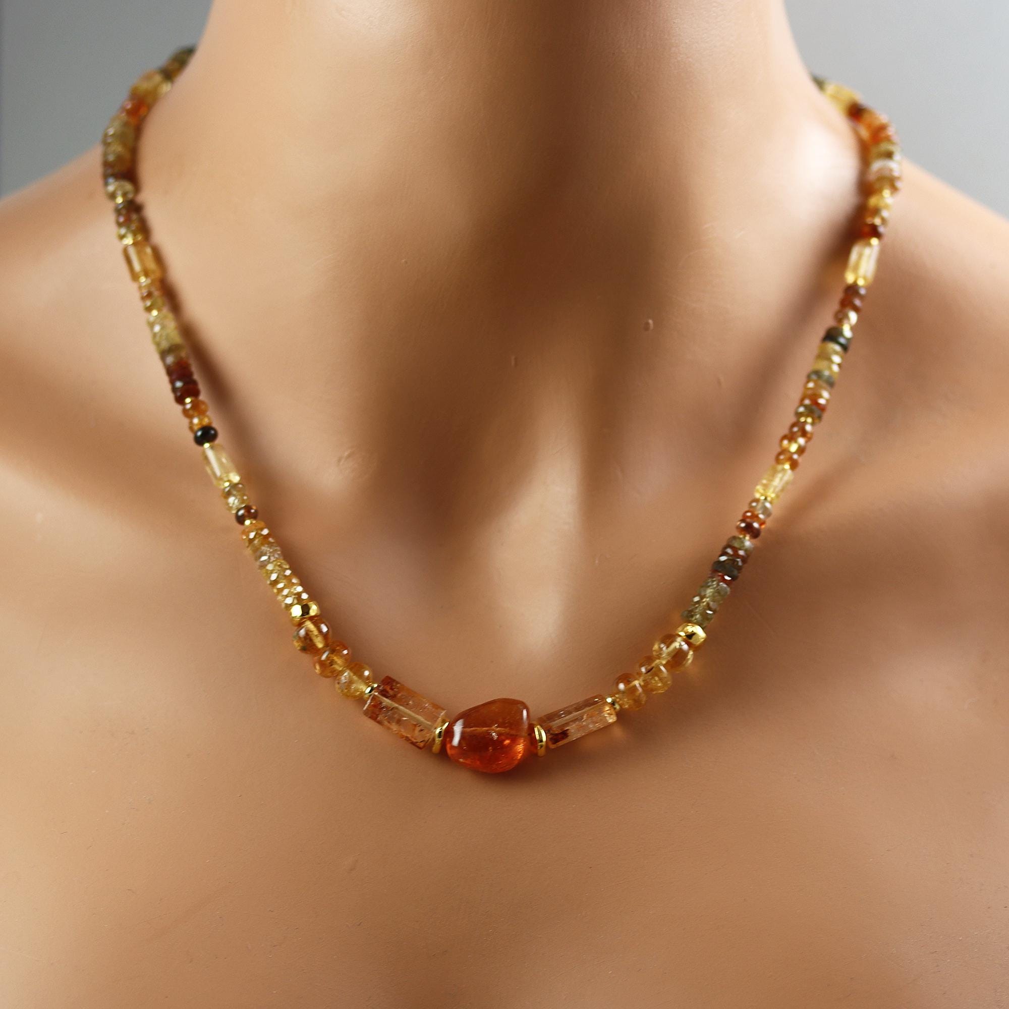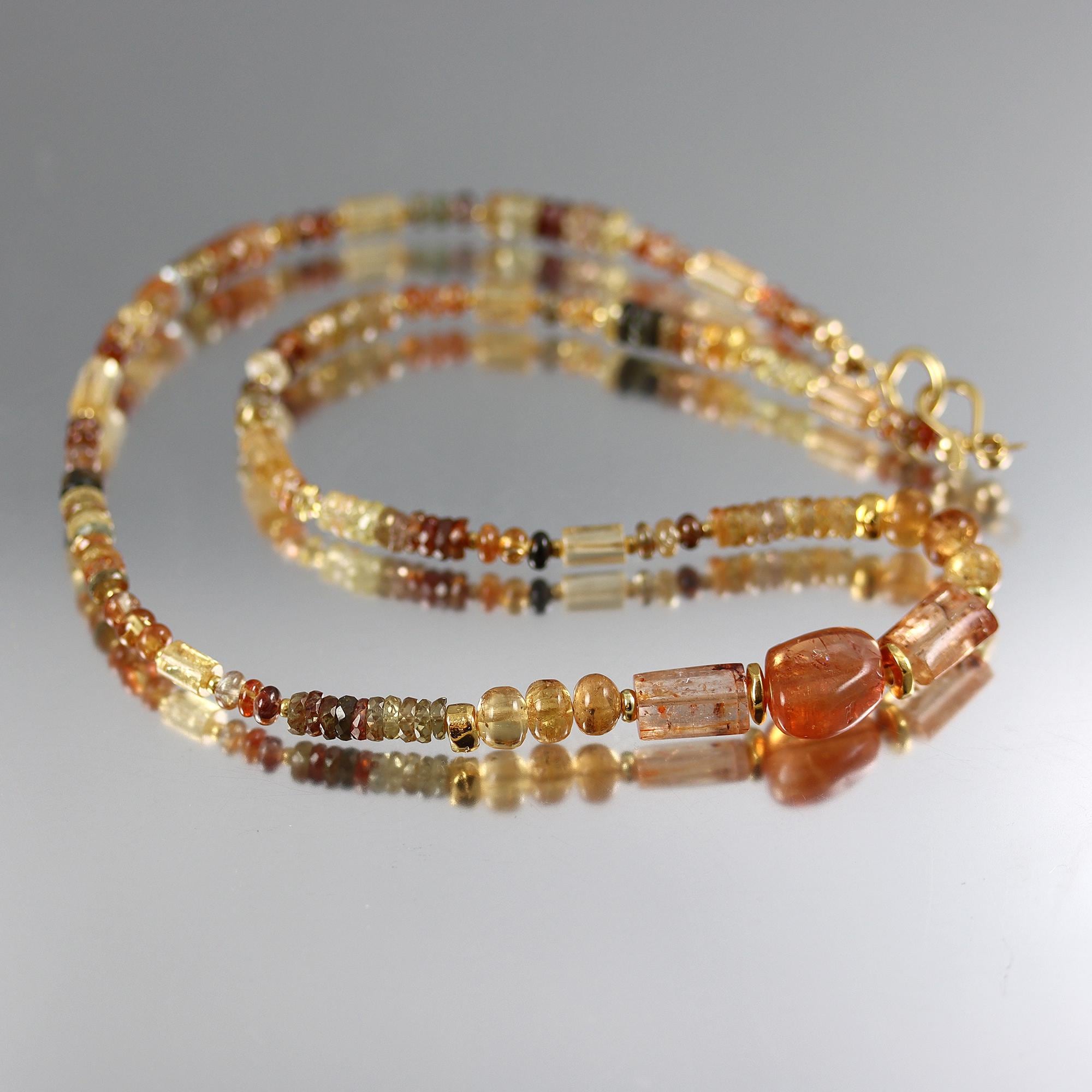 A gorgeous strand of mixed Natural Zircon rondelle and heishi beads in shaded Ombre colors. At front and within the zircon a mix of Imperial topaz beads, 6 rondelles, 8 tubes, 2 rectangles and a large nugget. The necklace ends in a gold fill hook clasp and is 19.5 inches long.