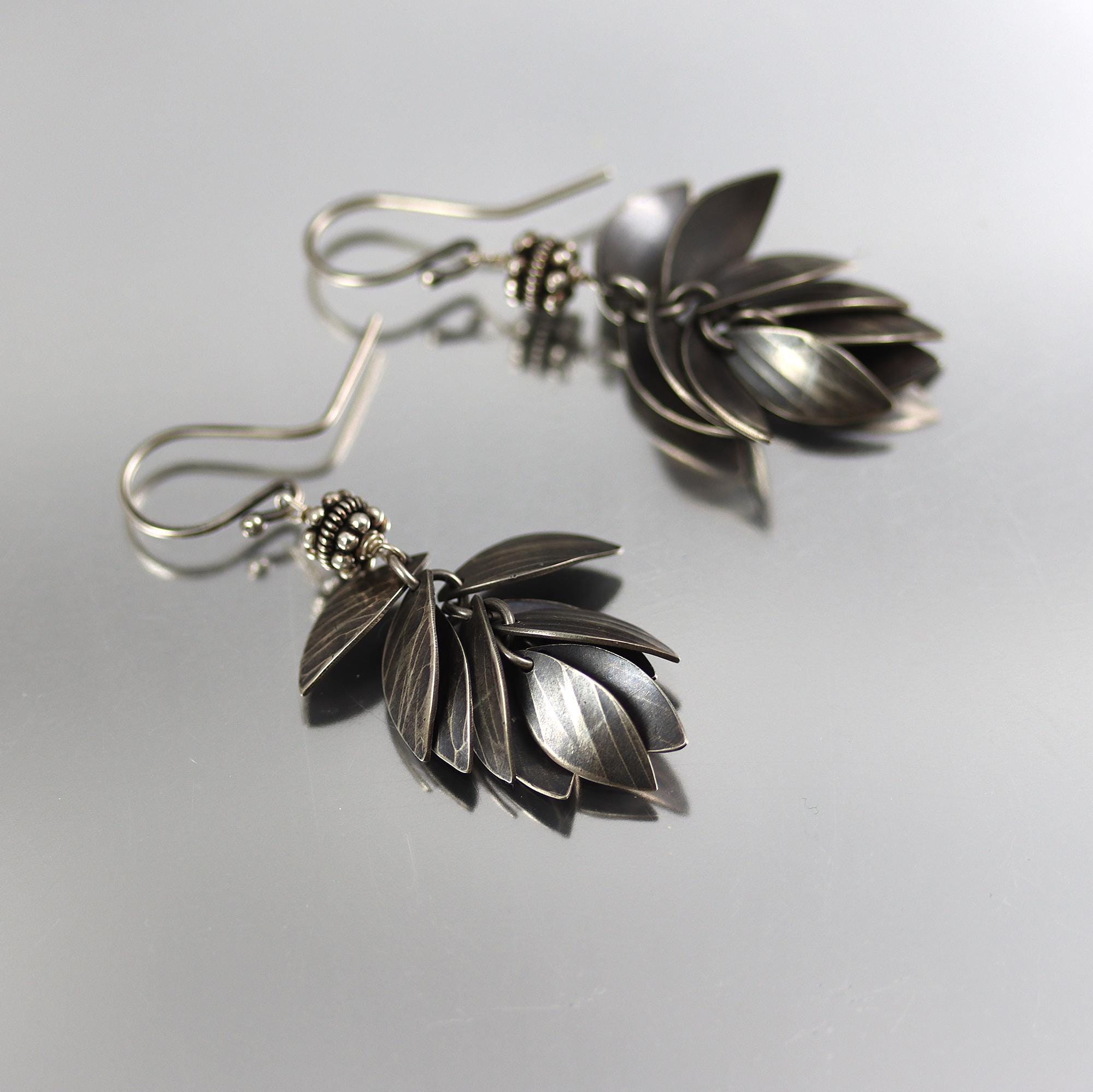 Oxidized sterling silver earrings with a leaf cluster accented by a lovely rondelle. French ear wires. From top to bottom they measure a touch under 1-3/4 inches.