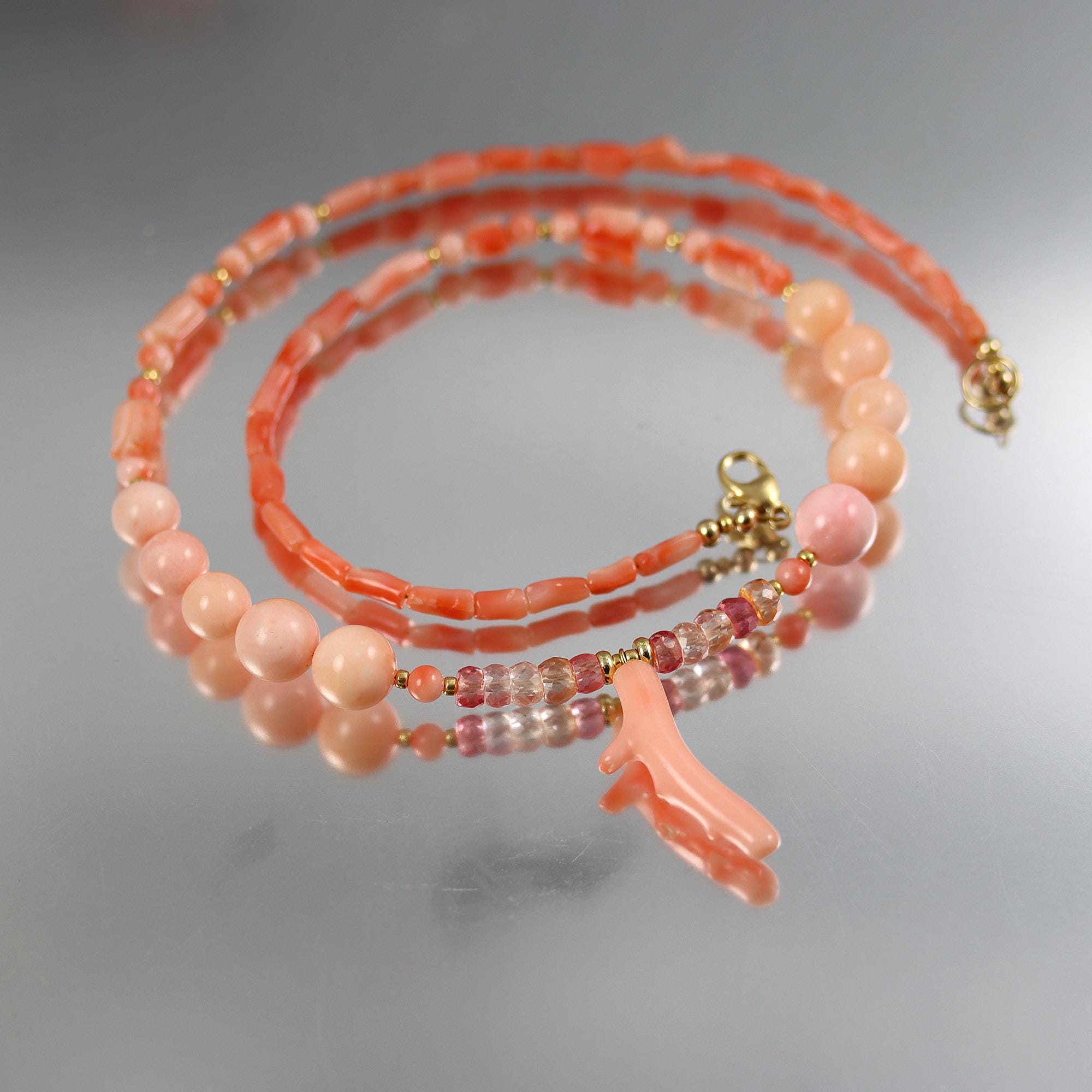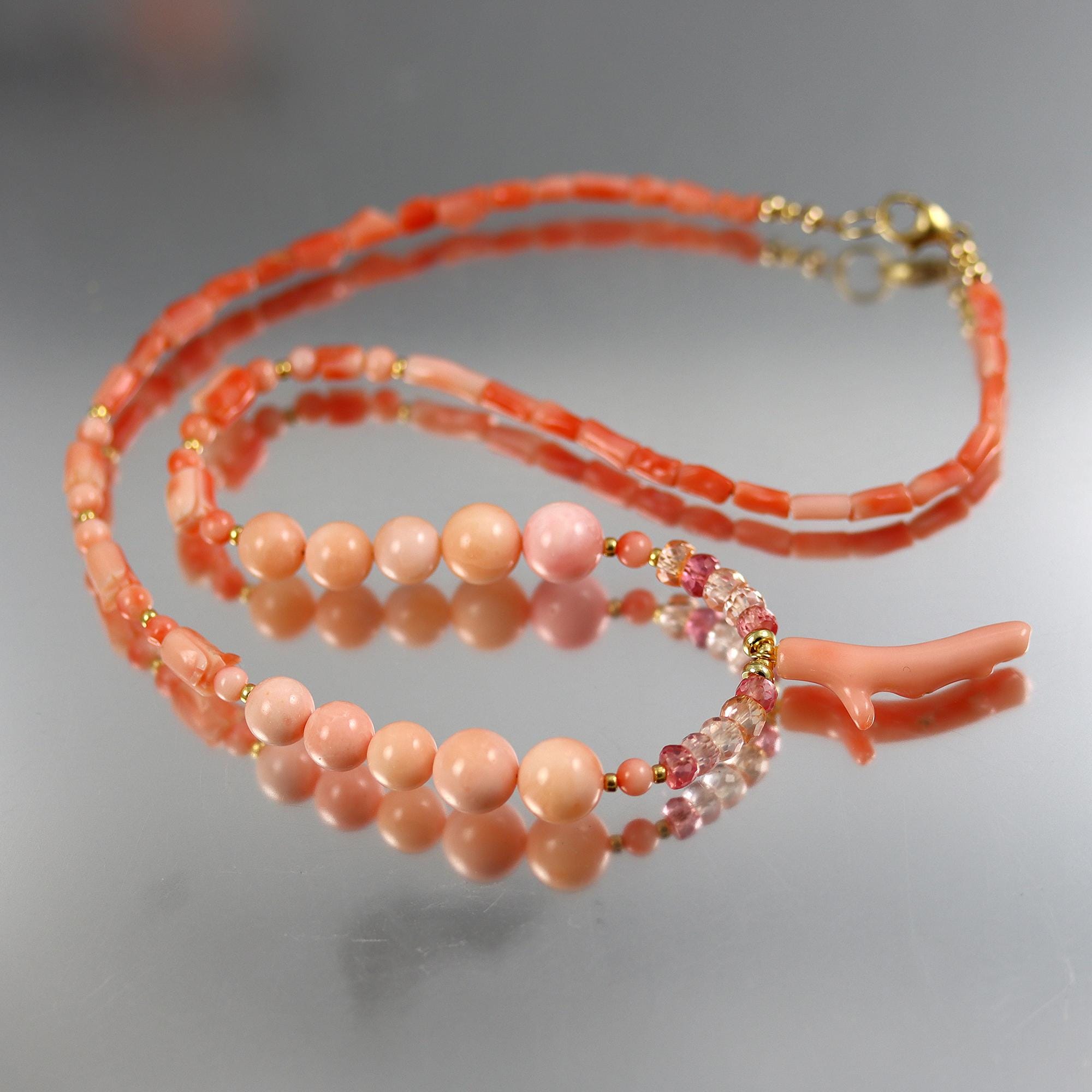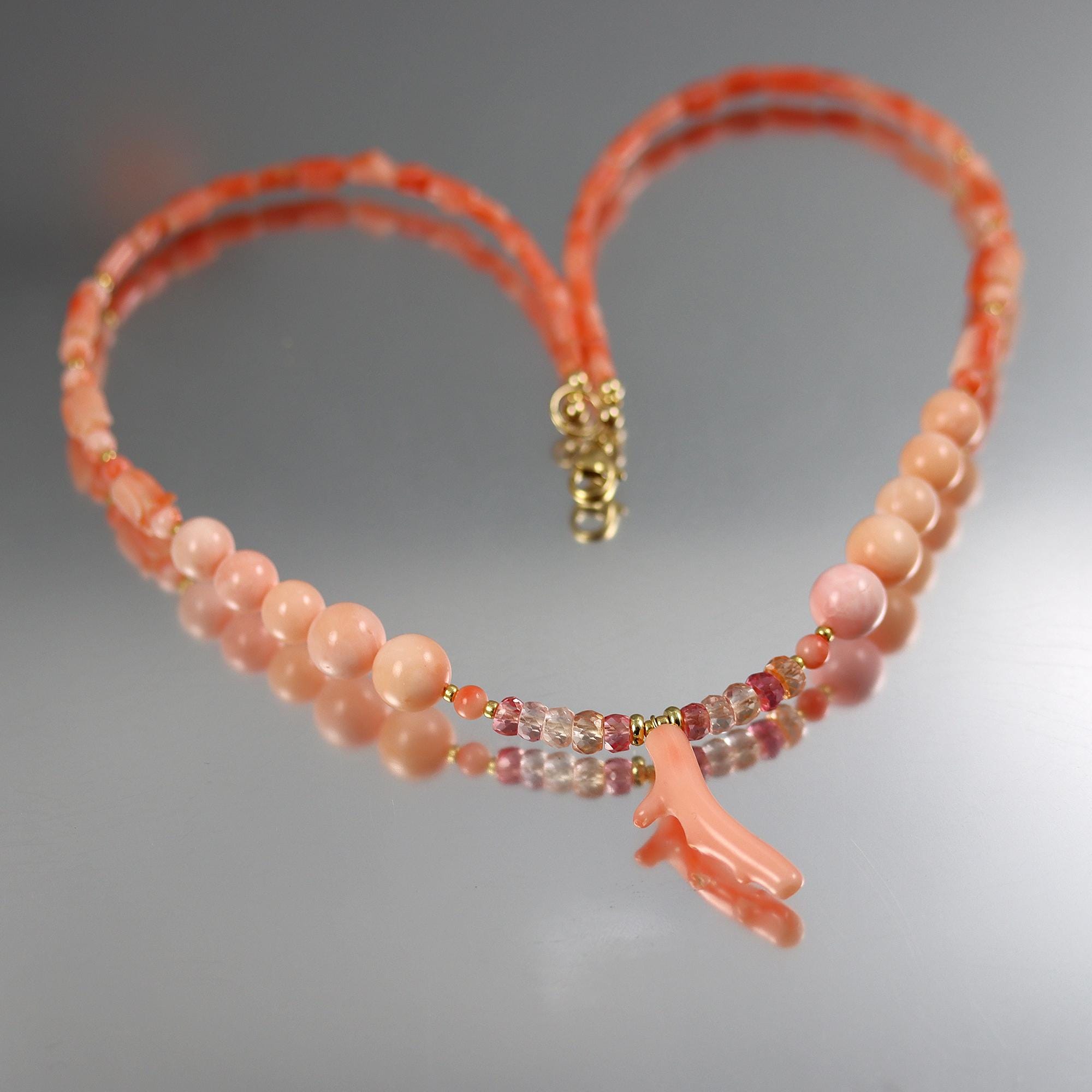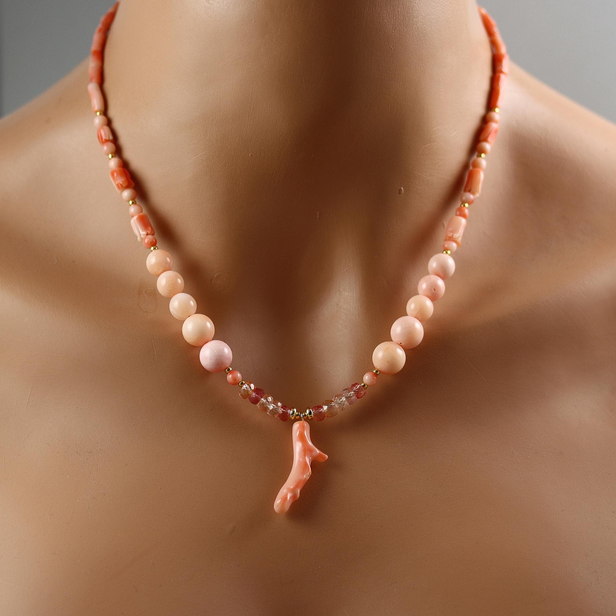 Beautiful Angel Skin coral round, Tulip and stick beads combine in this necklace. At center is a coral branch sided by faceted Sapphire rondelles. Moving out from center, round beads, then Tulip beads, then branches. The necklace is 17.5 inches long and ends in a gold fill lobster clasp.