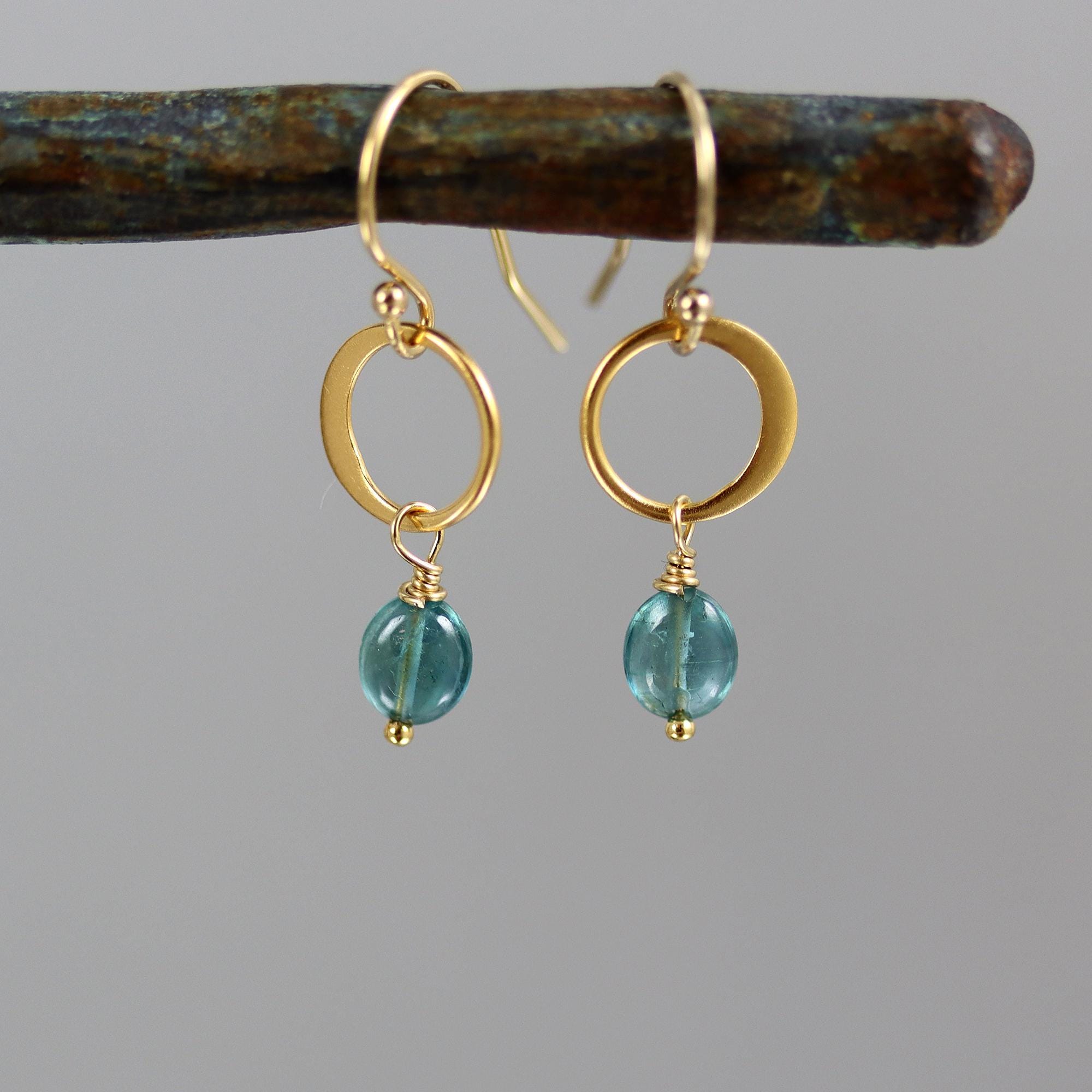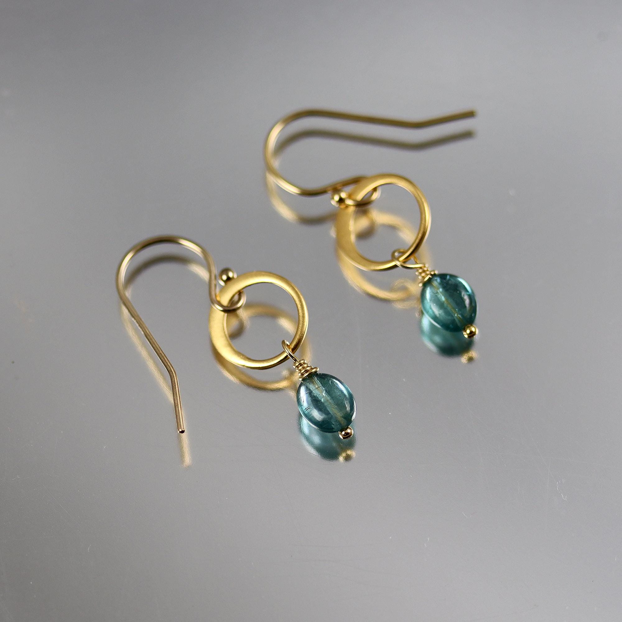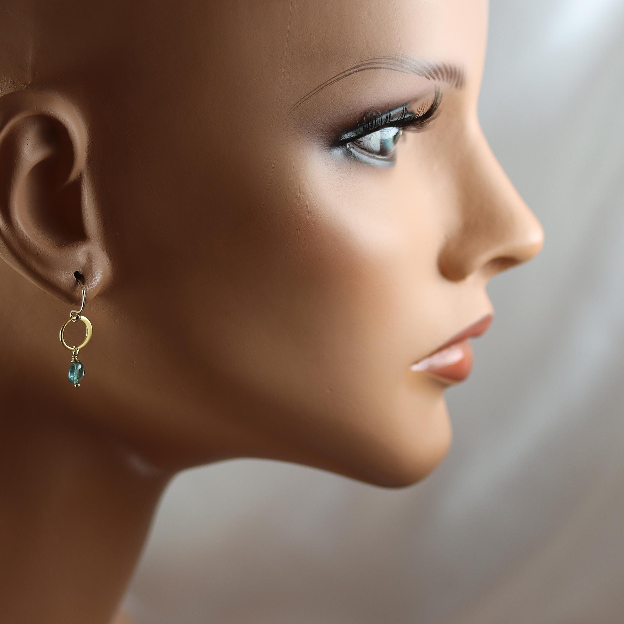 These earrings have gorgeous blue tourmaline ovals dangling from 24k heavy gold over sterling silver mini hoops and gold fill french ear wires. This is similar to vermeil, except the gold layer is 20 times thicker and therefore higher quality. From top to bottom they measure 1 inch. Petite.
