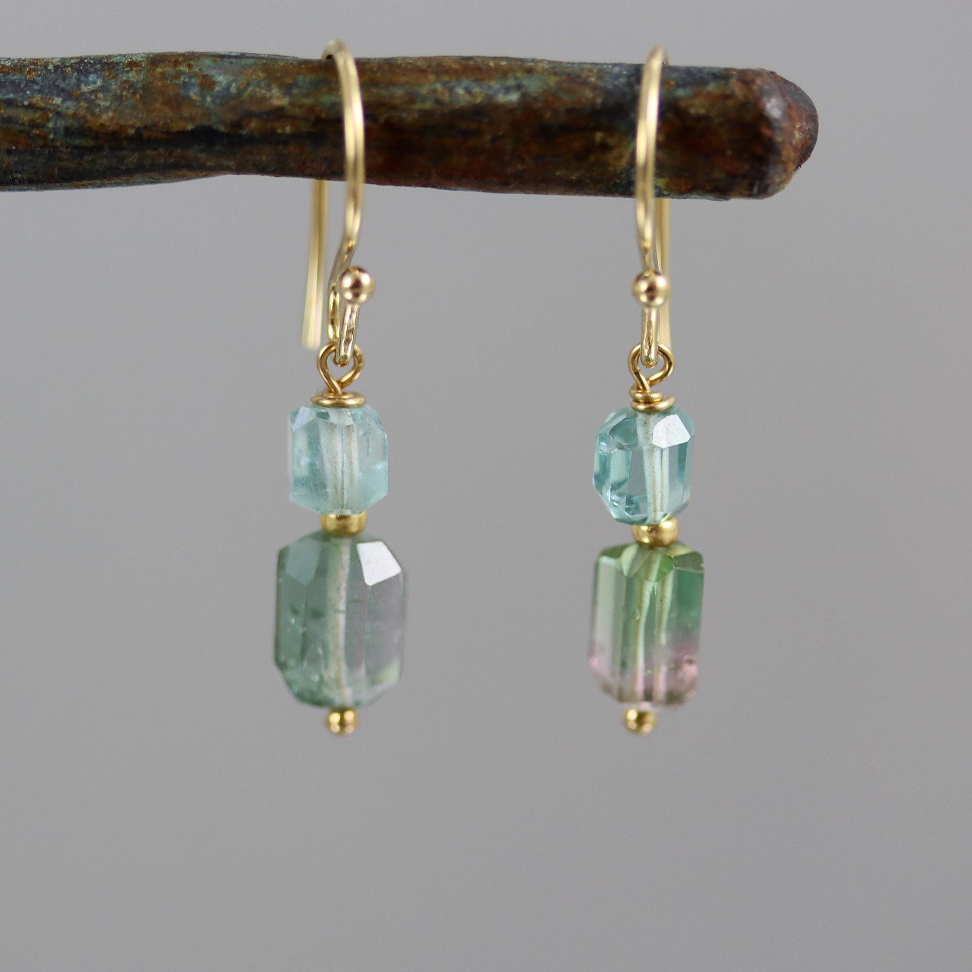 Georgeous high quality blue green (with a little pink) crystals of Tourmaline hang in duos from gold fill french ear wires. From top to bottom they measure 1-1/4 inches. Petite.