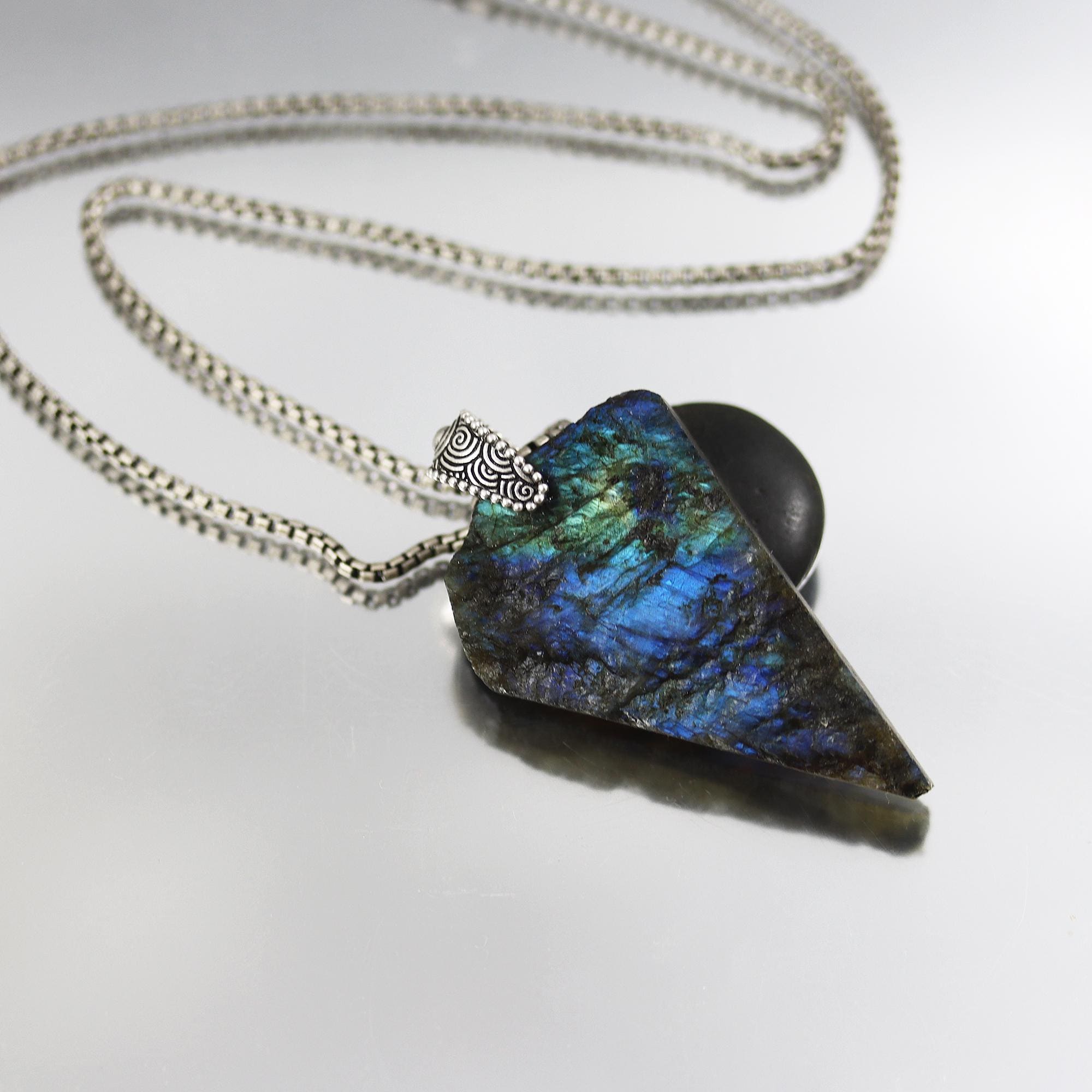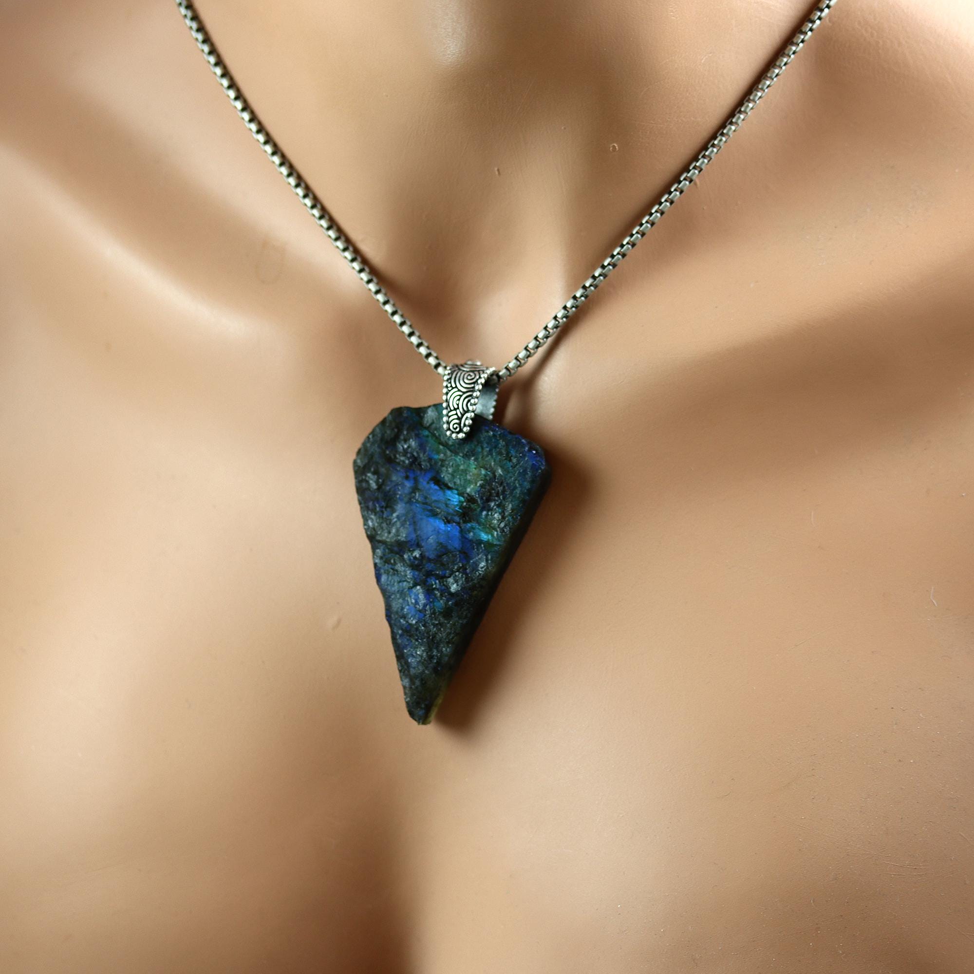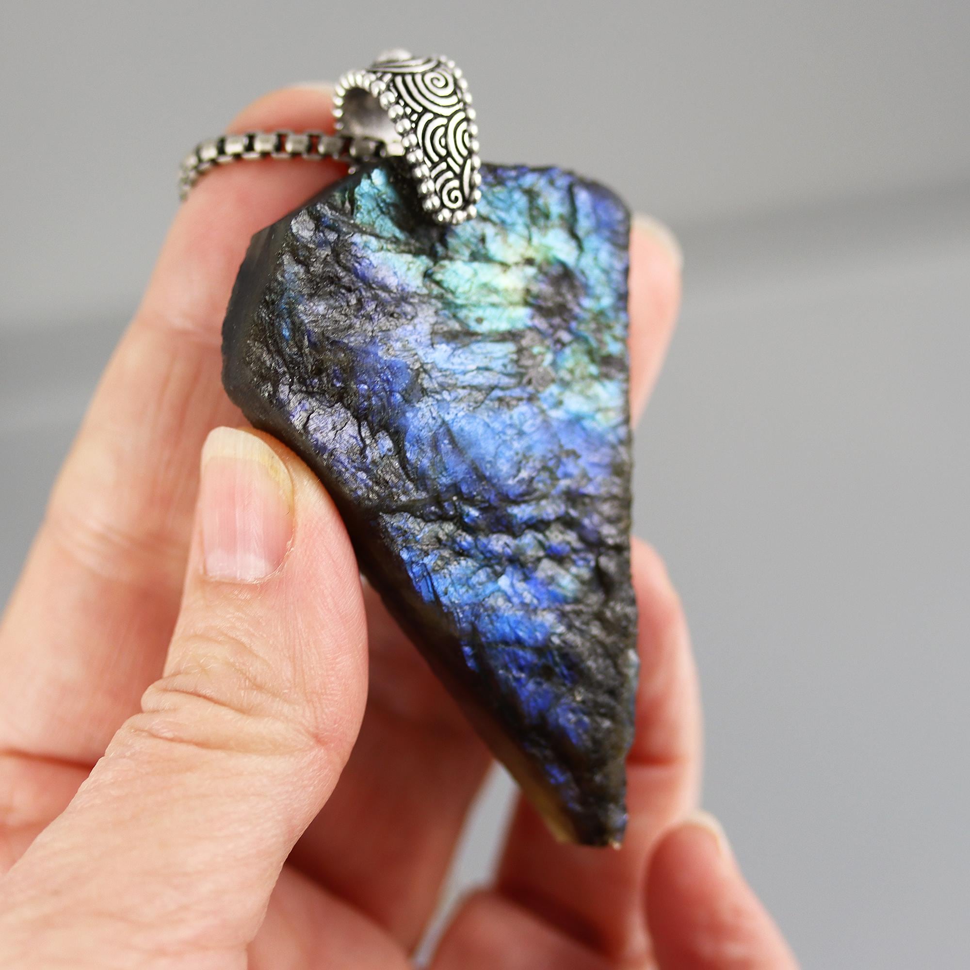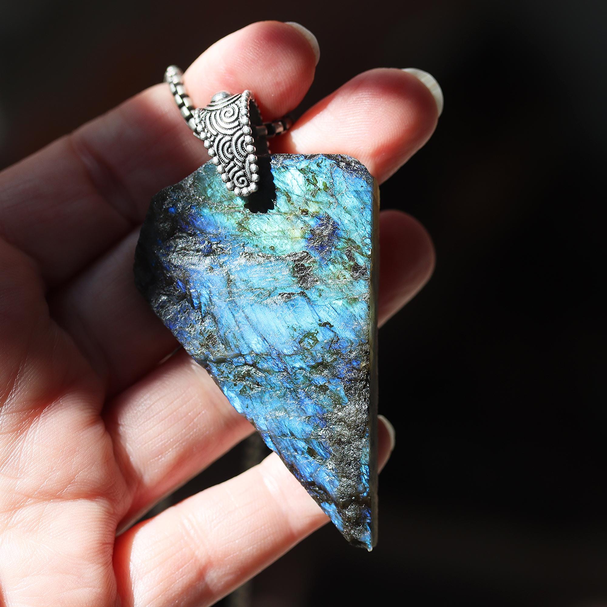 This Labradorite Pendant Necklace has a stunning raw specimen of labradorite with great blue/green flash. The rough surfaces really bring out the flash! This is a large 63mm tall stone hanging from a sterling silver bail and sterling 24 inch gunmetal finished chain.