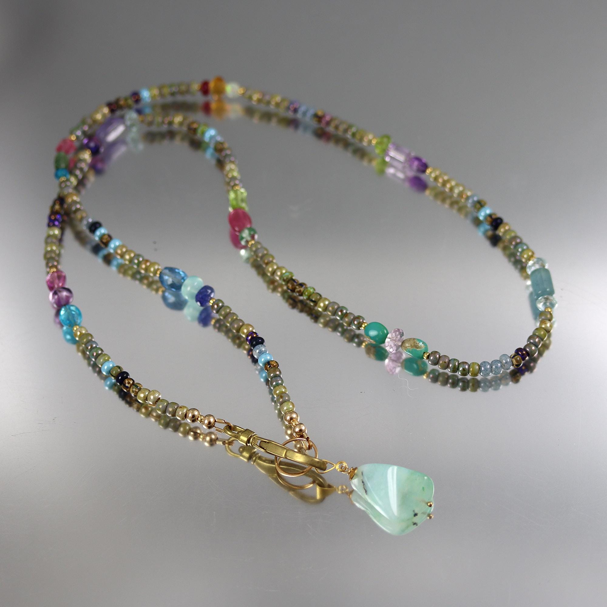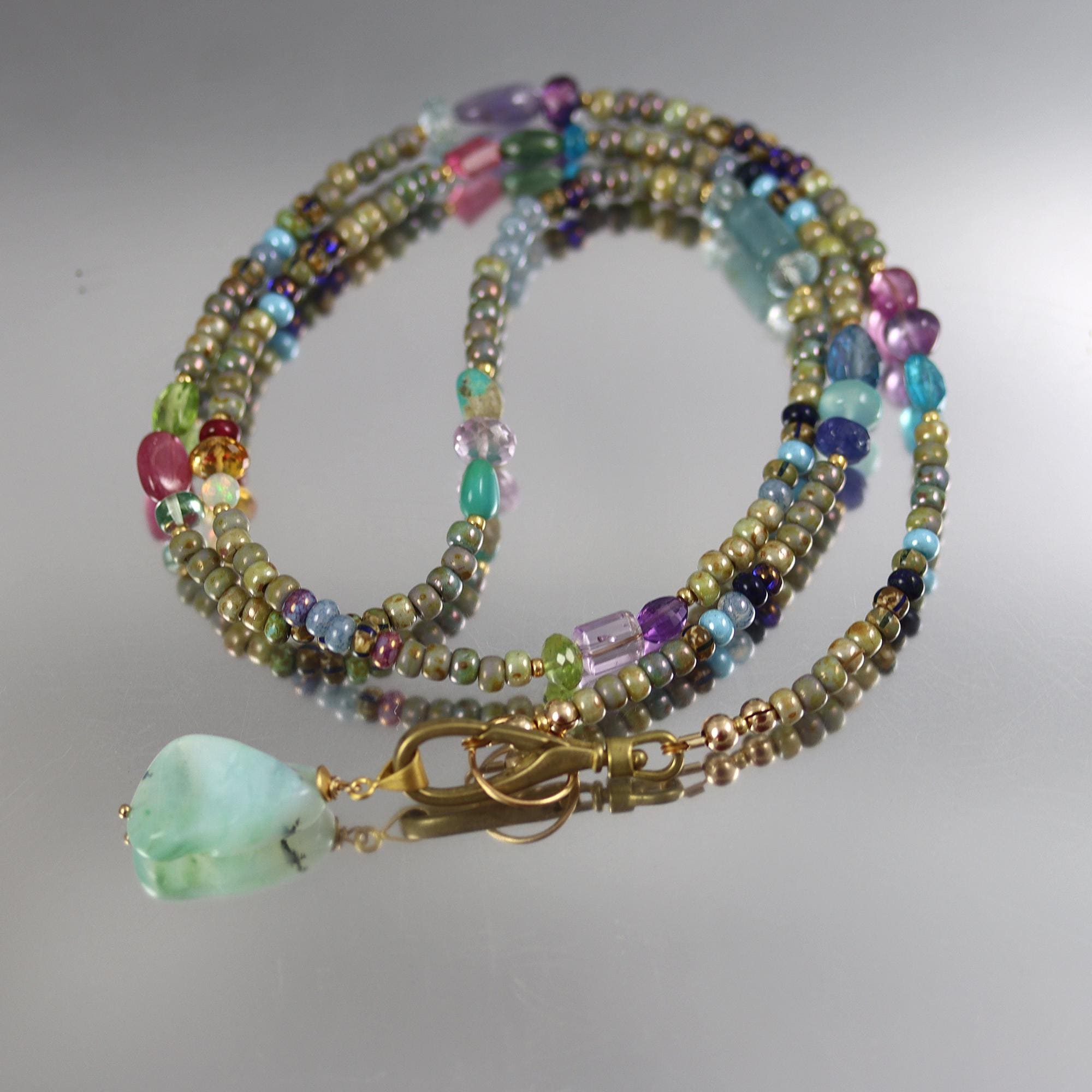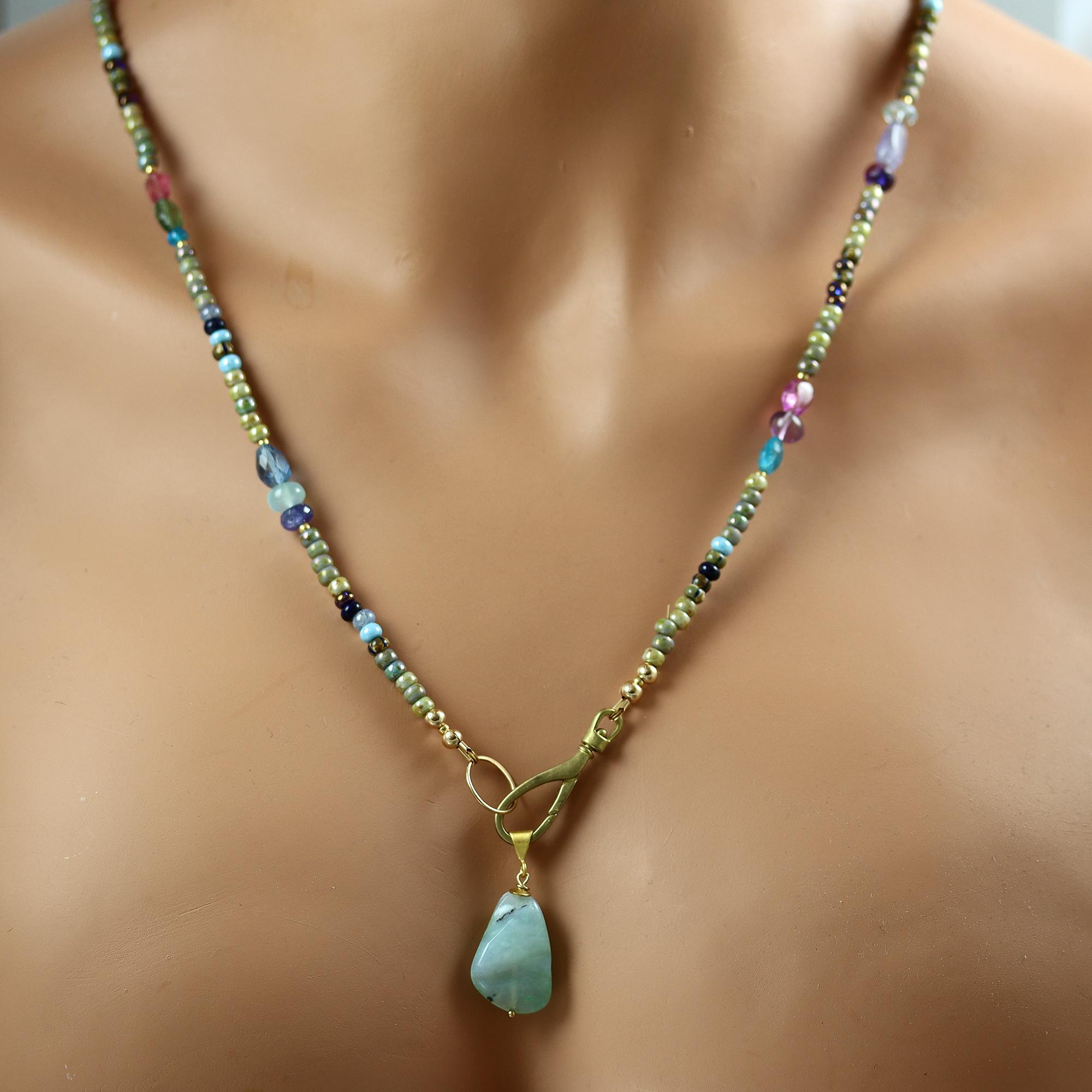 Based in earthy colors glass beads, I have added colorful gems in trios along the length. The necklace ends in a brass lobster clasp, which can be worn at the neck without the pendant or at the front with the pendant. The pendant is a Peruvian Blue Opal nugget. The necklace is 26 inches long and the pendant hangs down another 1-1/4 inches. Gems included are: apatite, amethyst, sapphire, tanzanite, aquamarine, peridot, ruby, green amethyst, turquoise, opal, citrine, pink tourmaline, green apatite, london blue topaz, and chalcedony.