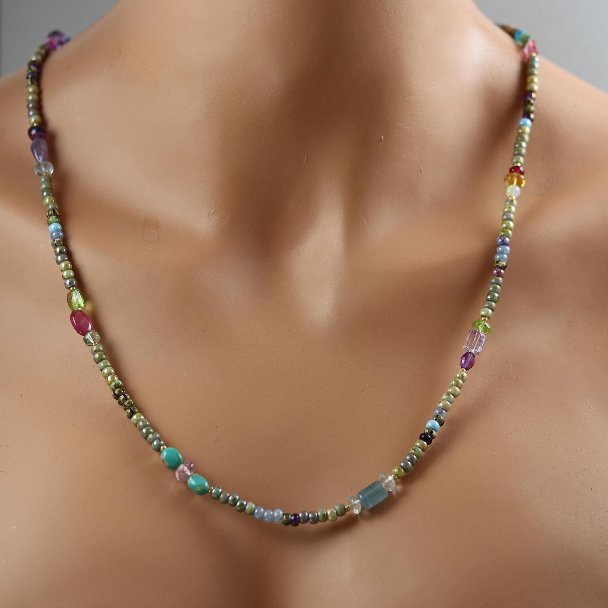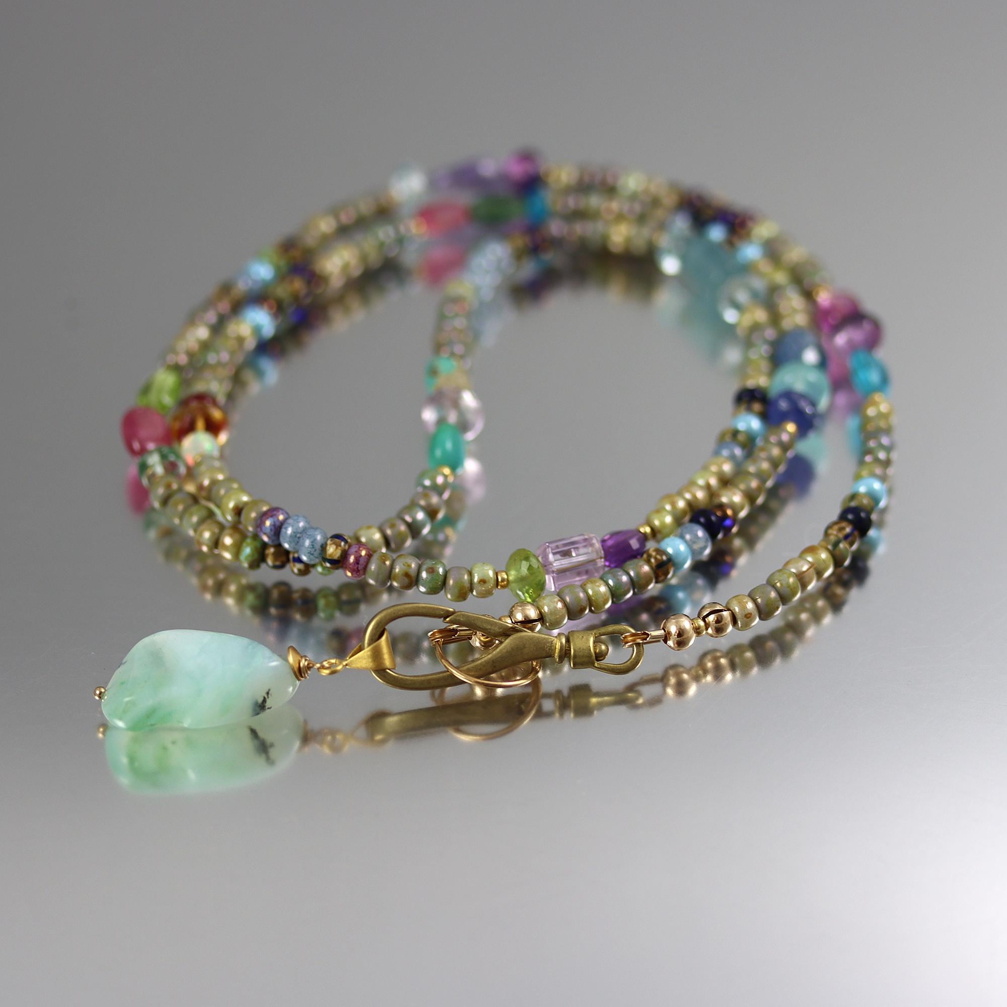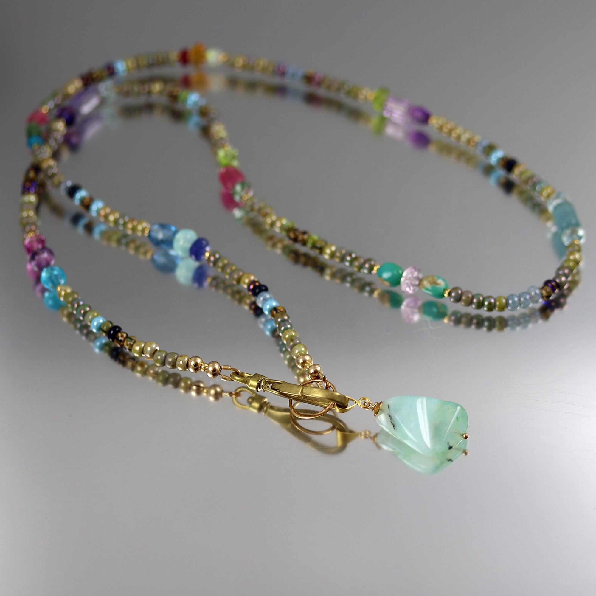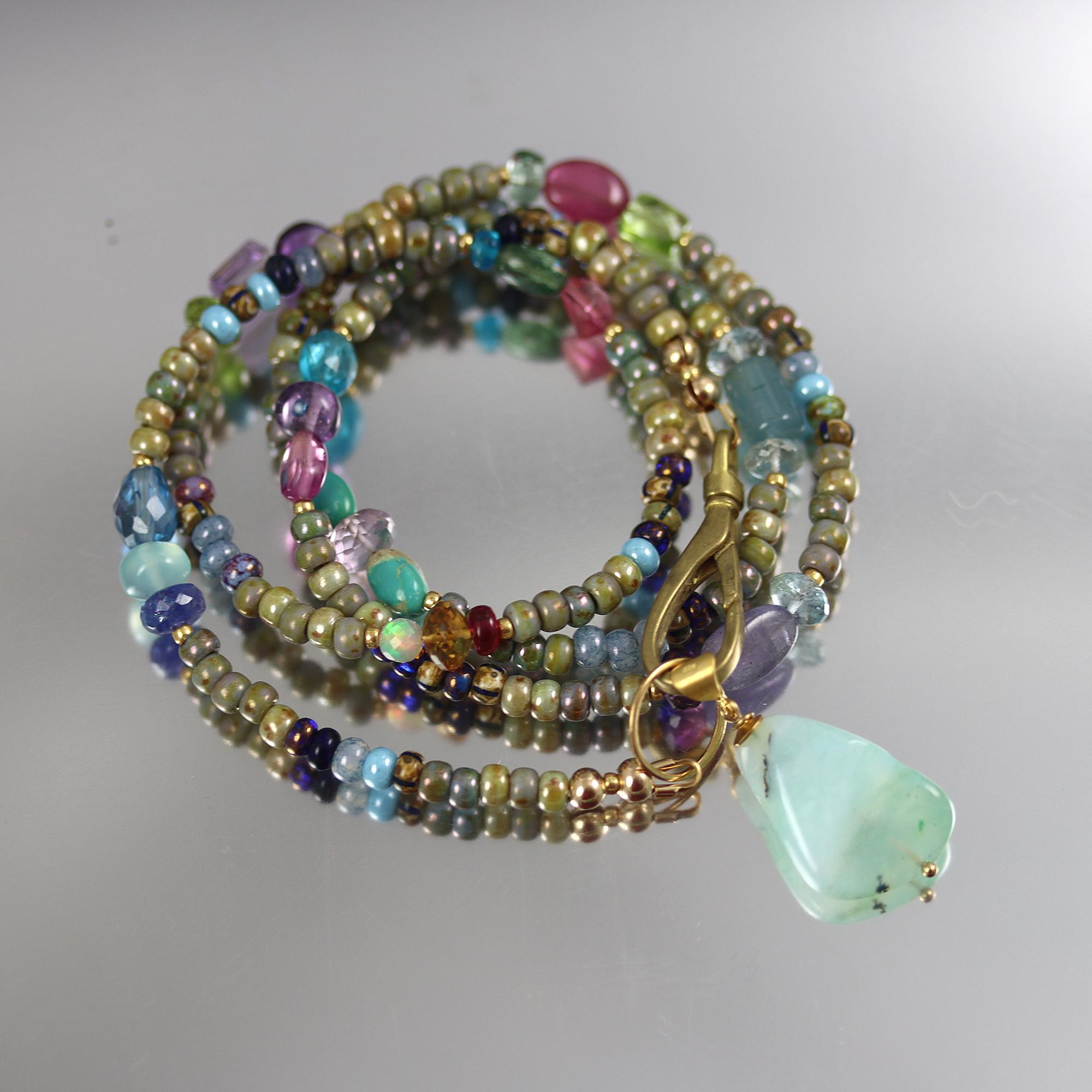 Based in earthy colors glass beads, I have added colorful gems in trios along the length. The necklace ends in a brass lobster clasp, which can be worn at the neck without the pendant or at the front with the pendant. The pendant is a Peruvian Blue Opal nugget. The necklace is 26 inches long and the pendant hangs down another 1-1/4 inches. Gems included are: apatite, amethyst, sapphire, tanzanite, aquamarine, peridot, ruby, green amethyst, turquoise, opal, citrine, pink tourmaline, green apatite, london blue topaz, and chalcedony.