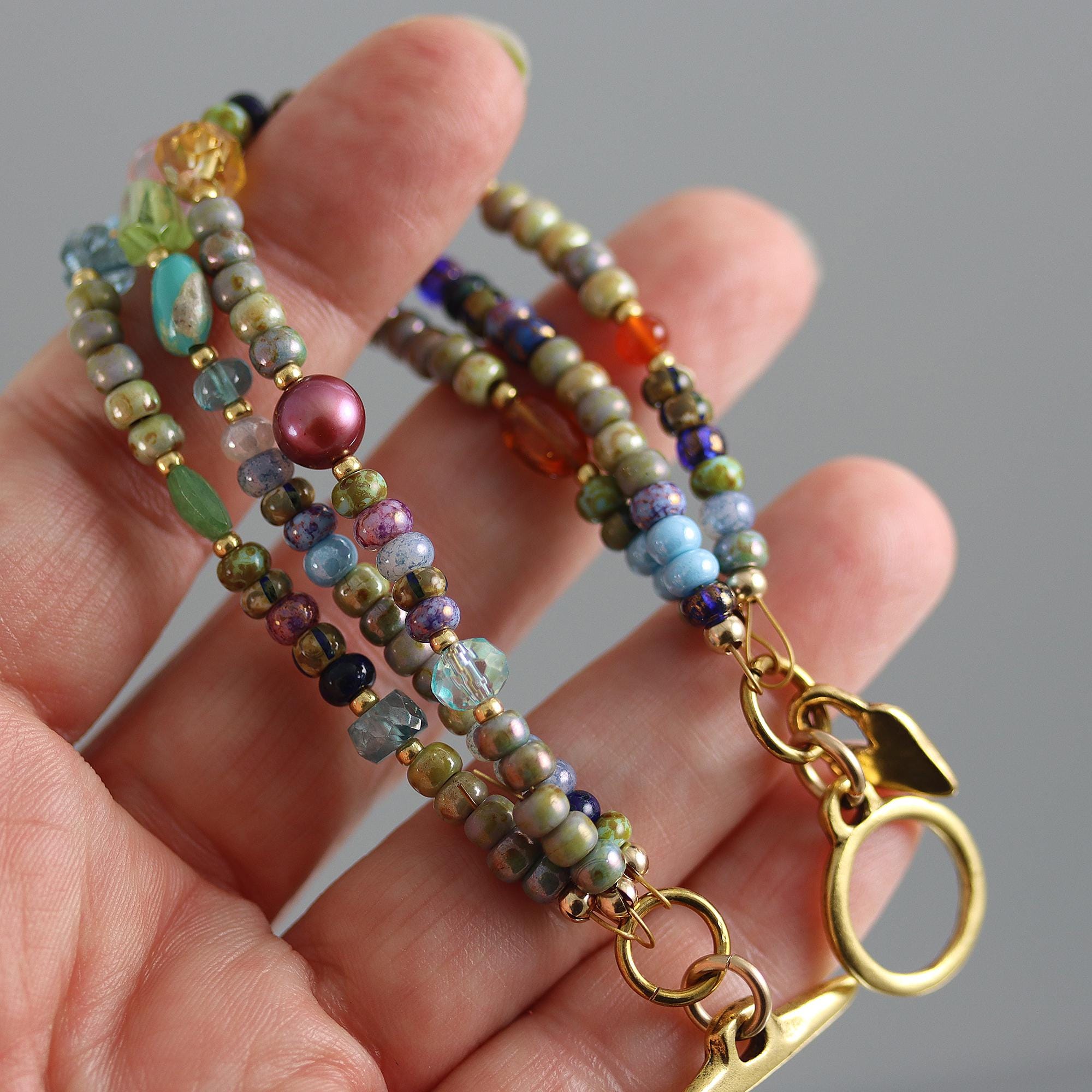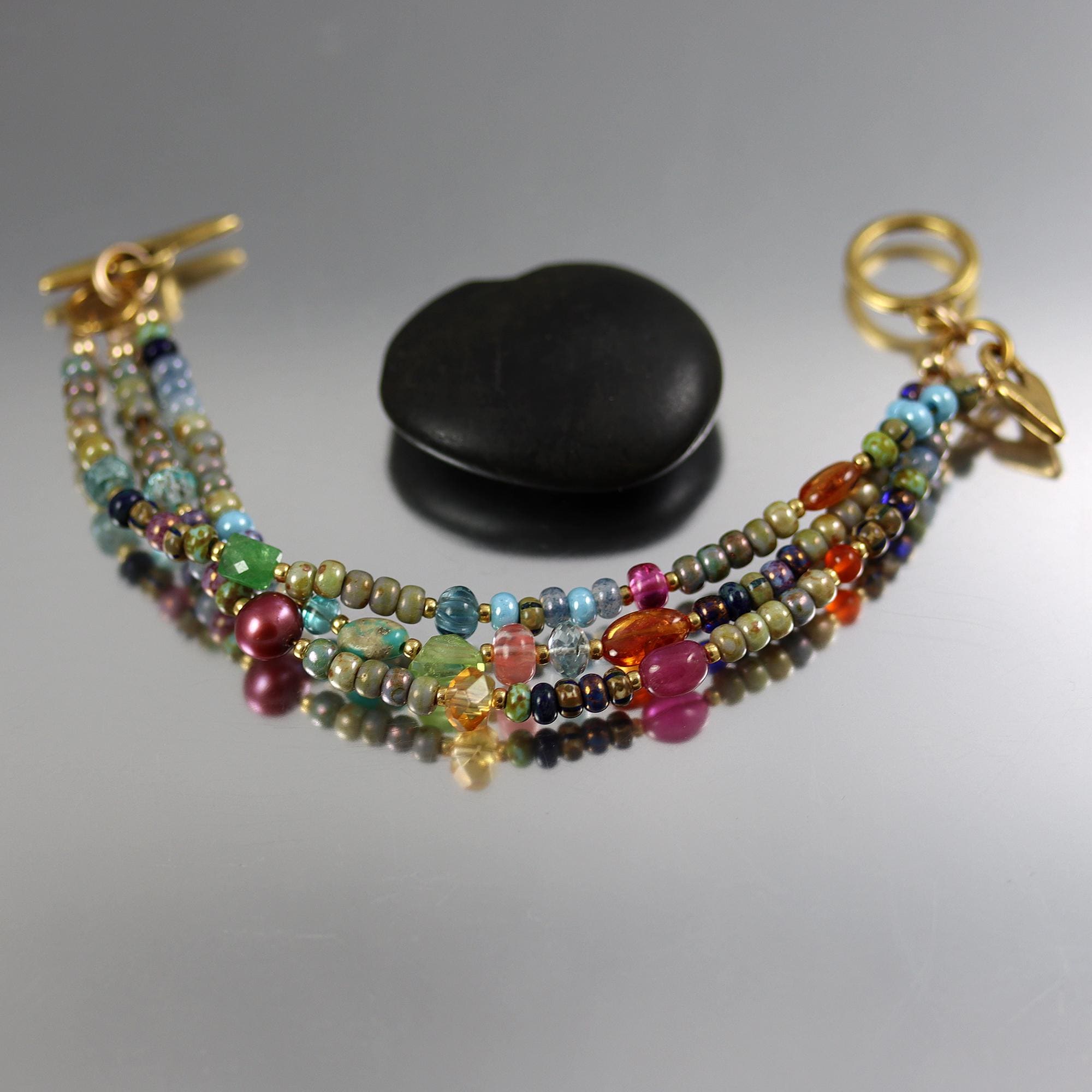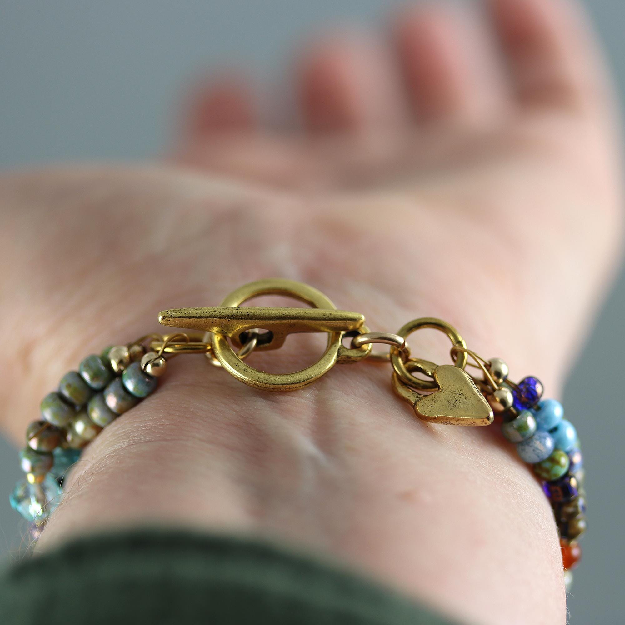 Based in earthy colors glass beads, I have added colorful gems the length of each strand in this 3 strand bracelet. The bracelet ends in a antique gold pewter toggle clasp. The bracelet will fir 6 to 6.75 inch wrist. A heart charm near the clasp. (I could lengthen it with jump rings)