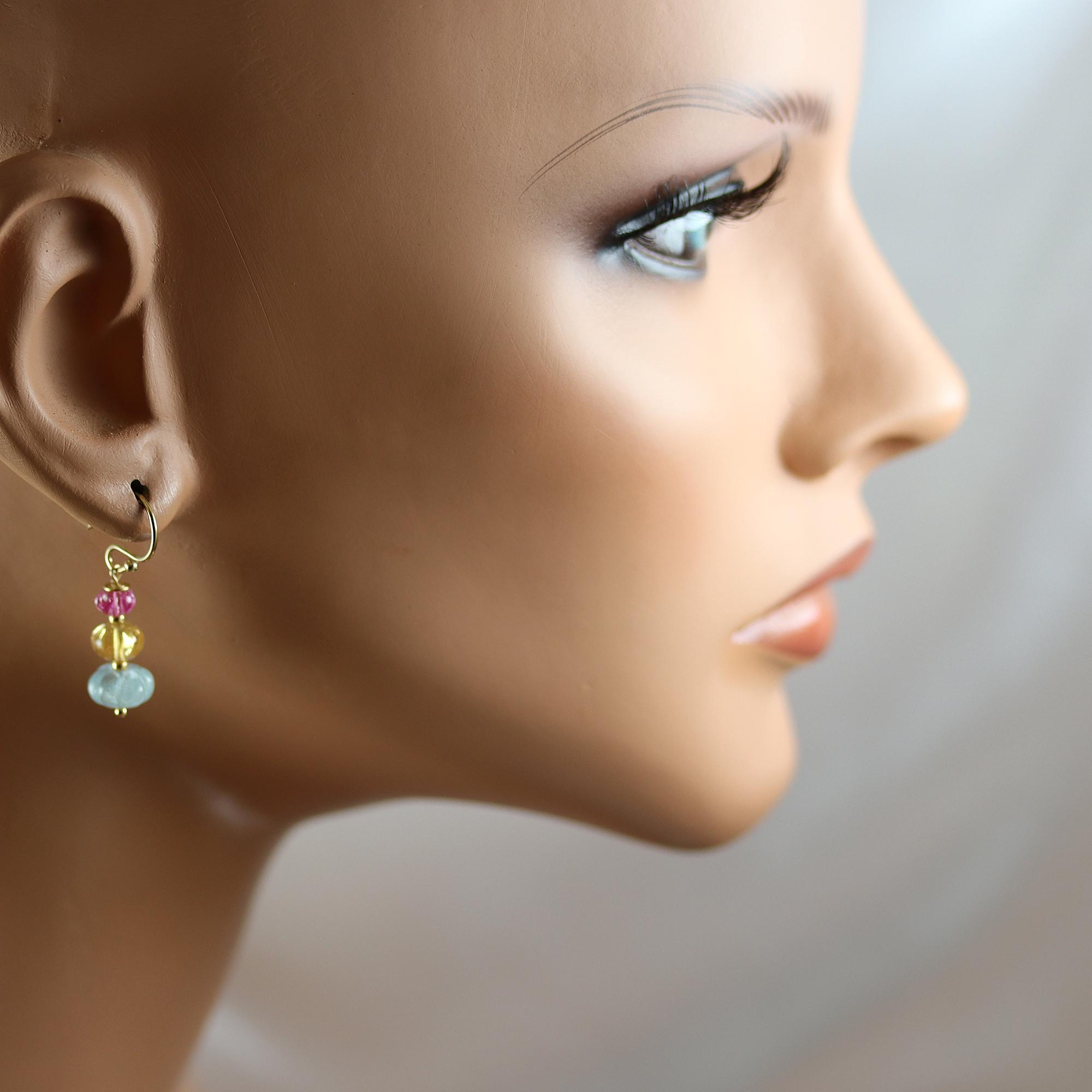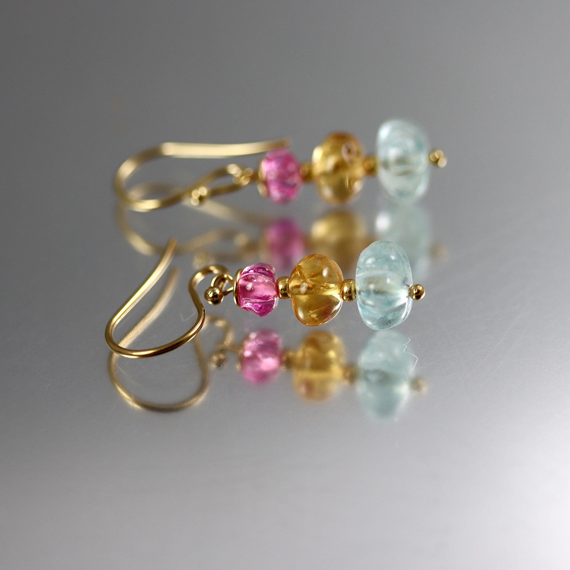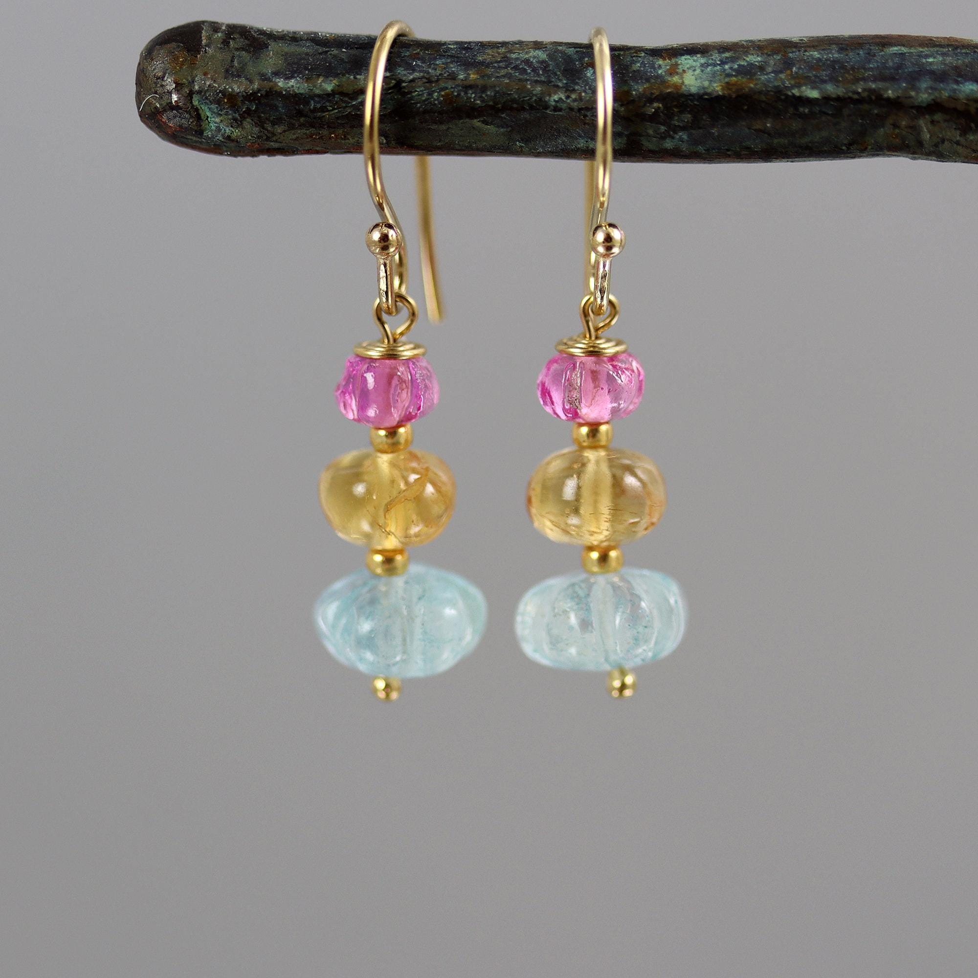 This pair of earrings features a linear trio of gems in Imperial Topaz, Aquamarine, and Pink Sapphire. 7mm Aquamarine pumpkins, 6mm Imperial topaz rondelles and 4mm Pink Sapphire pumpkins. They dangle from gold fill french ear wires and measure 1-1/4 inches from top to bottom