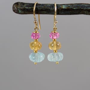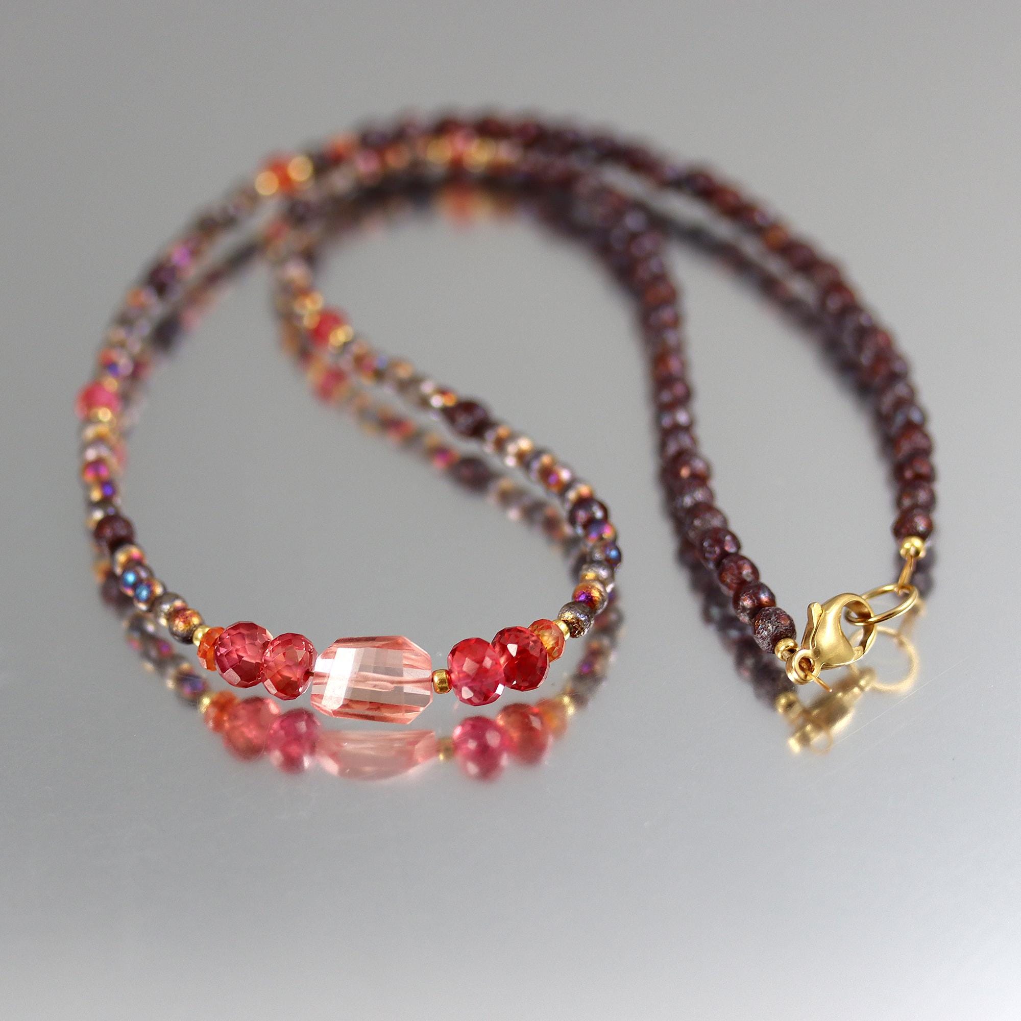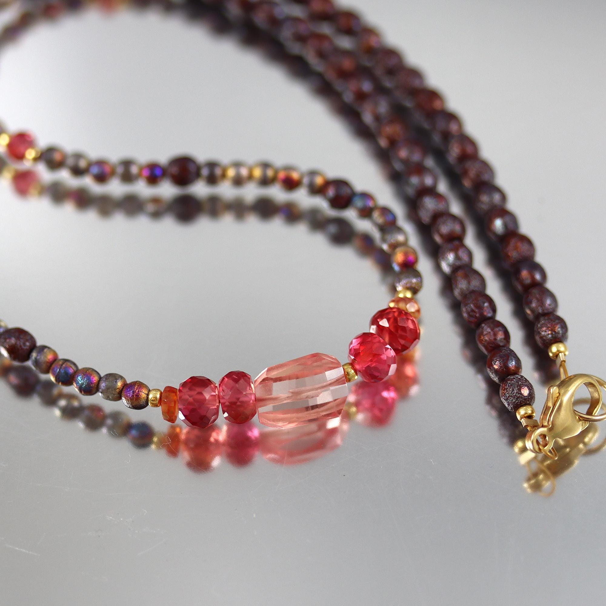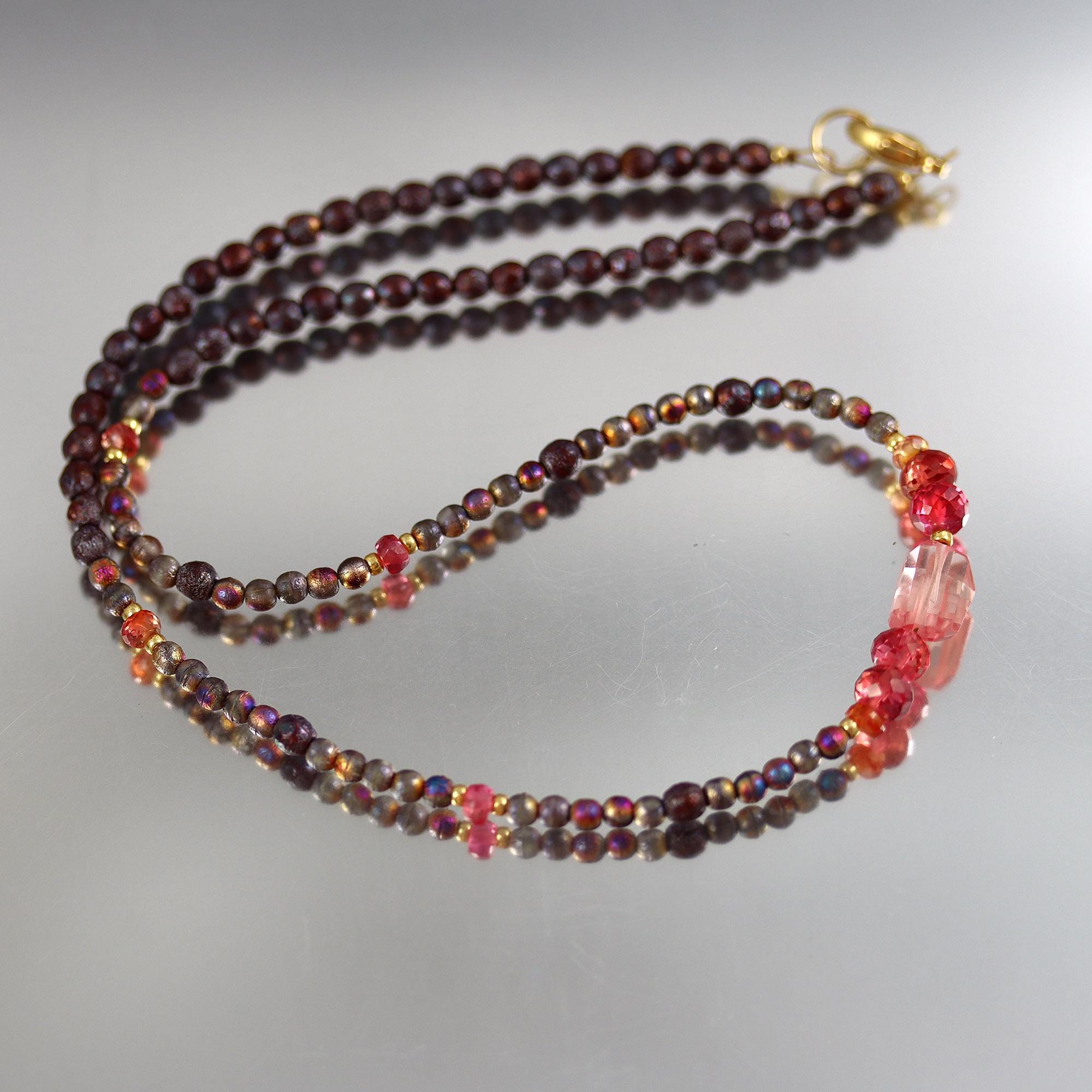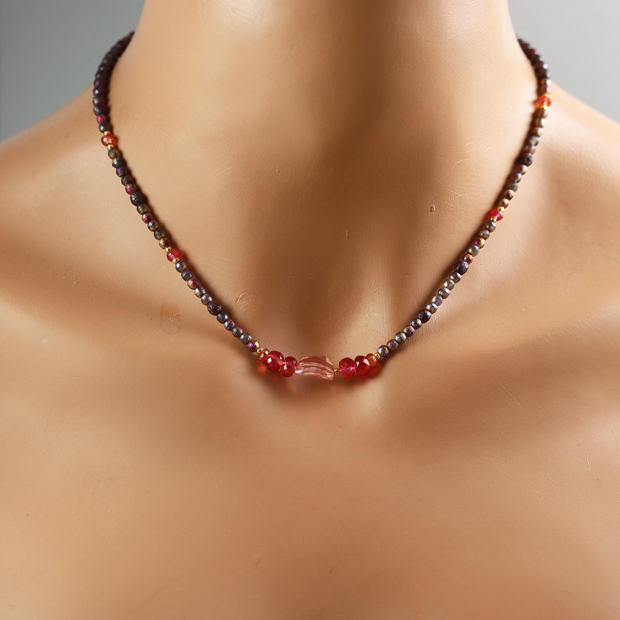 Faceted peach and red/orange lab Sapphire rondelles and nuggets and at center and spaced along the necklace. The remainder of the necklace is rustic and colorful glass beads. Full length 16.5 inches, ending in a gold fill lobster clasp.
