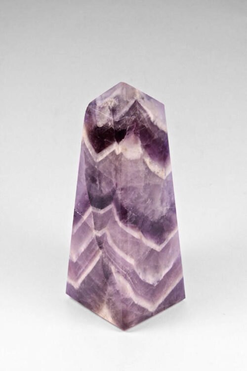 Chevron Amethyst displays v-shaped chevrons of deep purple and white Quartz that “seep” into beautiful layers.
