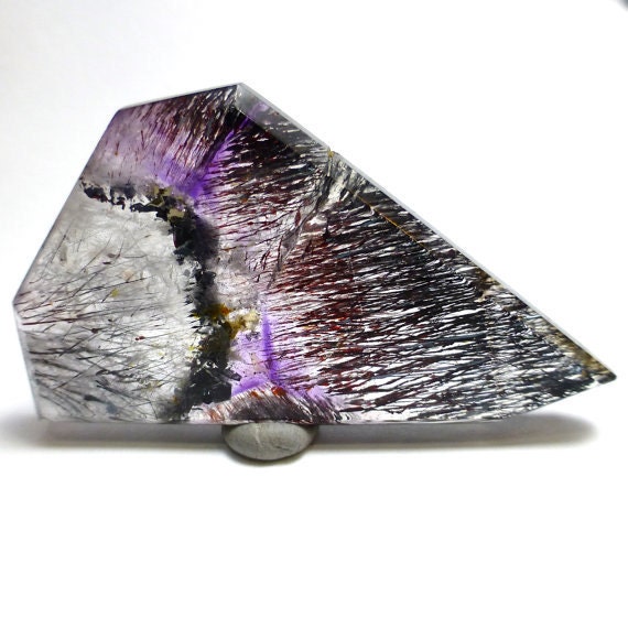 Amethyst’s purple color can range from a light lilac to a deep, intense royal purple, and from brownish to vivid. Amethyst also commonly shows what is called color zoning, which in the case of amethyst usually consists of angular zones of darker to lighter color. The presence of manganese in clear Quartz produces Amethyst, while additional amounts of iron vary the purple coloration. It is sometimes layered with white Quartz as Chevron Amethyst, found in combination with Cacoxenite, mixed with Citrine as Ametrine, or in rare cases, “rutilated” with Goethite.